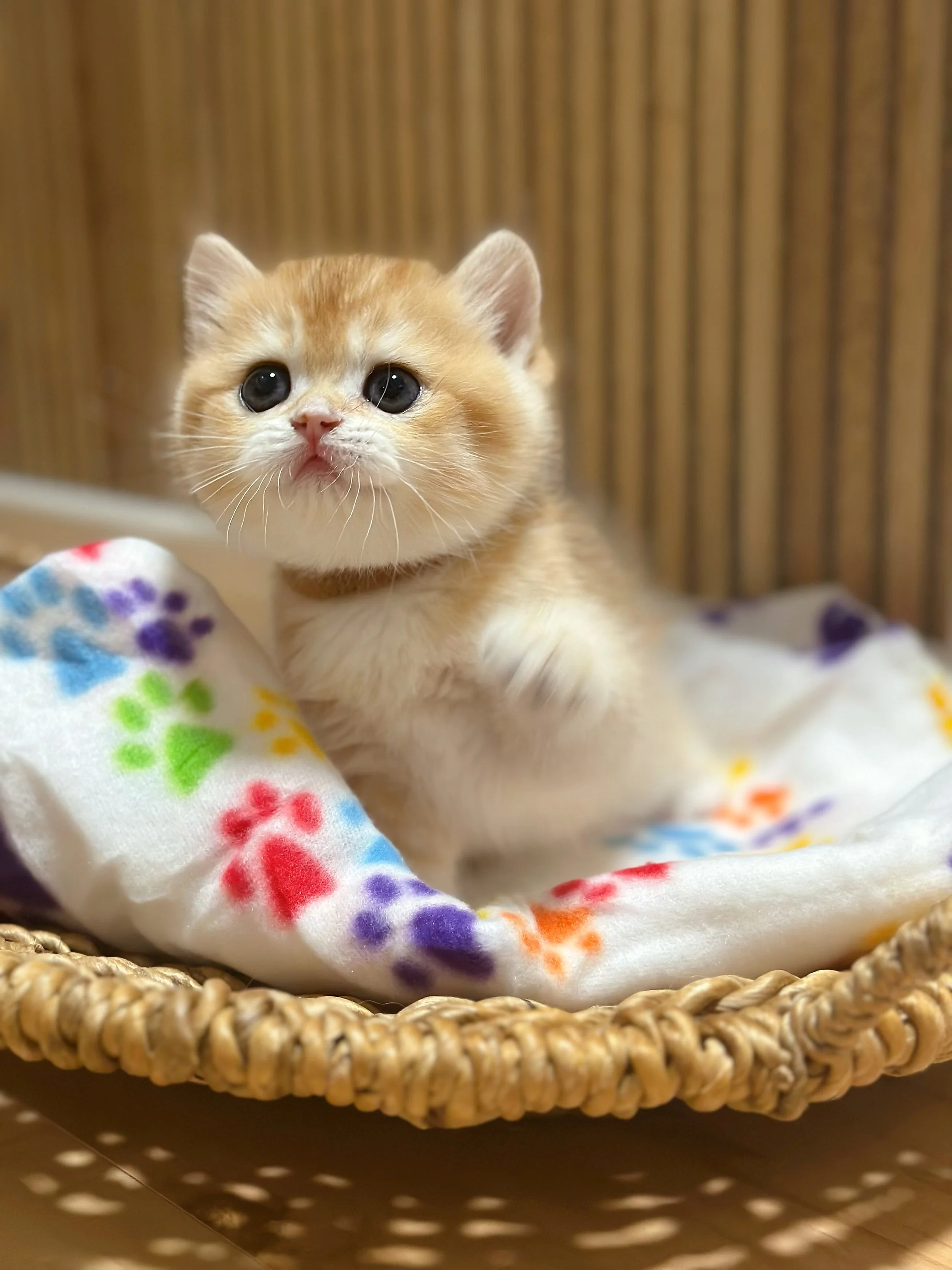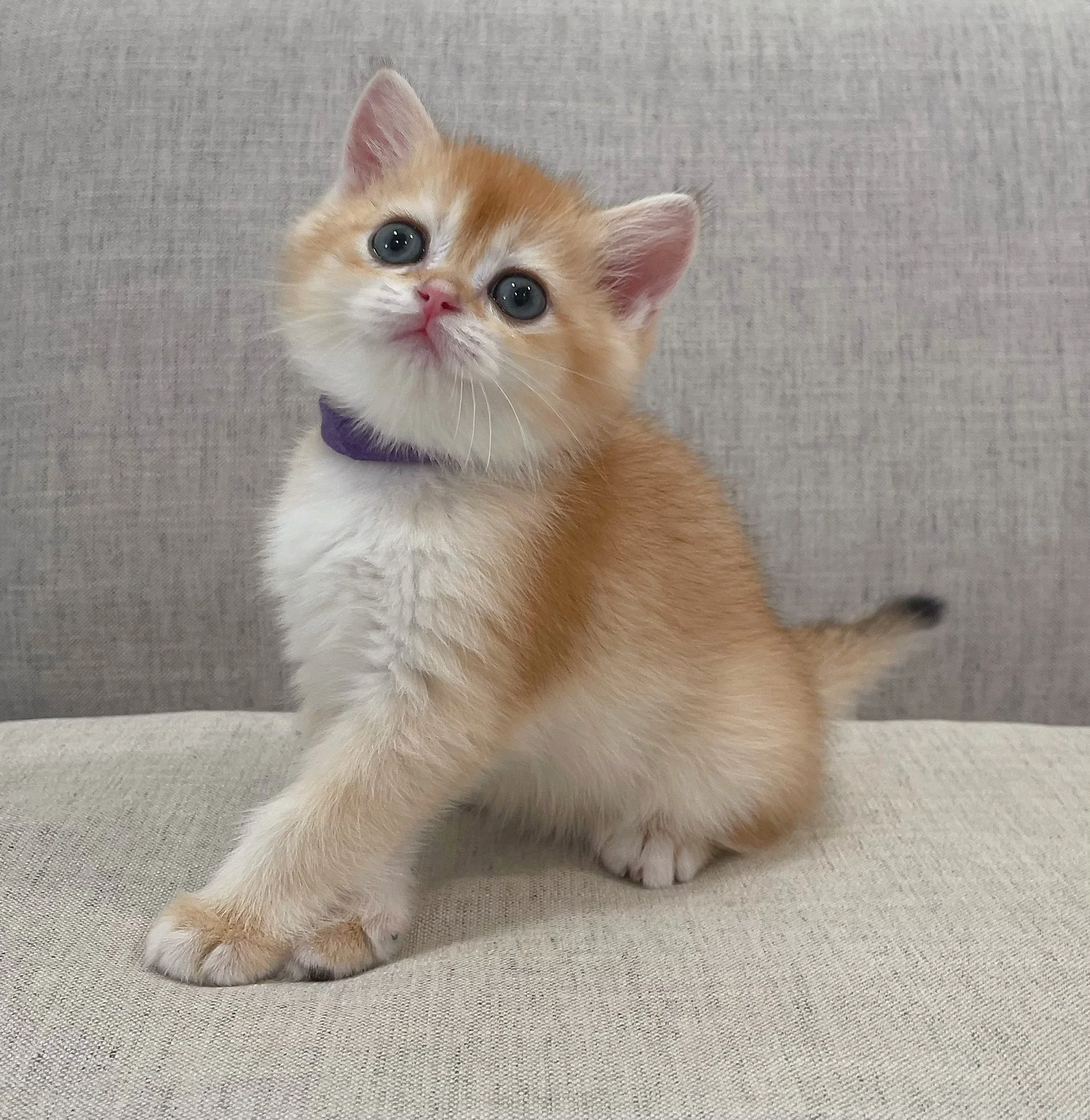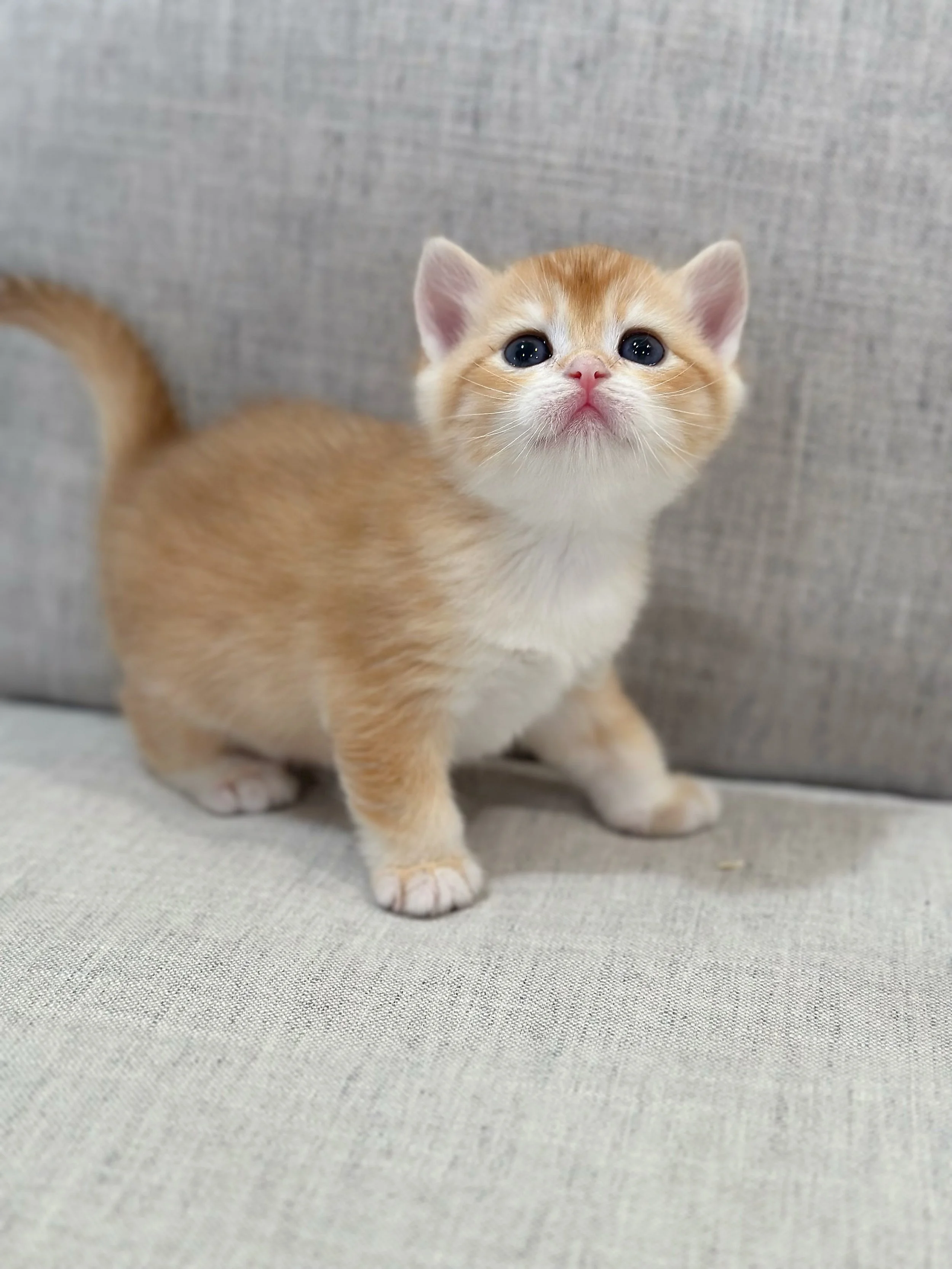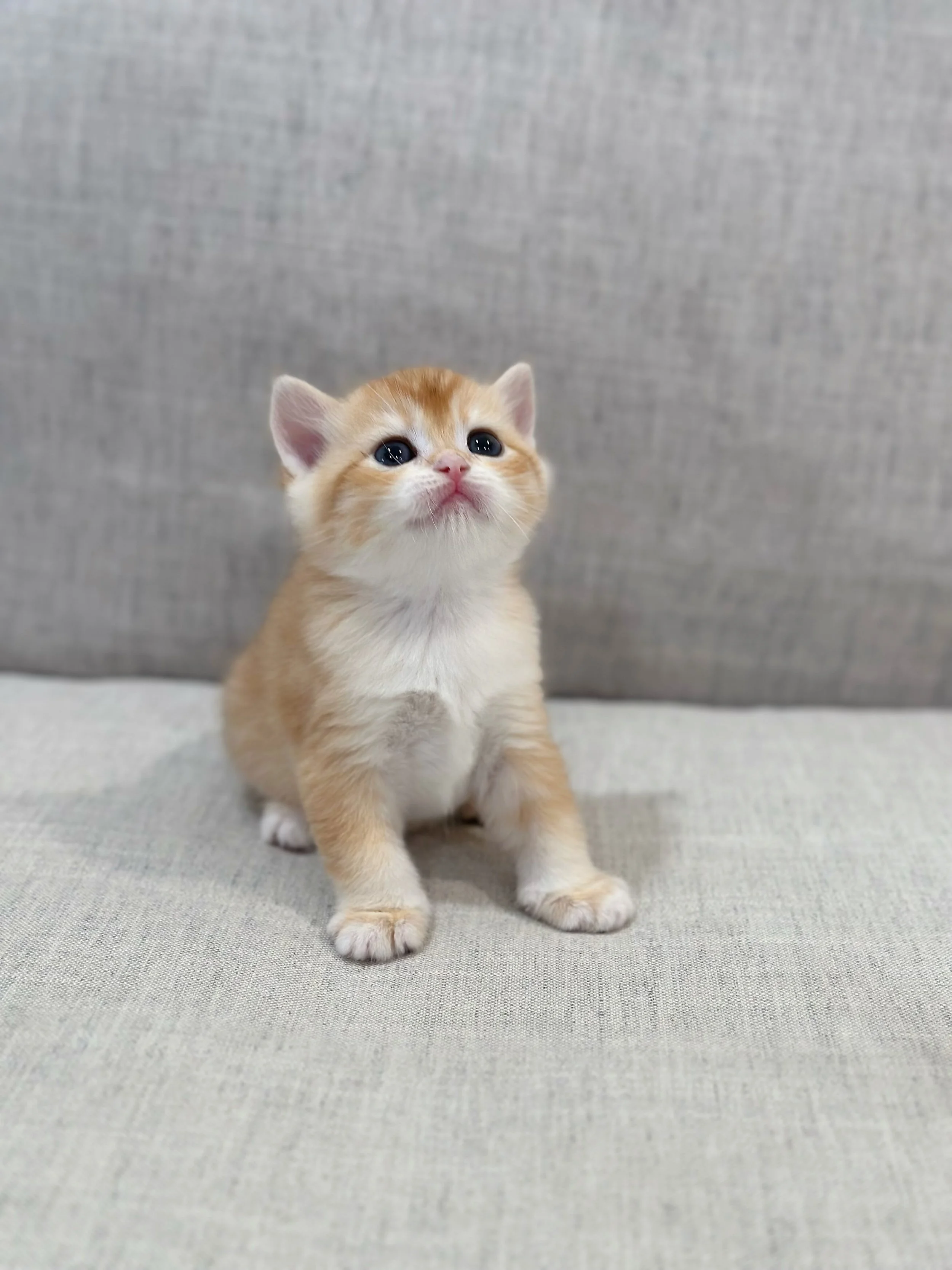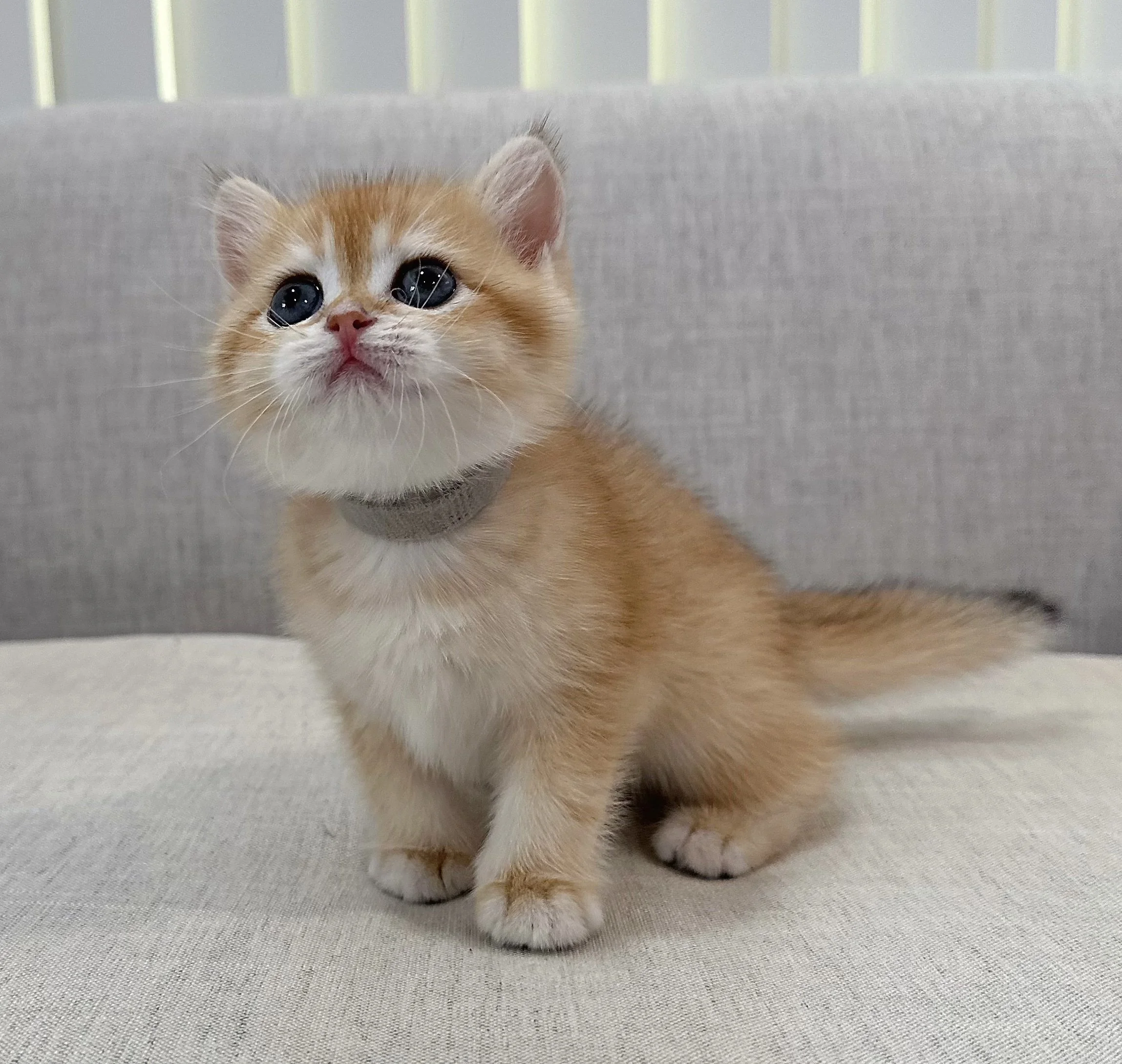 Baby boy is a Golden Point British Short Hair, with color code NY1233. This little guy is incredibly fun and playful! He loves all kinds of toys and tunnels, and his round, snow-white body is simply adorable. As he grows, he’ll develop a striking golden coloring on his back, nose, ears, and tail. He adores belly rubs and is the most vocal in the litter, meowing for hugs when he wakes up from his naps and for food when he’s hungry. His interactive nature makes him a delightful companion!
