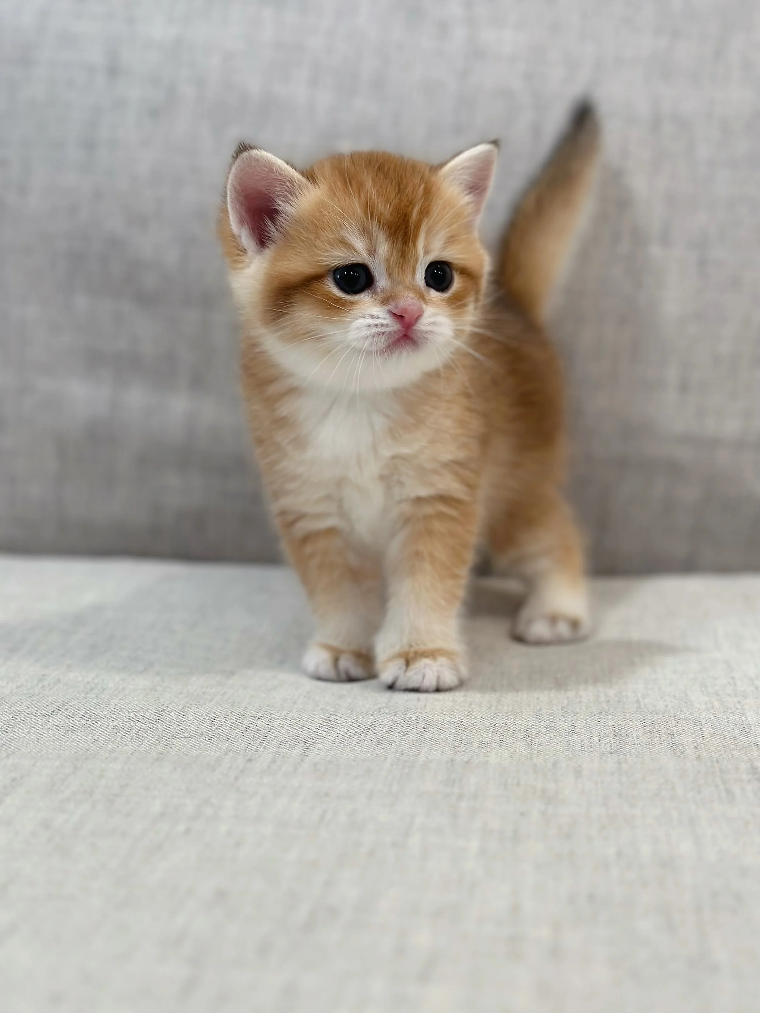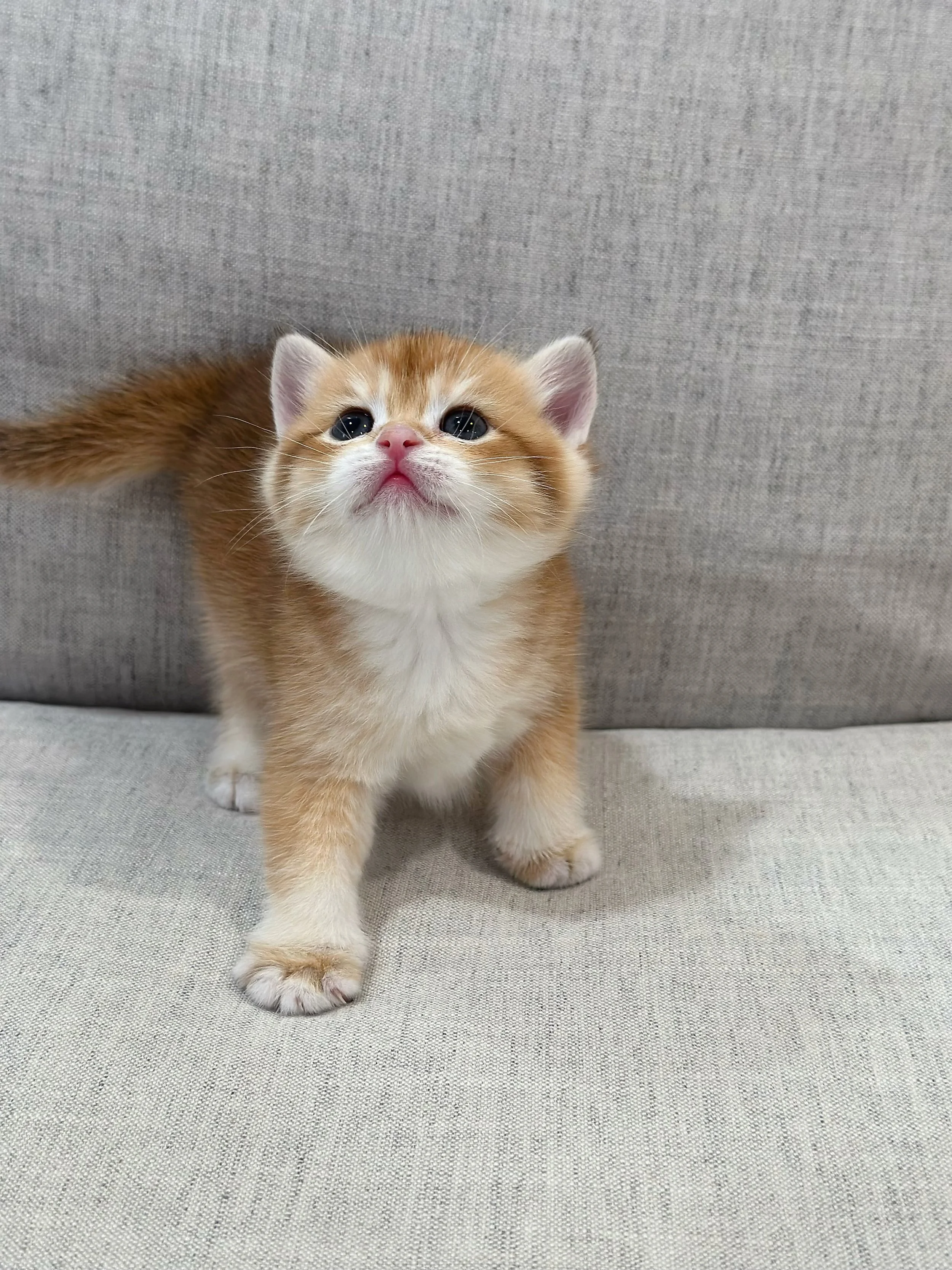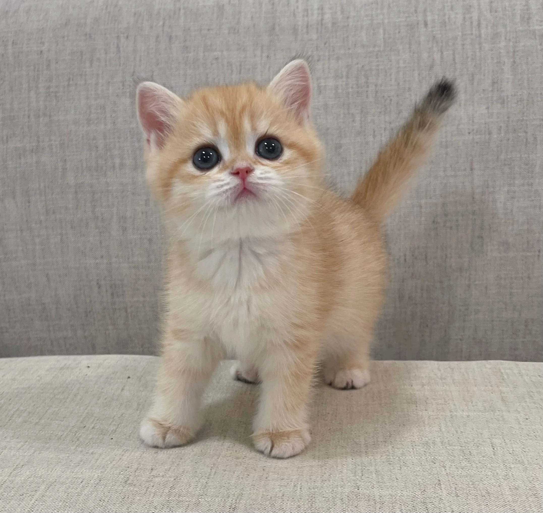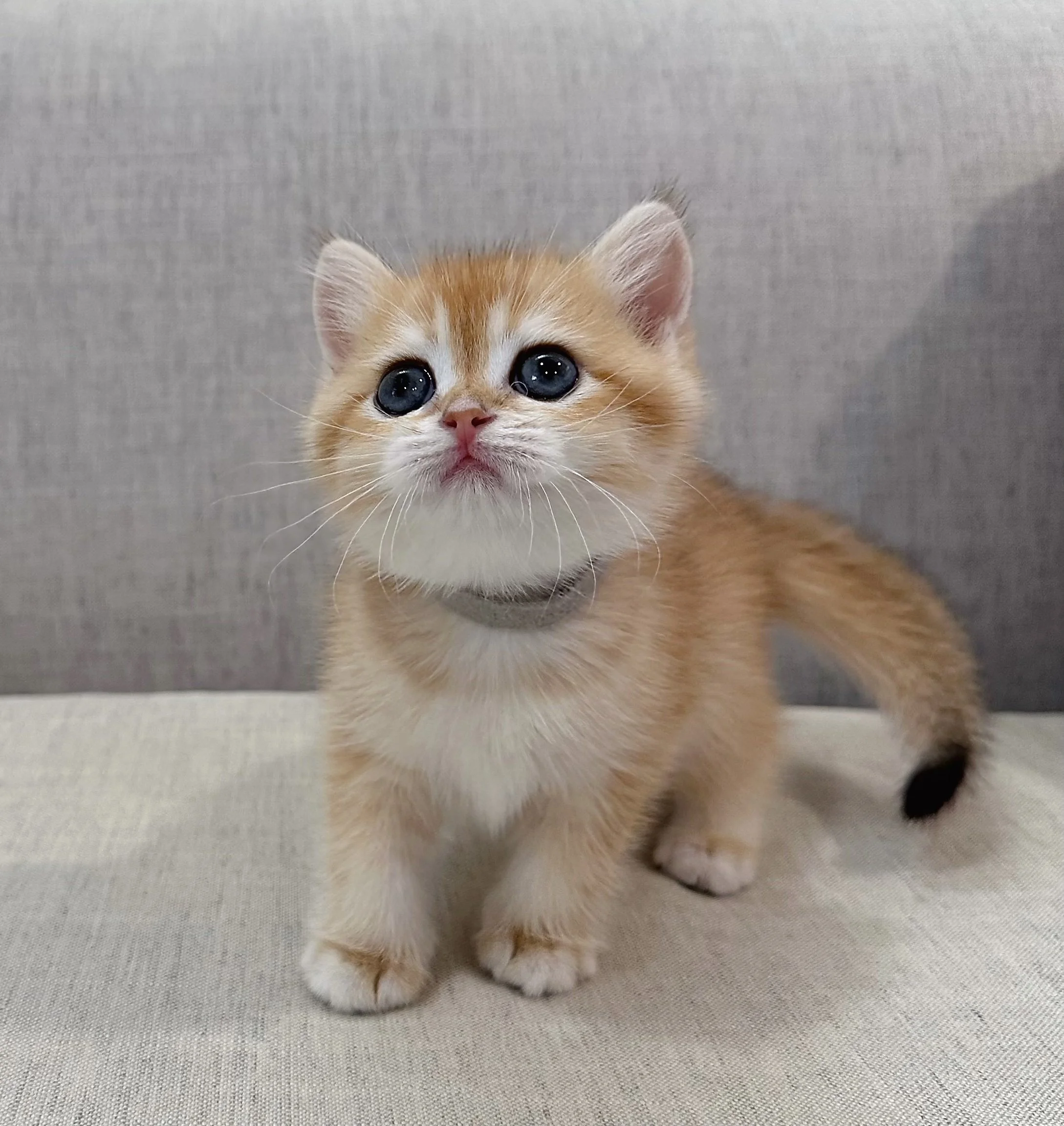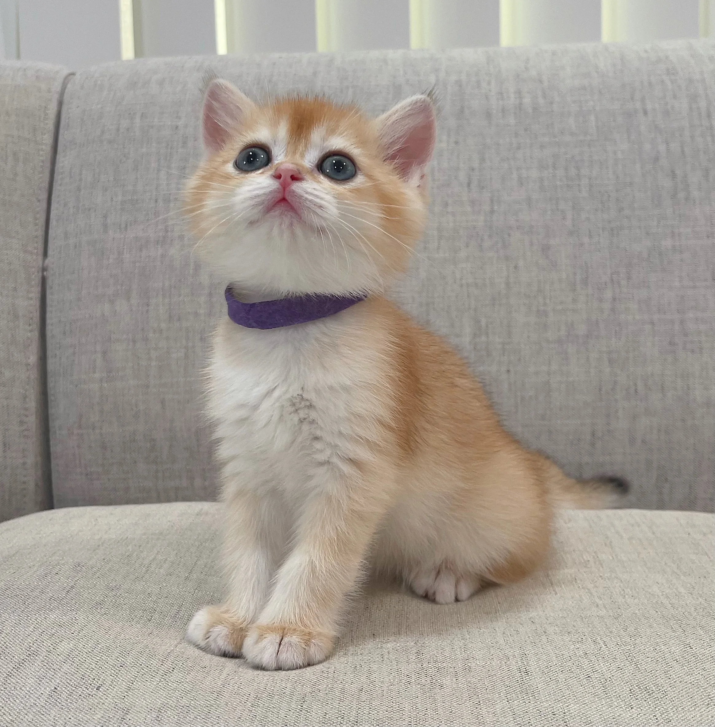 Baby boy is a Golden Point British Short Hair, with color code NY1233. This little guy is incredibly fun and playful! He loves all kinds of toys and tunnels, and his round, snow-white body is simply adorable. As he grows, he’ll develop a striking golden coloring on his back, nose, ears, and tail. He adores belly rubs and is the most vocal in the litter, meowing for hugs when he wakes up from his naps and for food when he’s hungry. His interactive nature makes him a delightful companion!