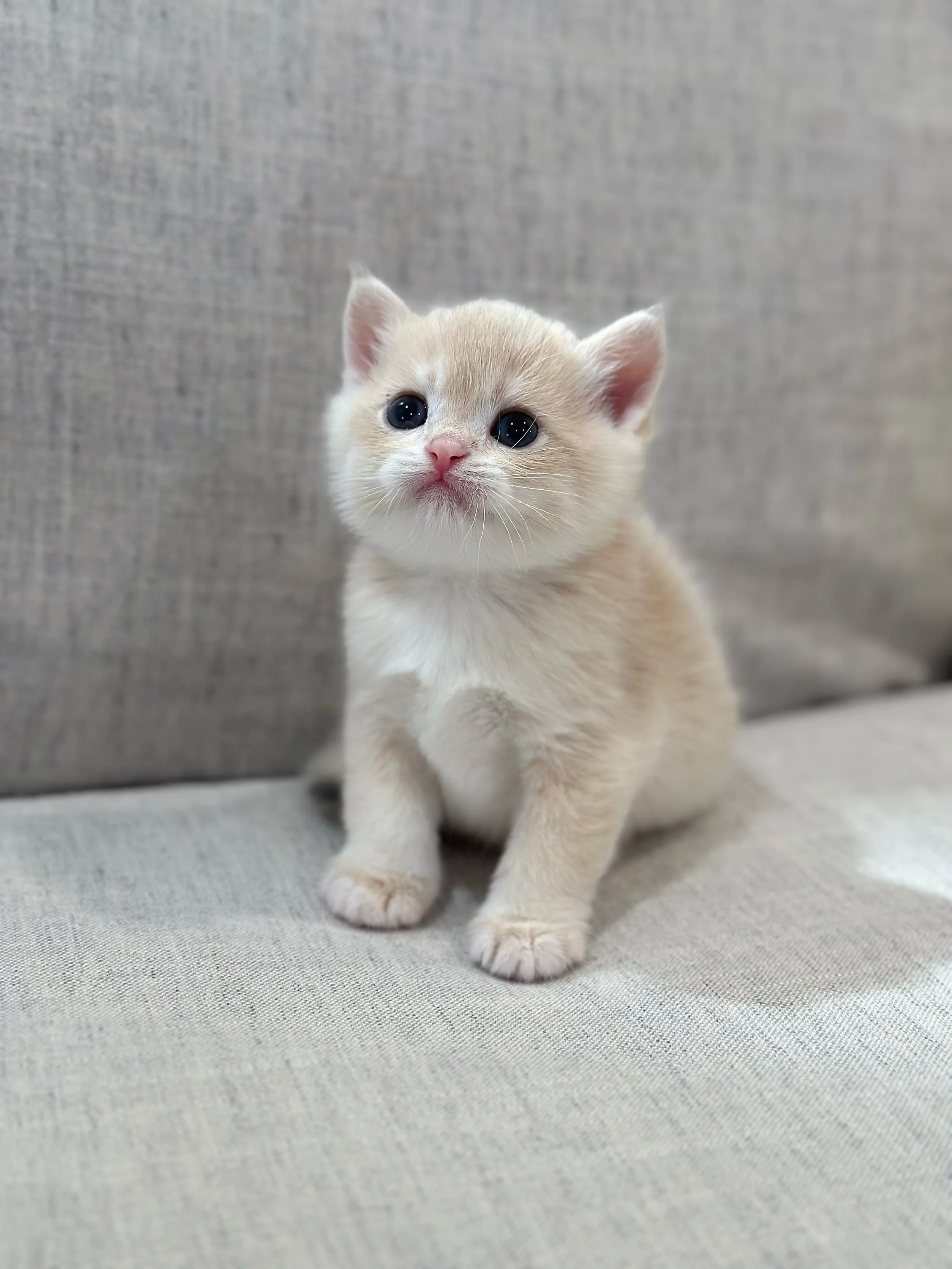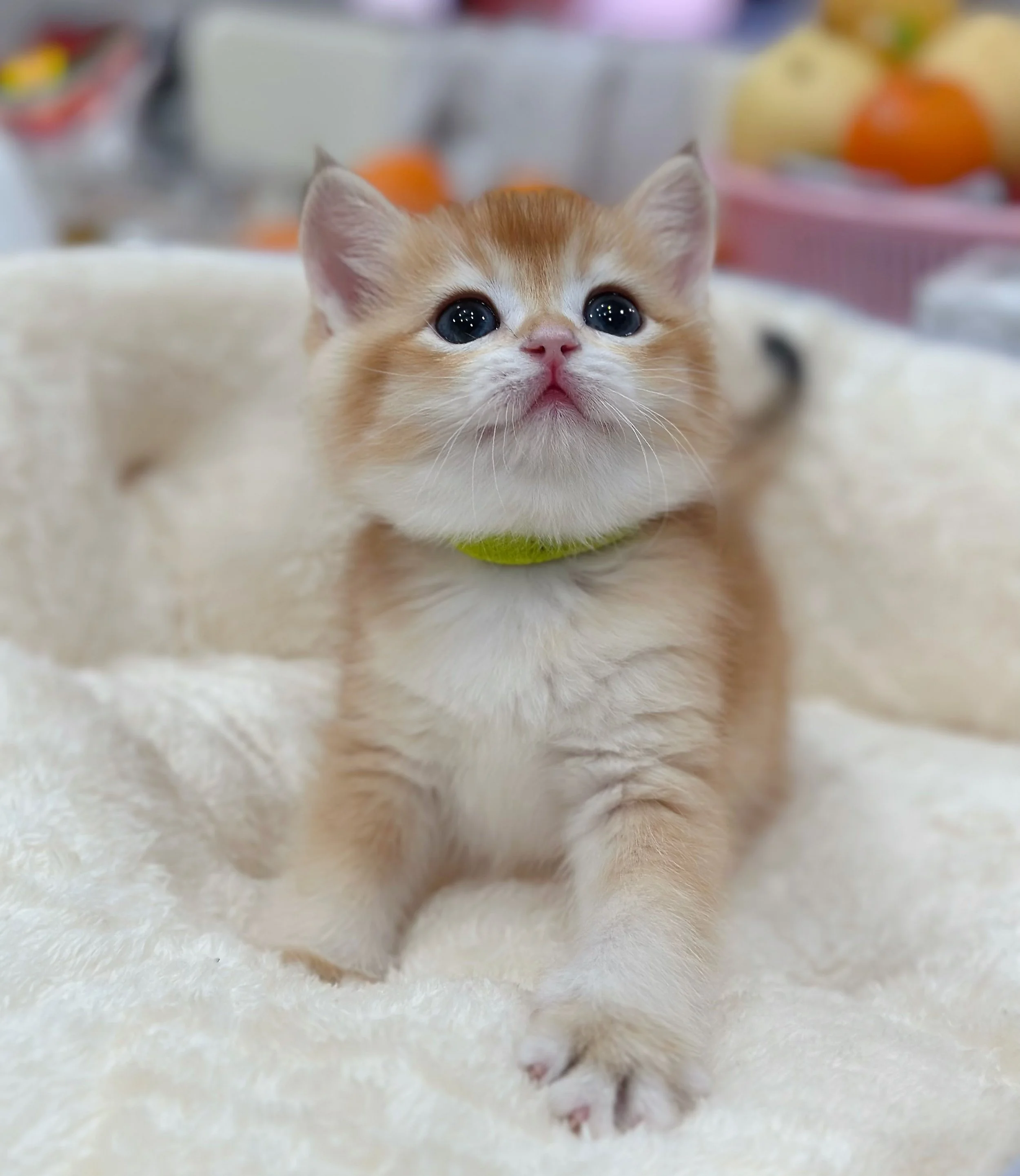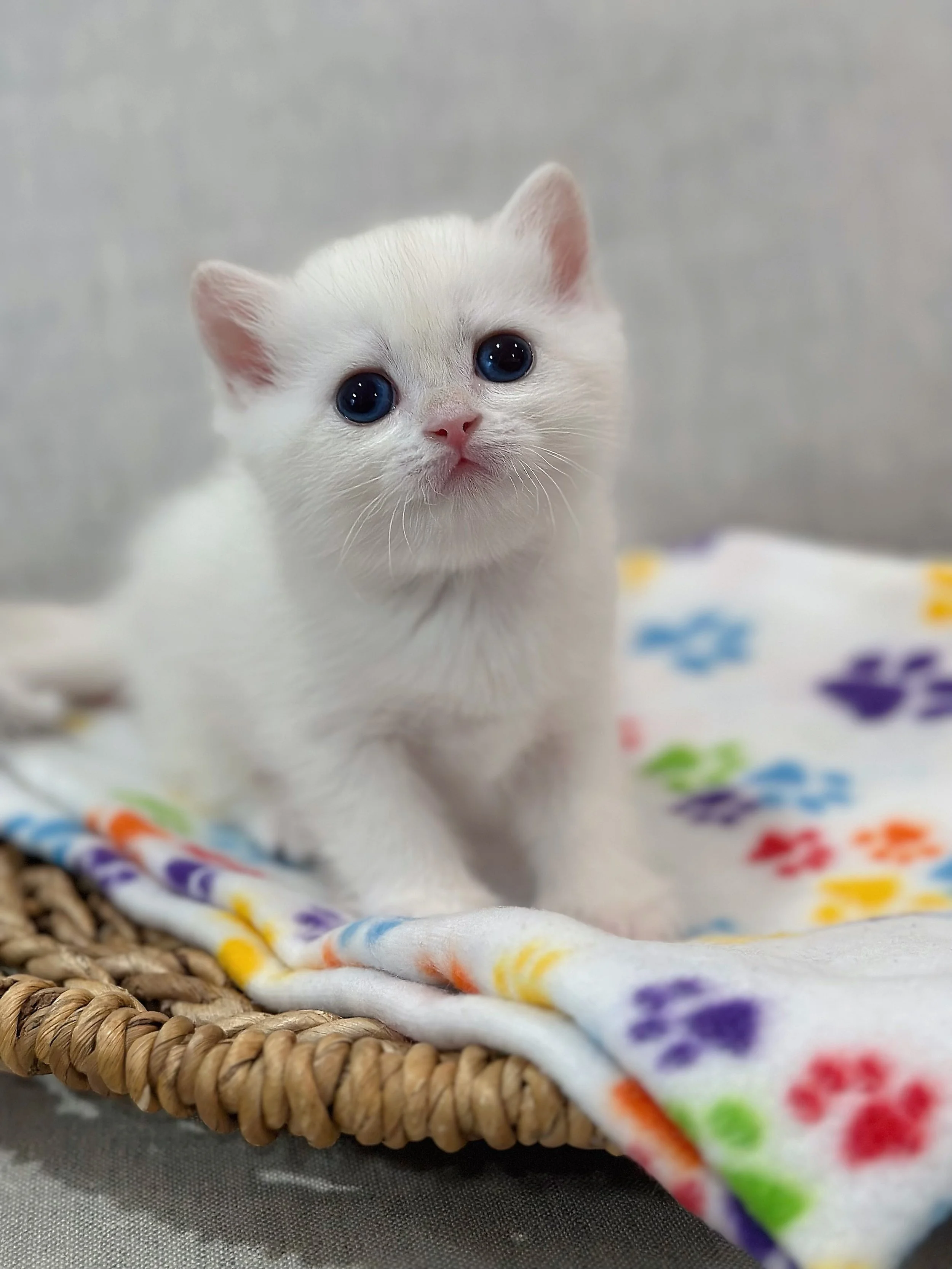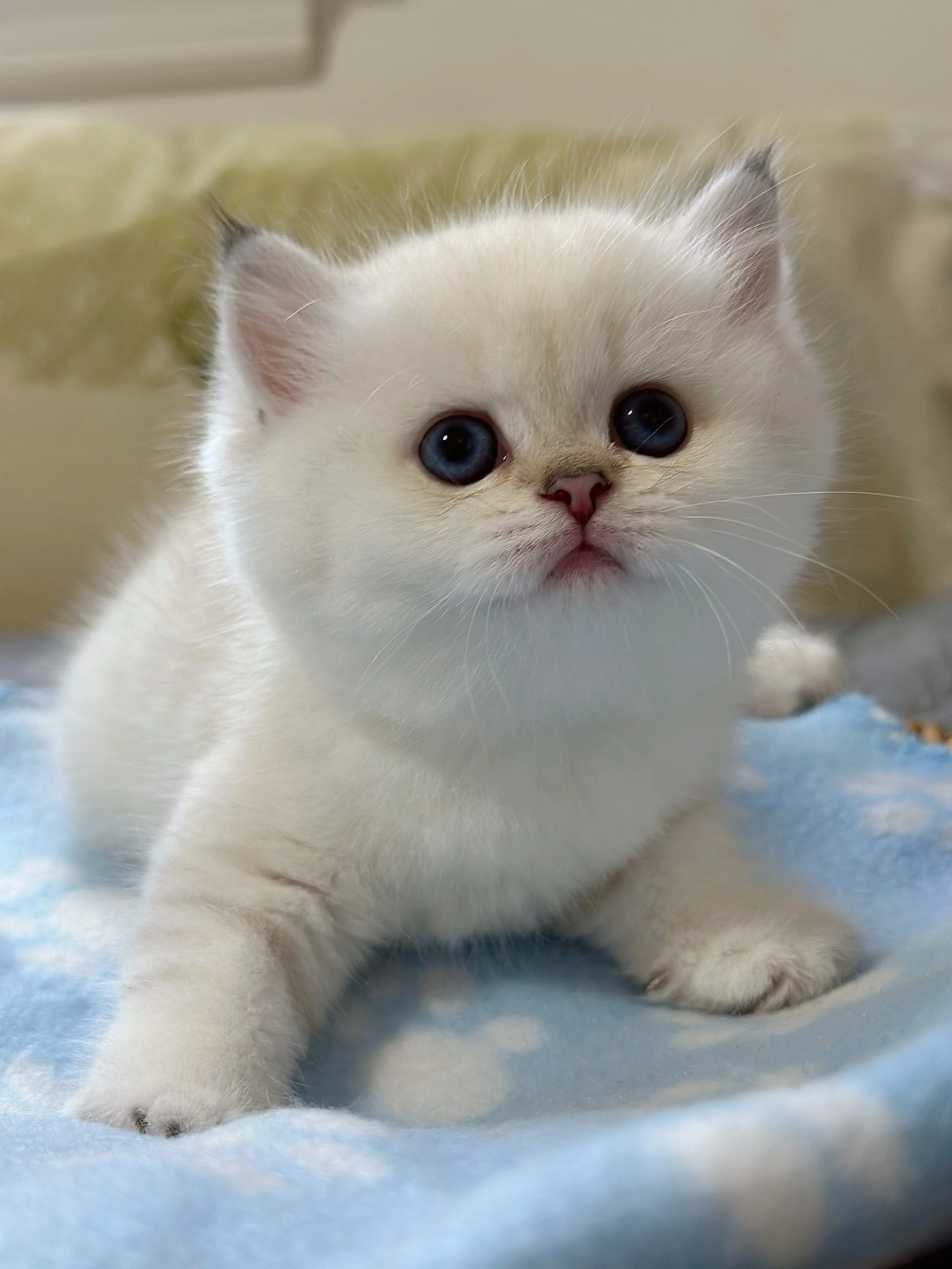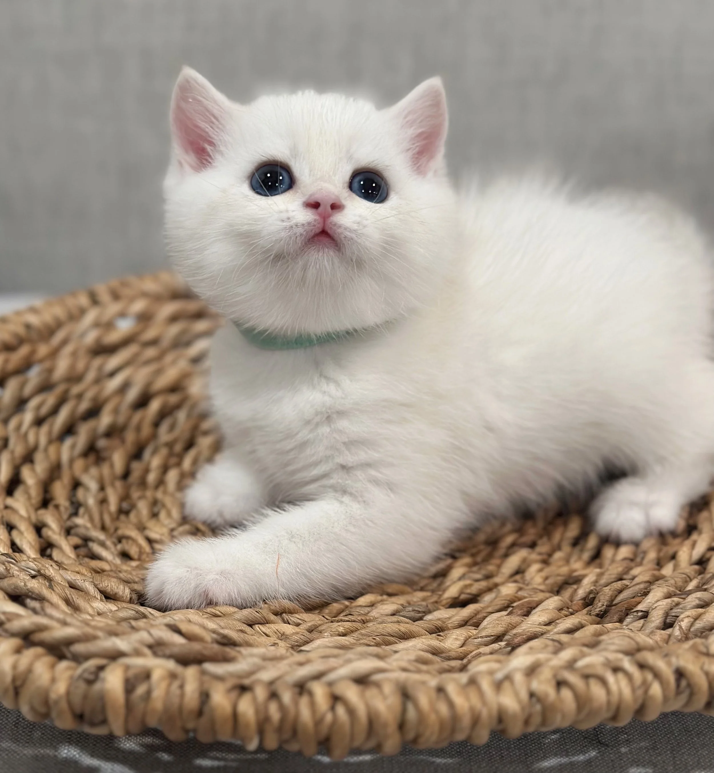 Baby boy is a Golden Point British Short Hair, with color code NY1233. This little guy is incredibly fun and playful! He loves all kinds of toys and tunnels, and his round, snow-white body is simply adorable. As he grows, he’ll develop a striking golden coloring on his back, nose, ears, and tail. He adores belly rubs and is the most vocal in the litter, meowing for hugs when he wakes up from his naps and for food when he’s hungry. His interactive nature makes him a delightful companion!