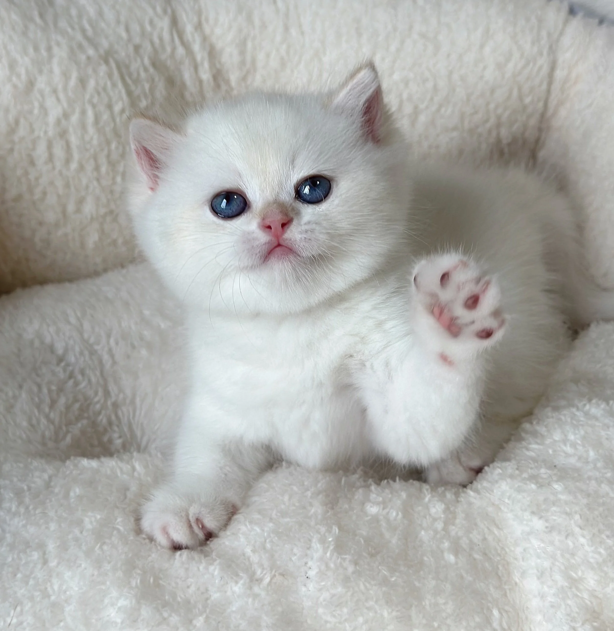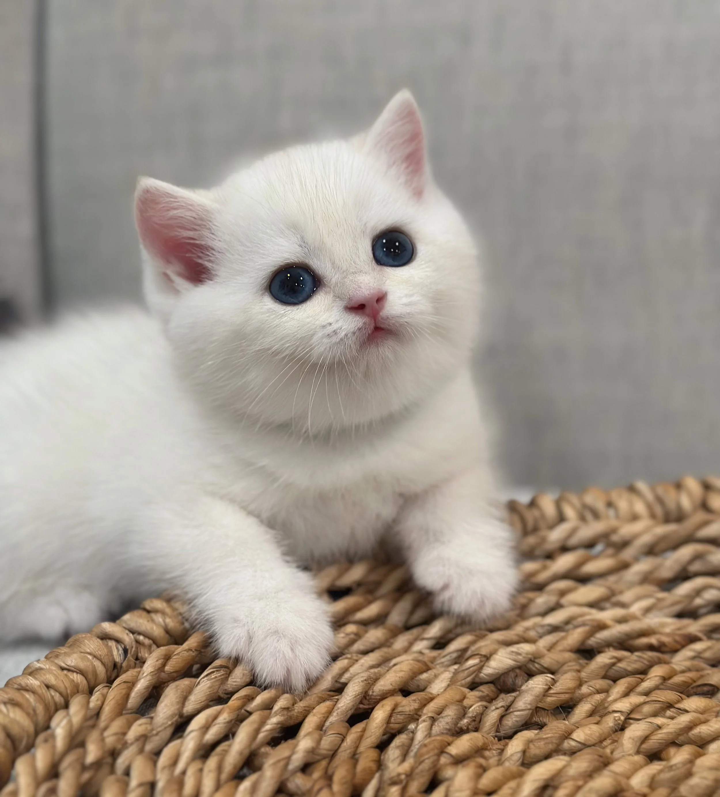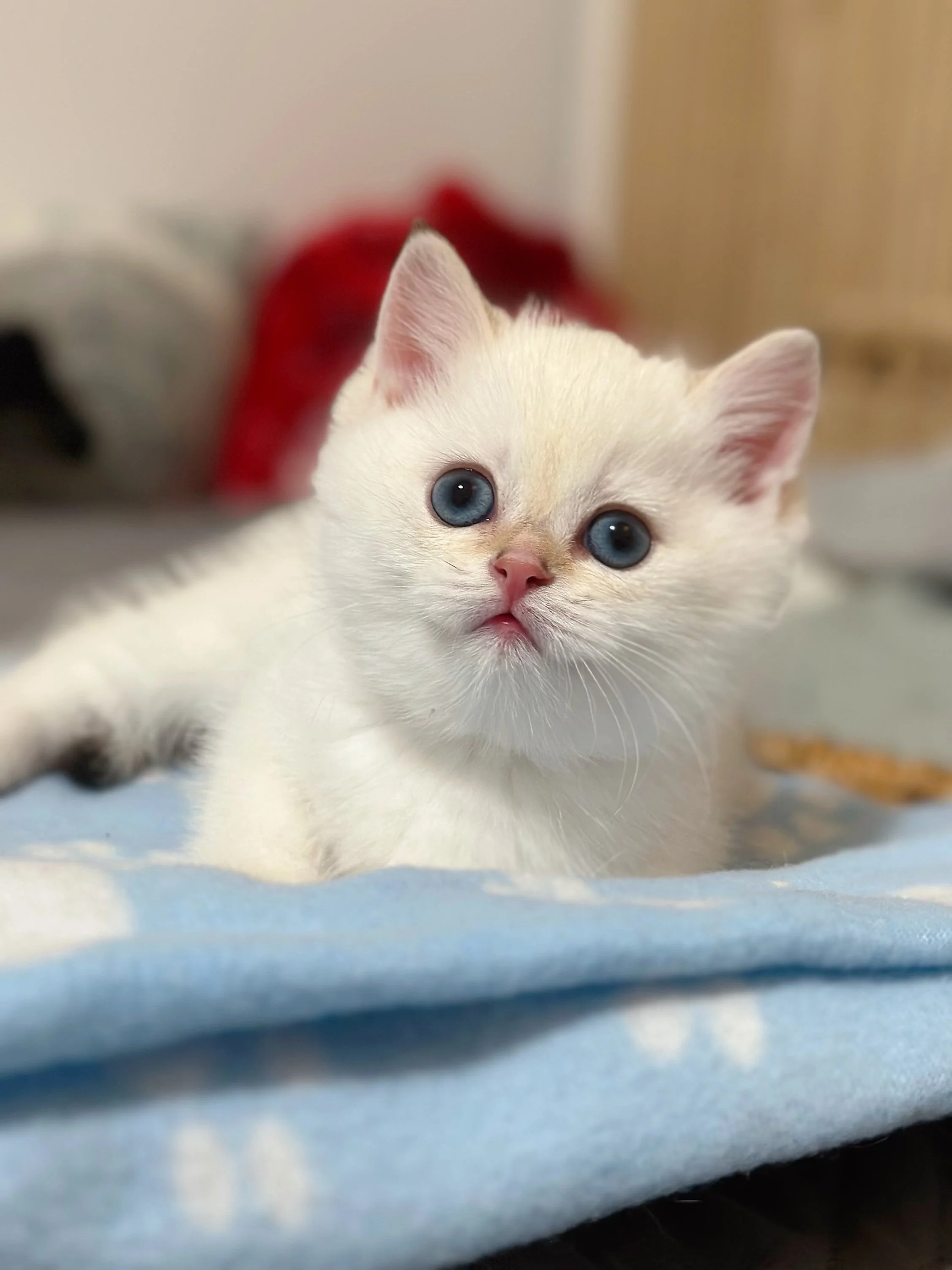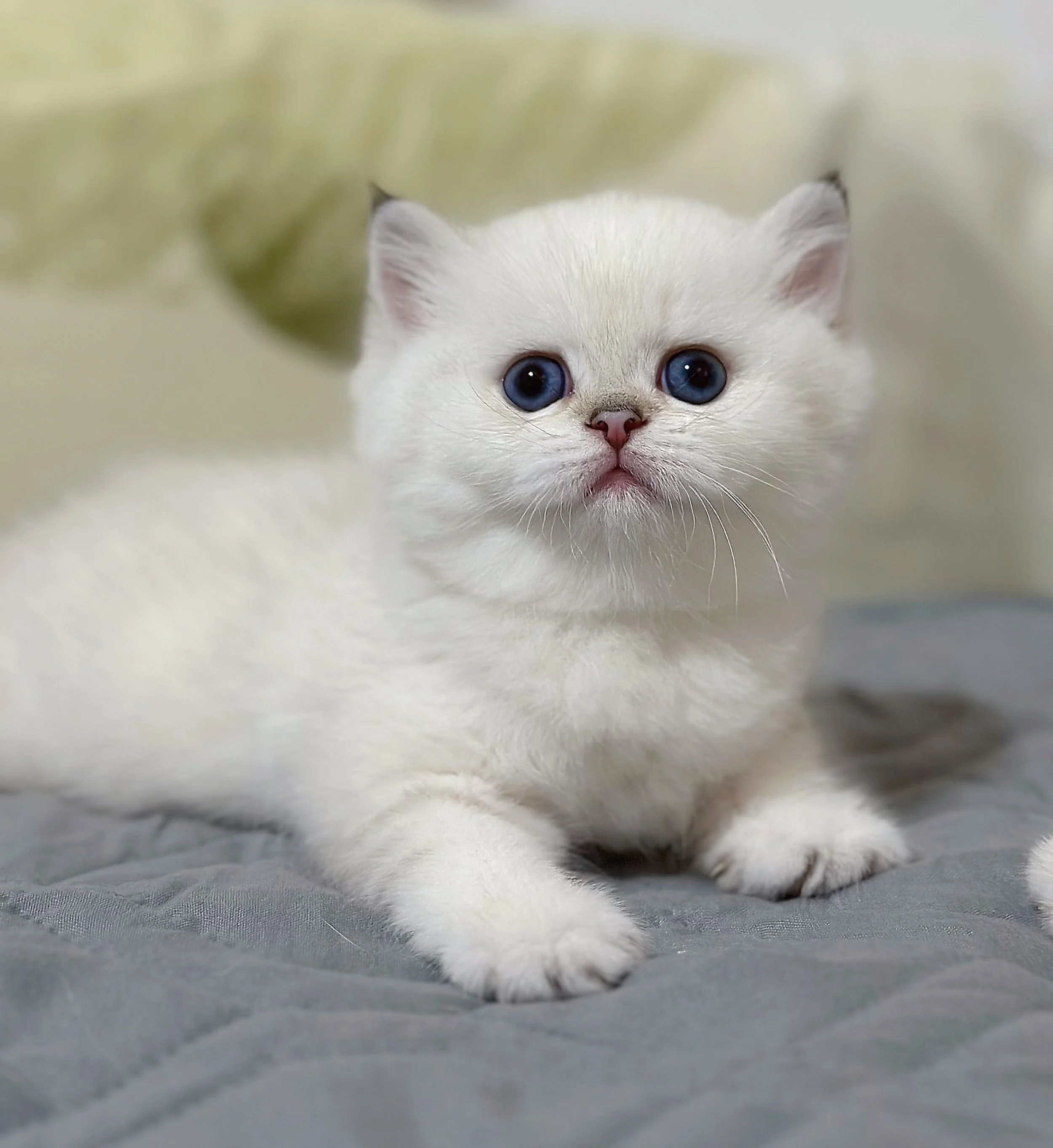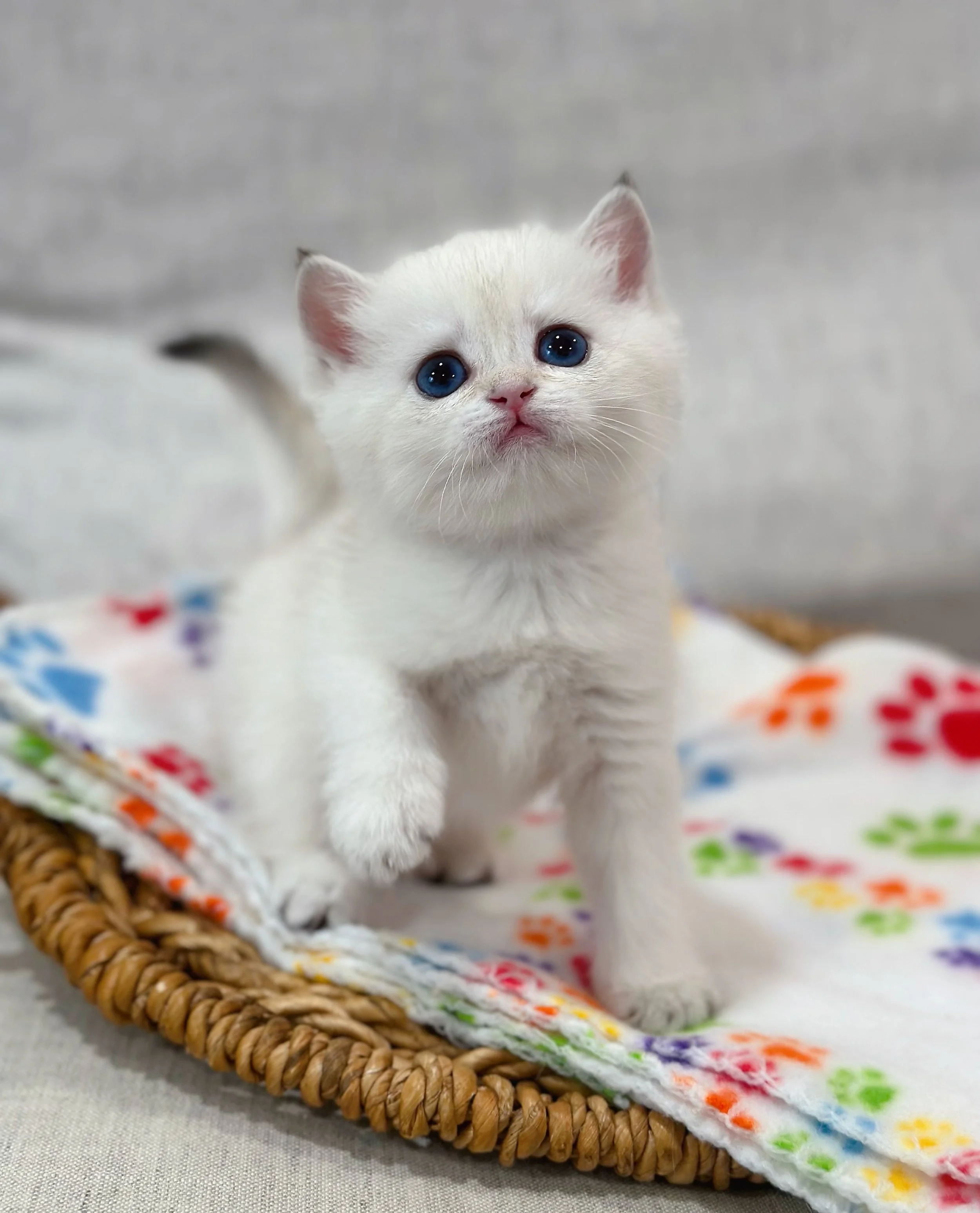 Baby boy is a Golden Point British Short Hair, with color code NY1233. This little guy is incredibly fun and playful! He loves all kinds of toys and tunnels, and his round, snow-white body is simply adorable. As he grows, he’ll develop a striking golden coloring on his back, nose, ears, and tail. He adores belly rubs and is the most vocal in the litter, meowing for hugs when he wakes up from his naps and for food when he’s hungry. His interactive nature makes him a delightful companion!