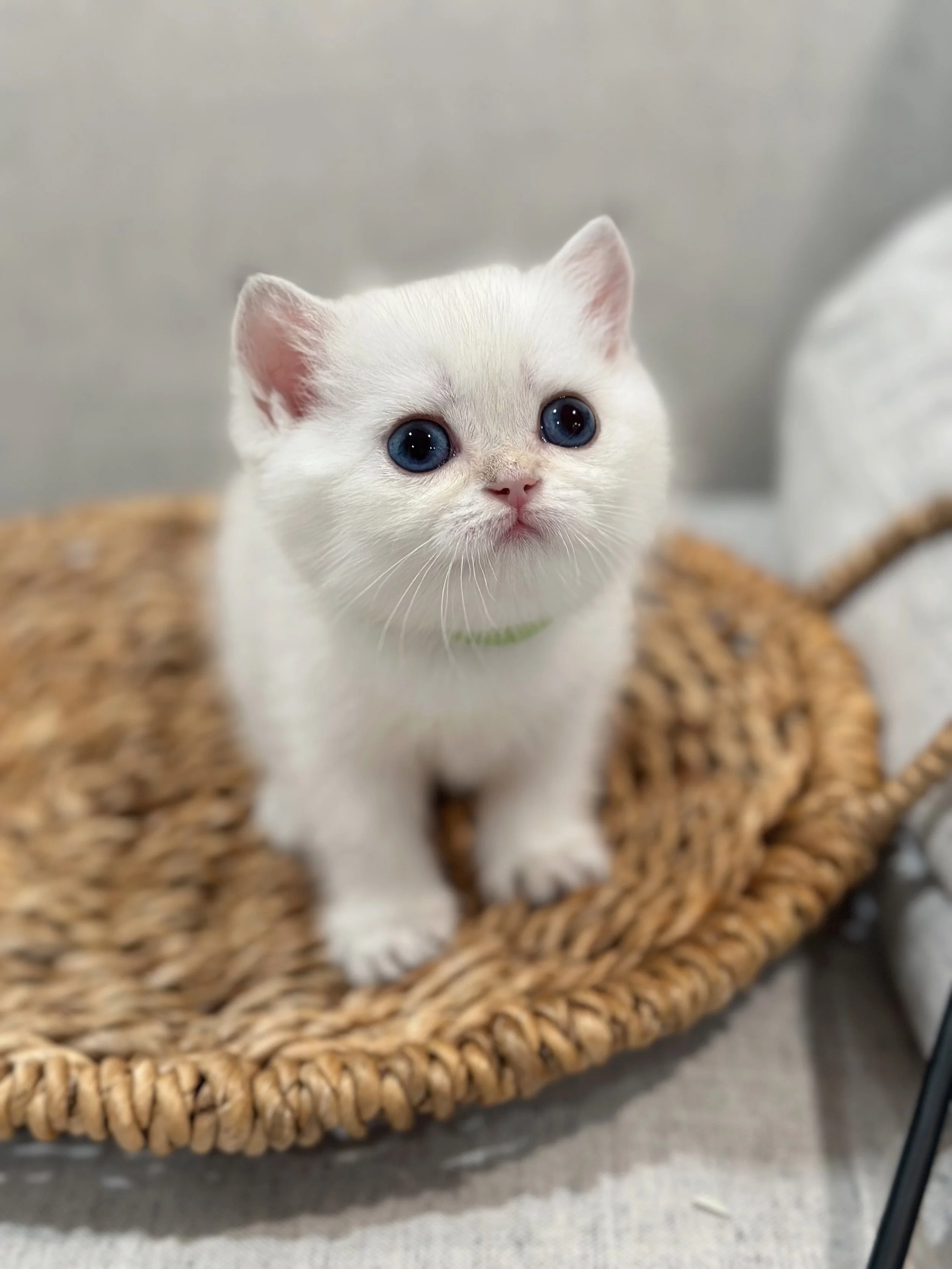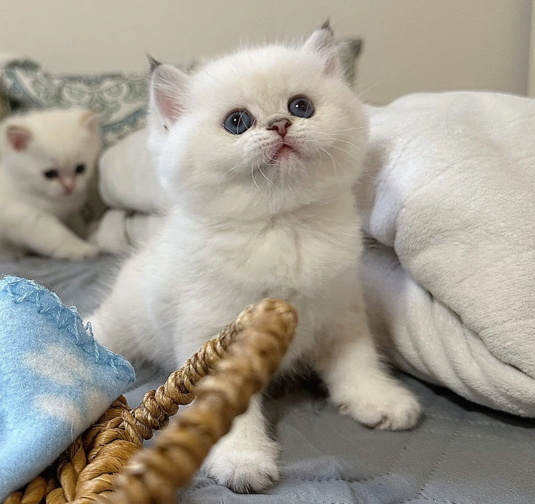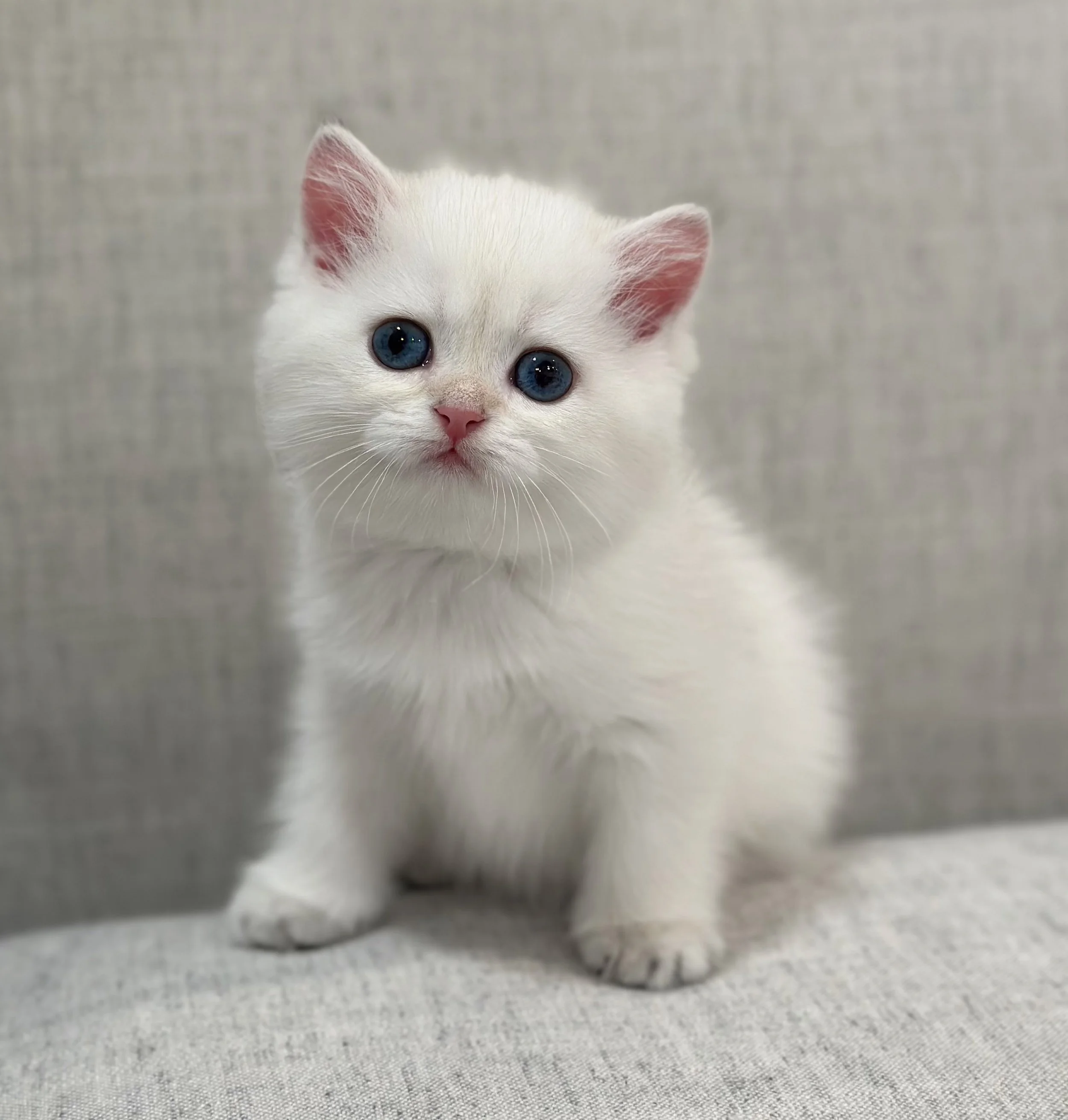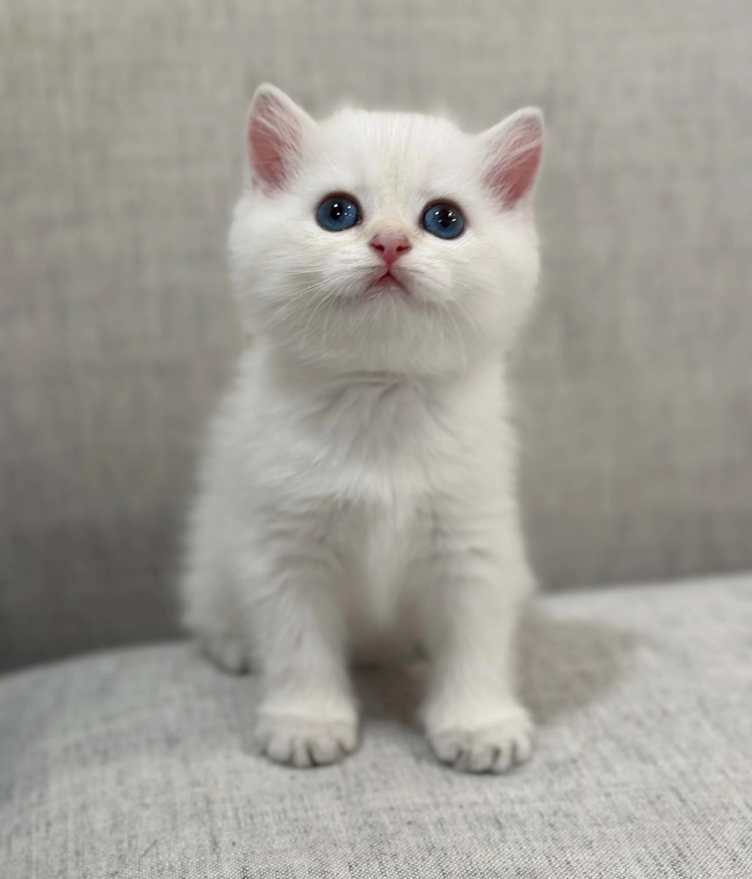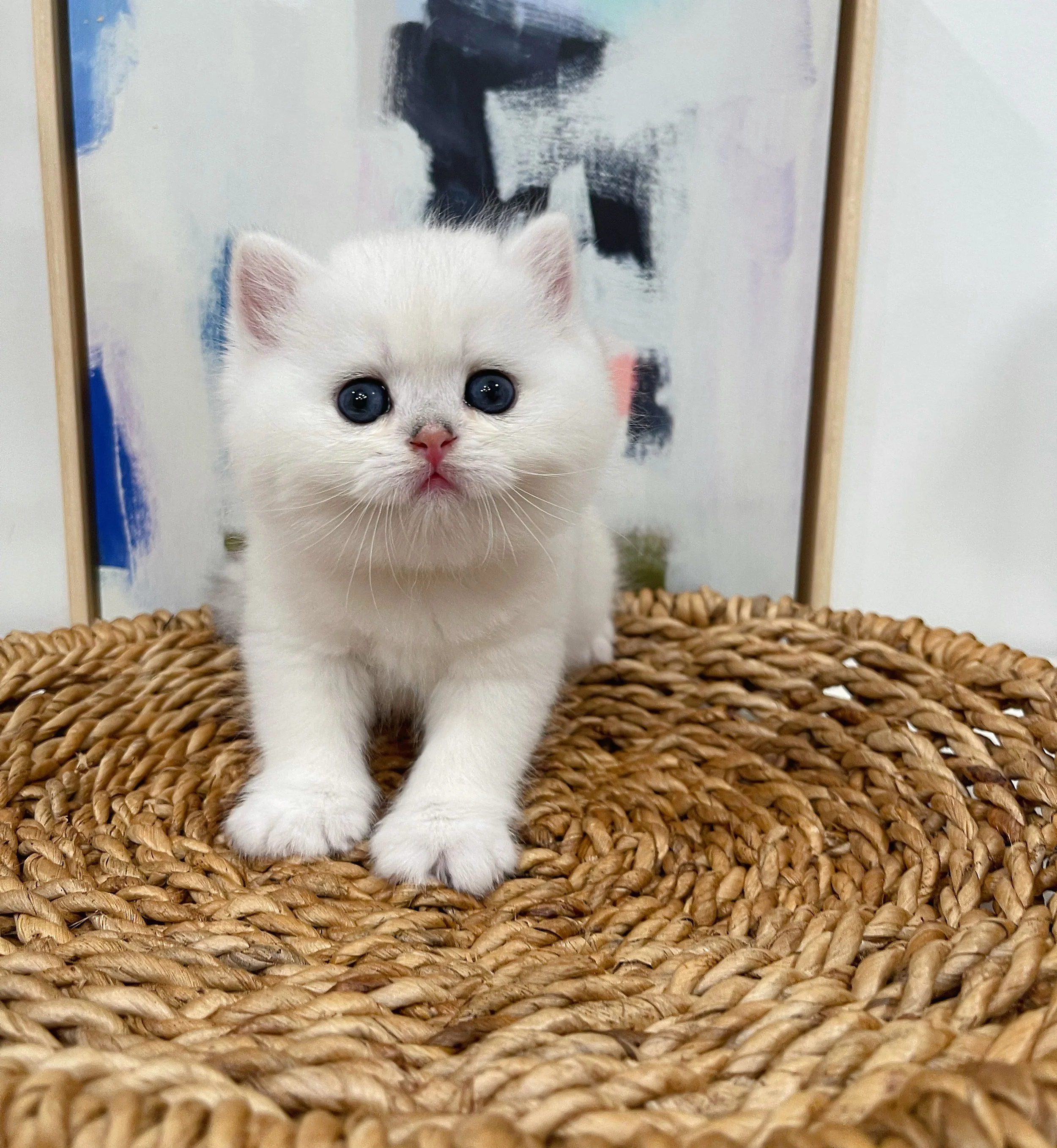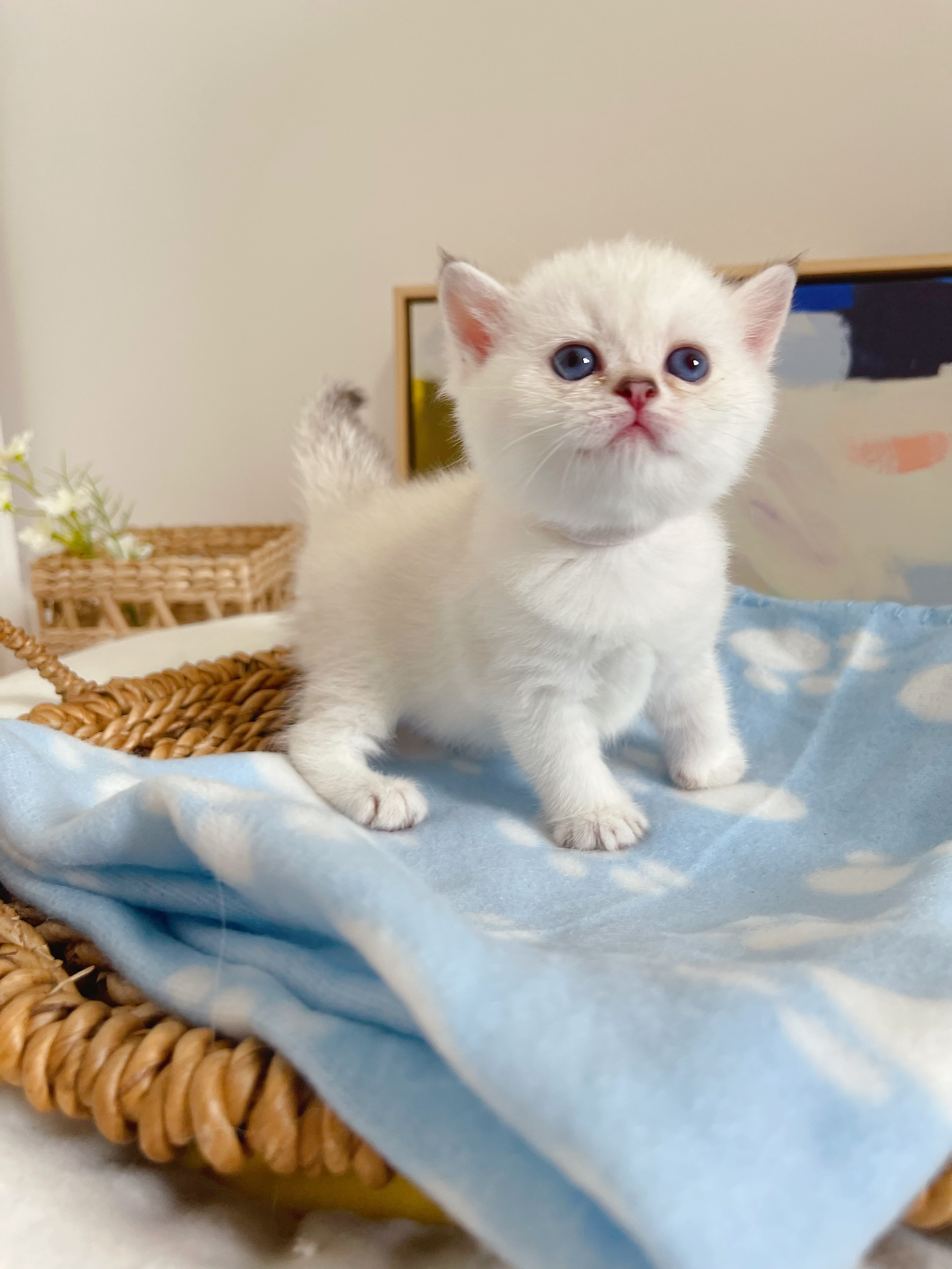 Baby boy is a Golden Point British Short Hair, with color code NY1233. This little guy is incredibly fun and playful! He loves all kinds of toys and tunnels, and his round, snow-white body is simply adorable. As he grows, he’ll develop a striking golden coloring on his back, nose, ears, and tail. He adores belly rubs and is the most vocal in the litter, meowing for hugs when he wakes up from his naps and for food when he’s hungry. His interactive nature makes him a delightful companion!