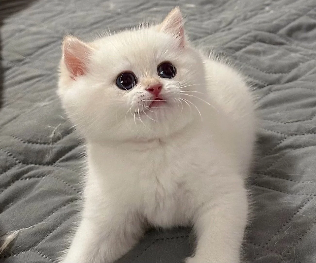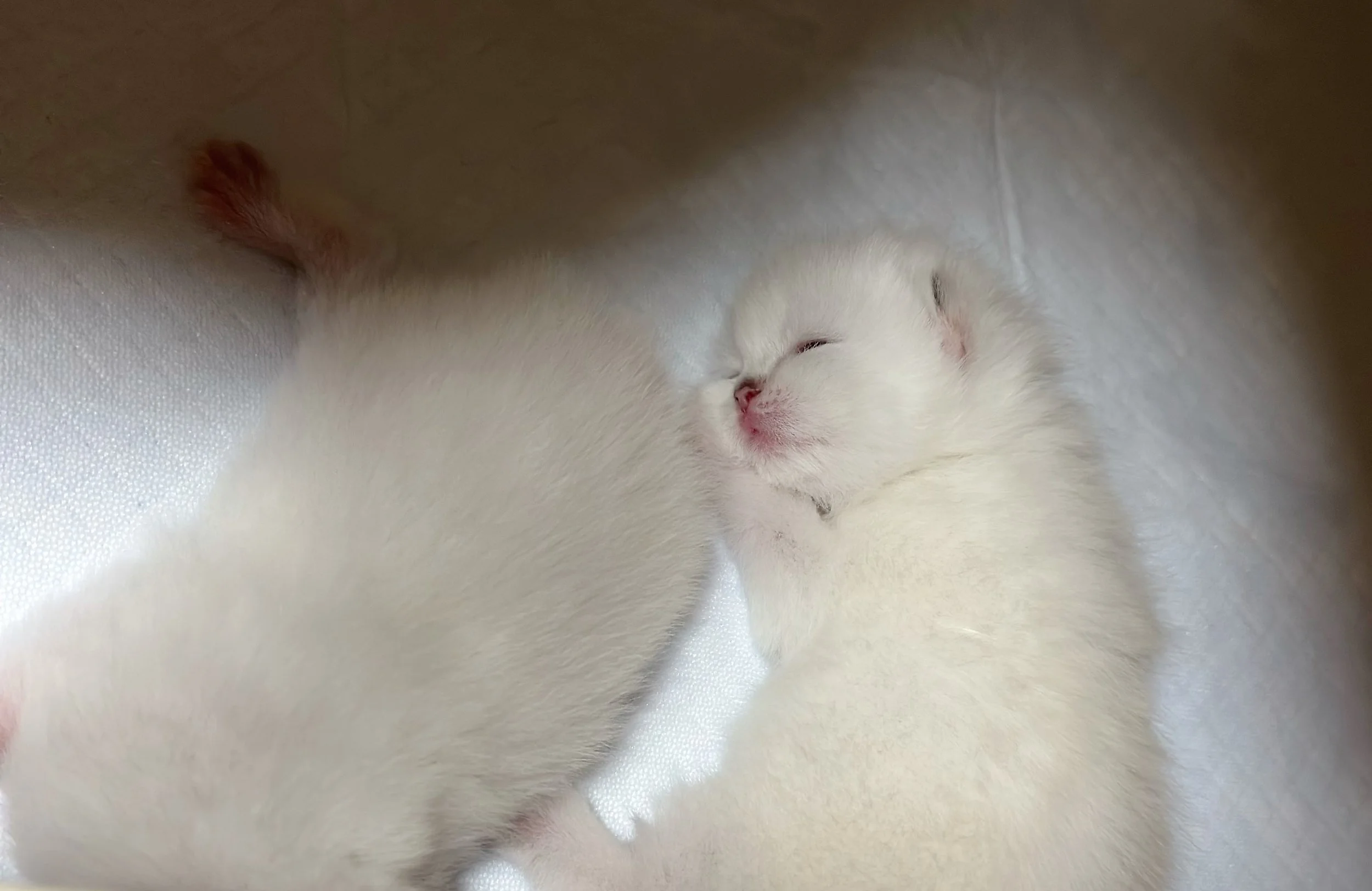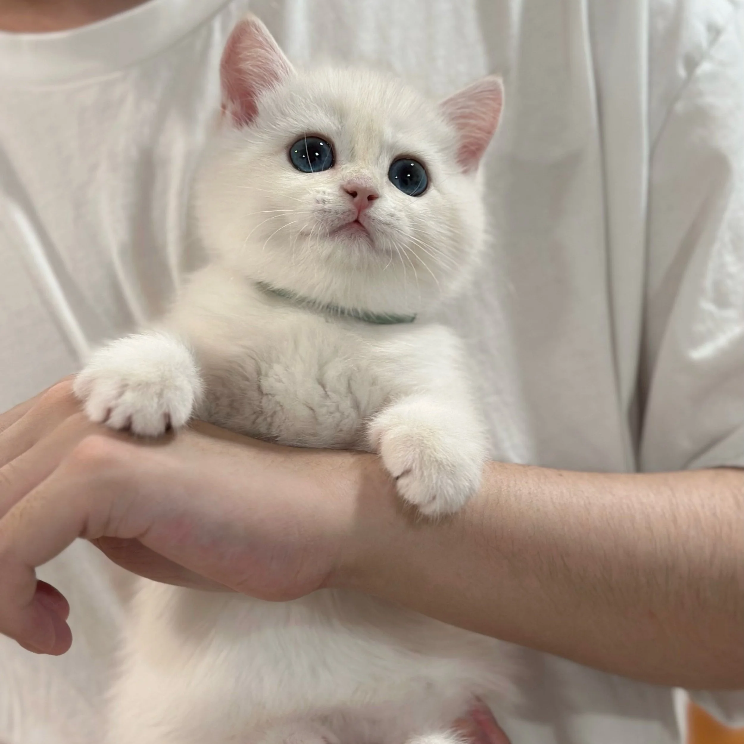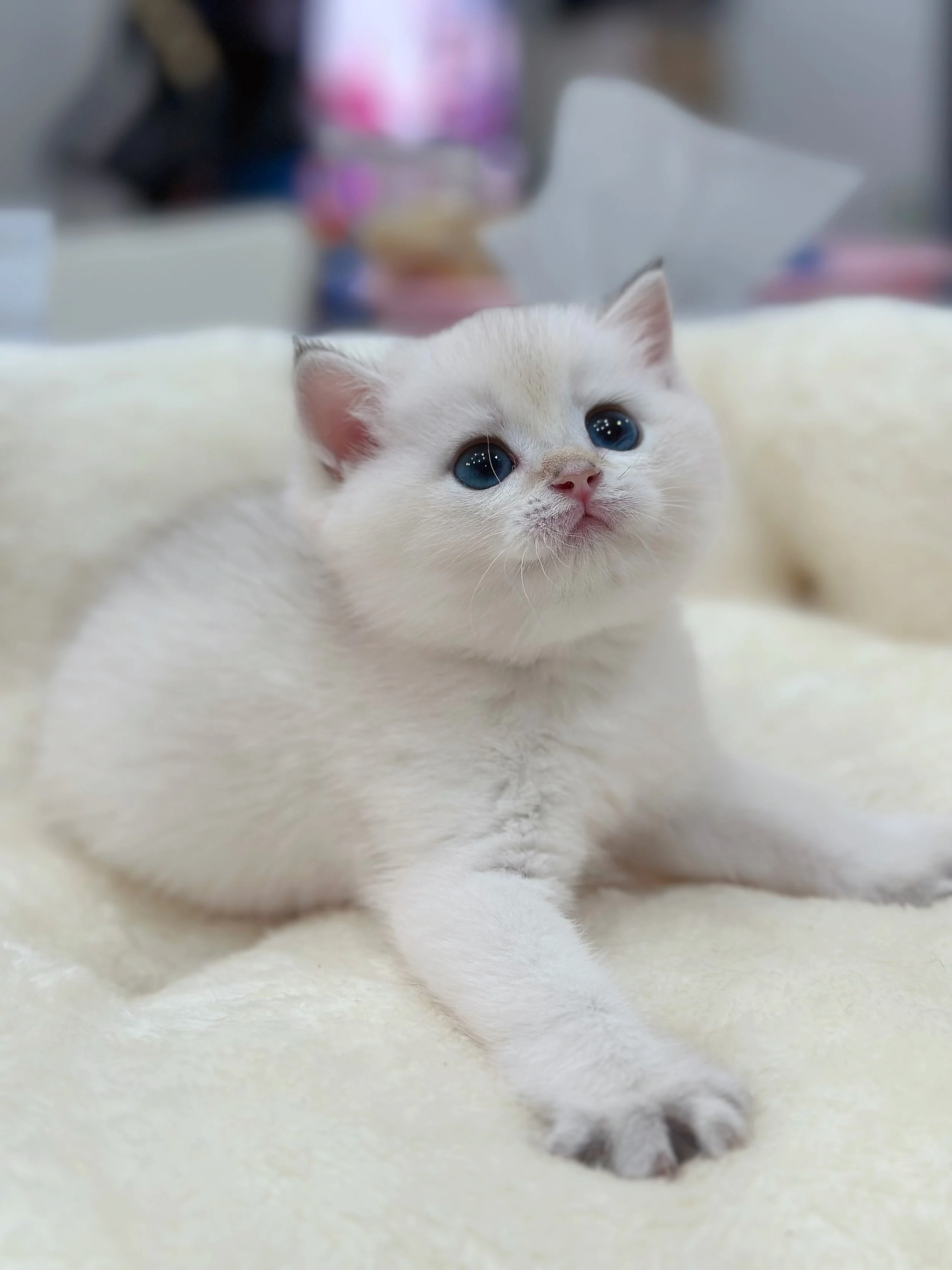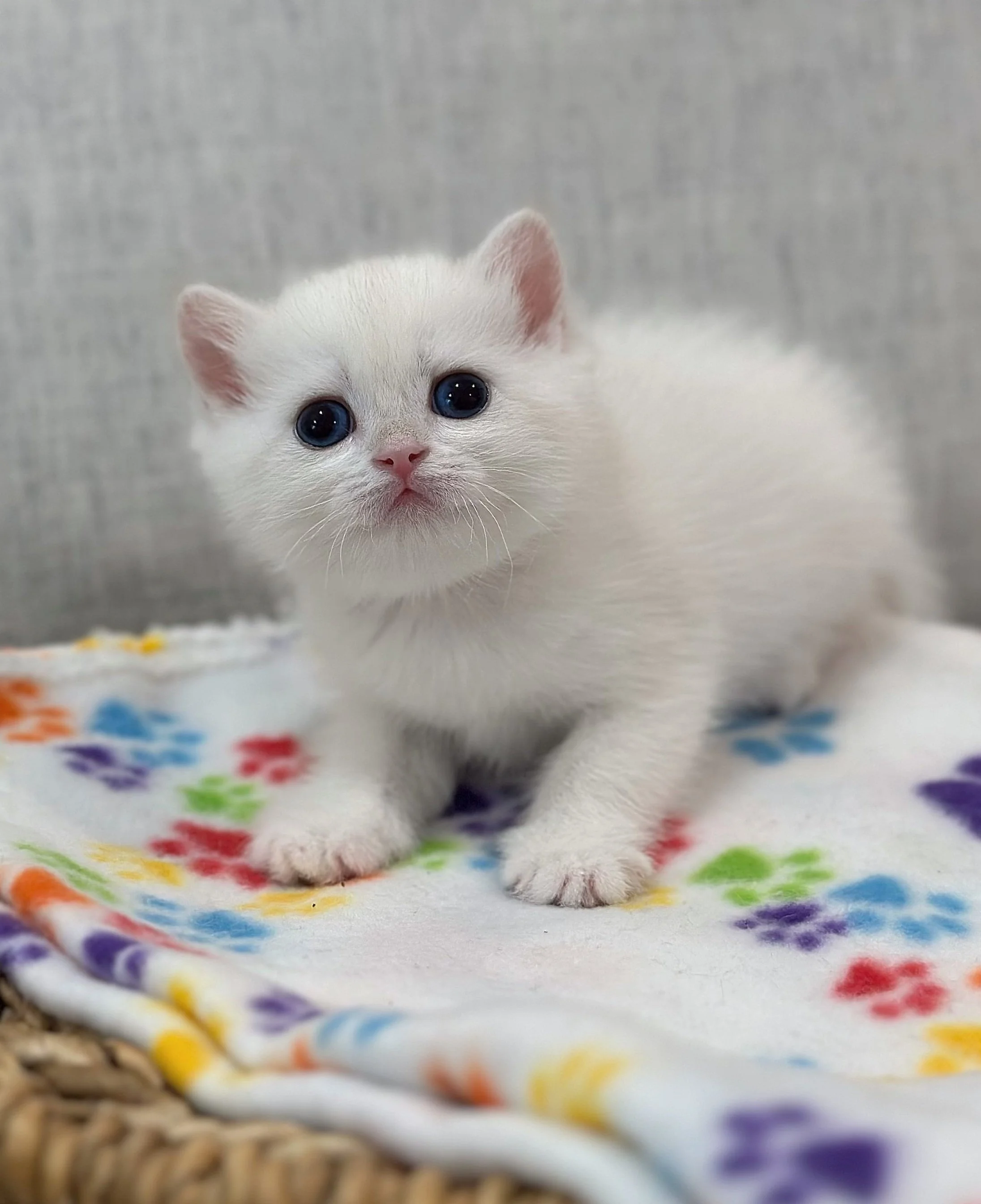Baby boy is a Golden Point British Short Hair, with color code NY1233. This little guy is incredibly fun and playful! He loves all kinds of toys and tunnels, and his round, snow-white body is simply adorable. As he grows, he’ll develop a striking golden coloring on his back, nose, ears, and tail. He adores belly rubs and is the most vocal in the litter, meowing for hugs when he wakes up from his naps and for food when he’s hungry. His interactive nature makes him a delightful companion!