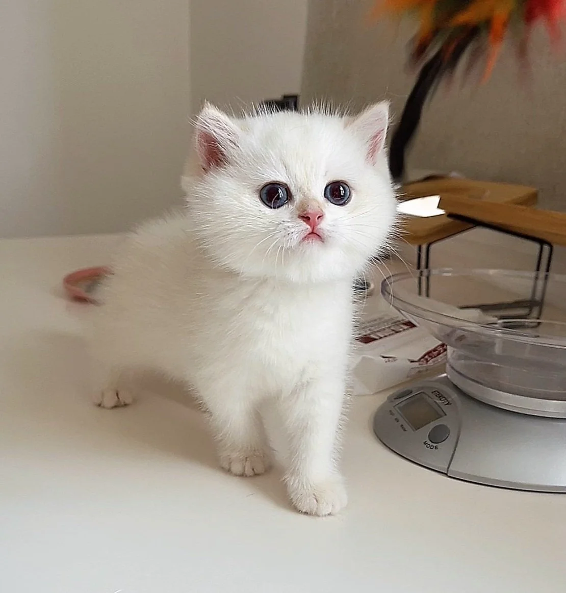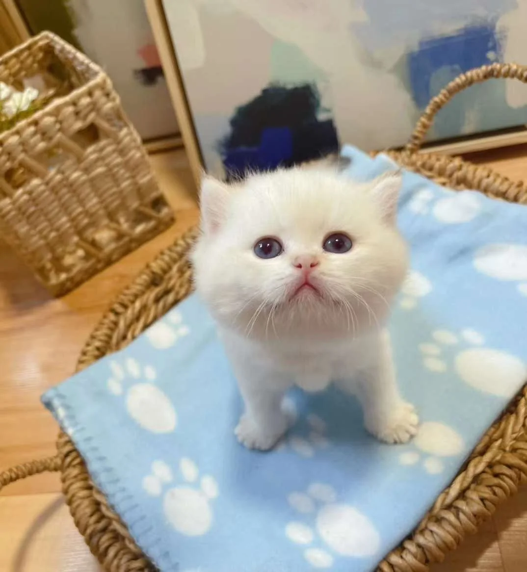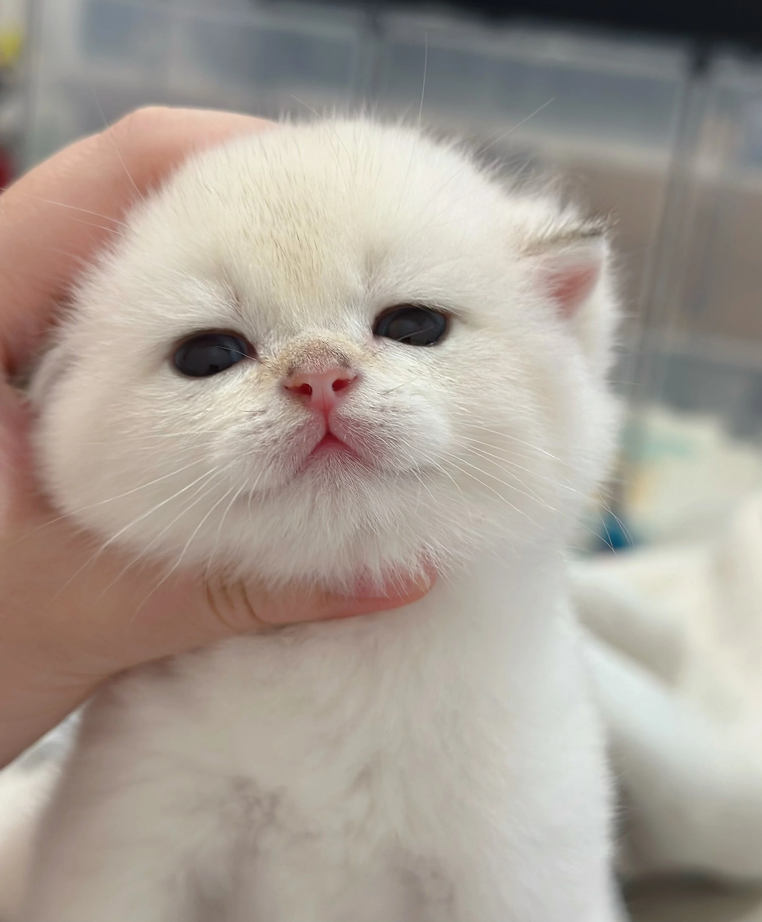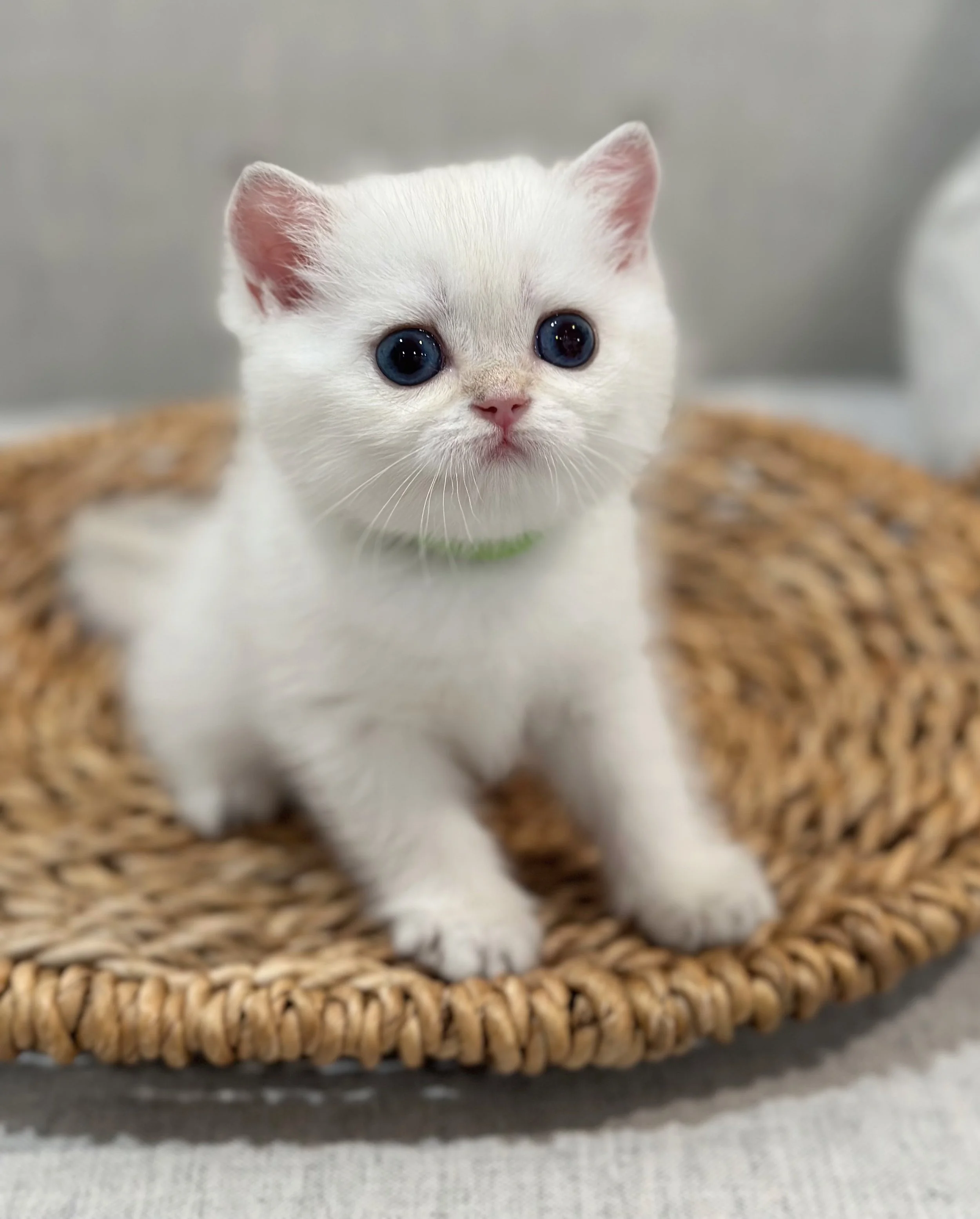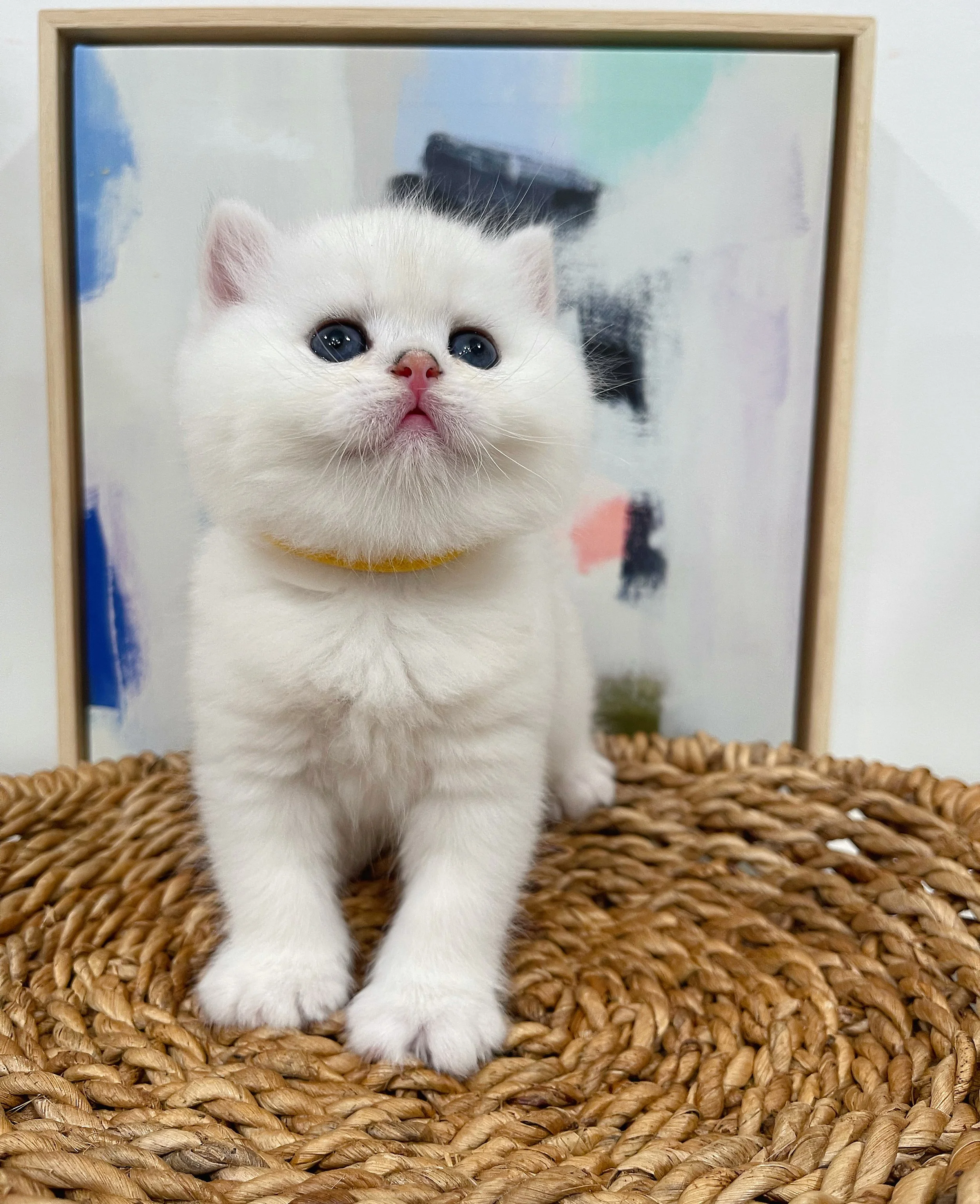 Baby boy is a Golden Point British Short Hair, with color code NY1233. This little guy is incredibly fun and playful! He loves all kinds of toys and tunnels, and his round, snow-white body is simply adorable. As he grows, he’ll develop a striking golden coloring on his back, nose, ears, and tail. He adores belly rubs and is the most vocal in the litter, meowing for hugs when he wakes up from his naps and for food when he’s hungry. His interactive nature makes him a delightful companion!
