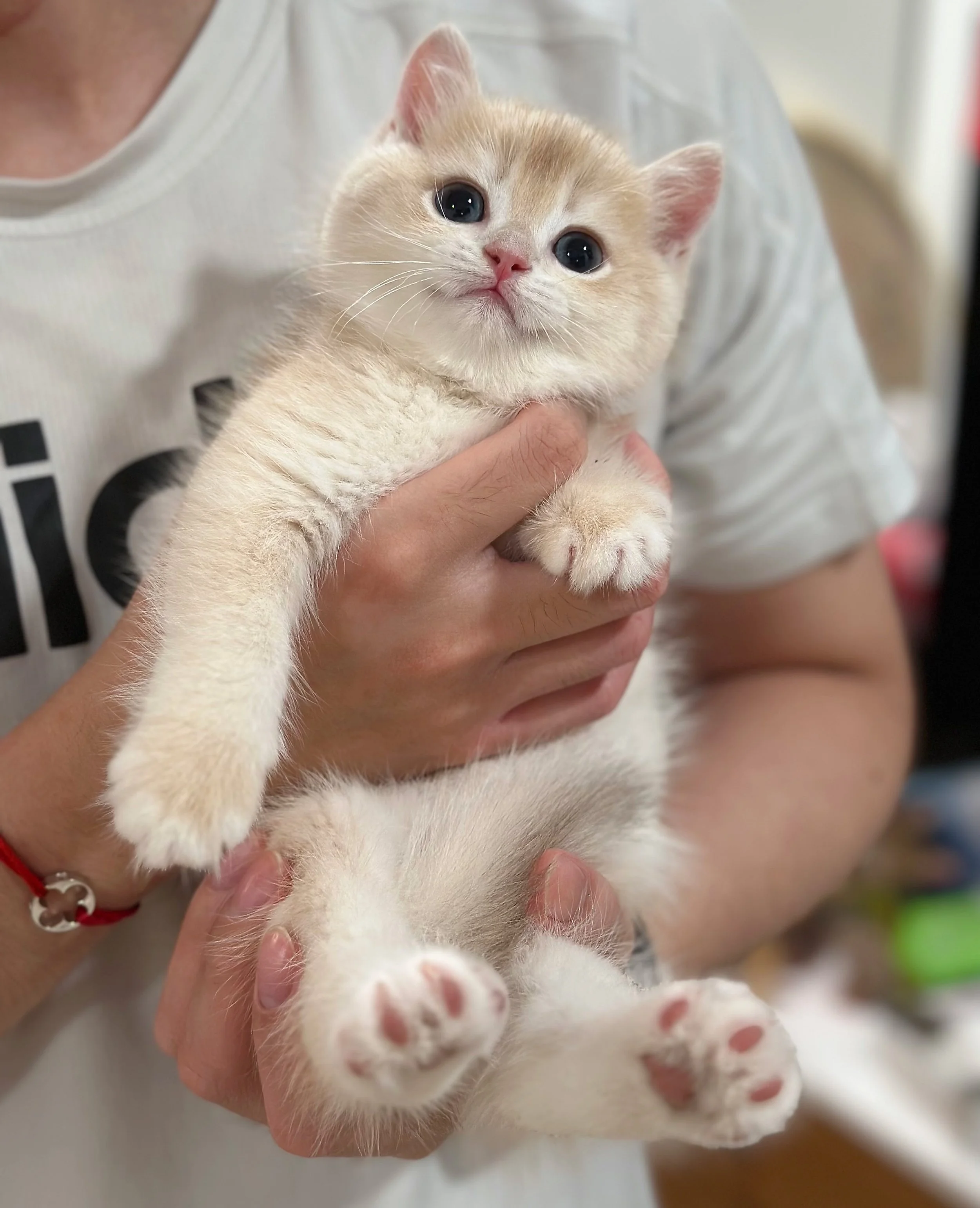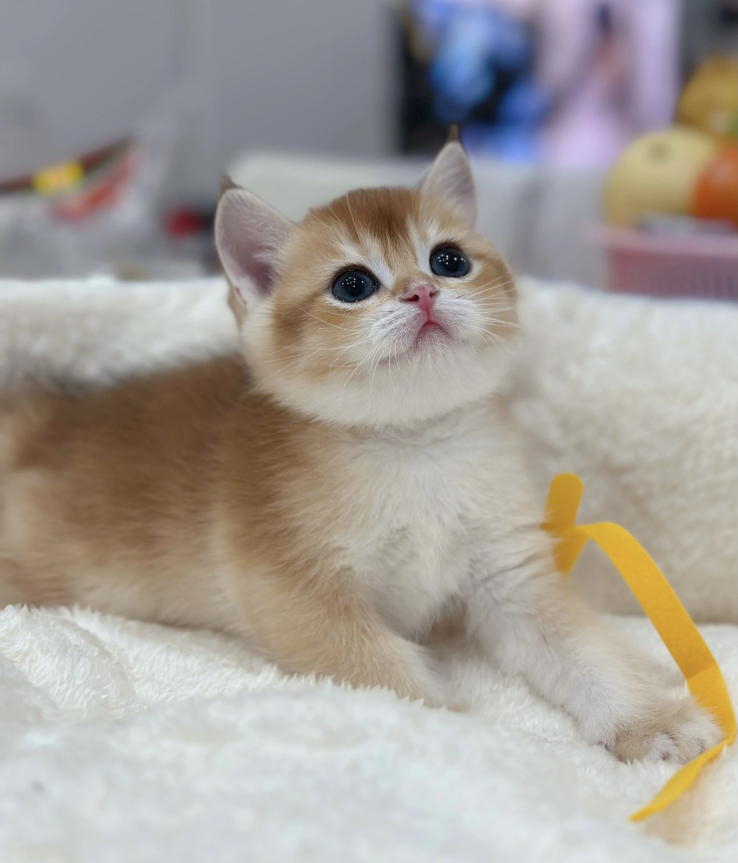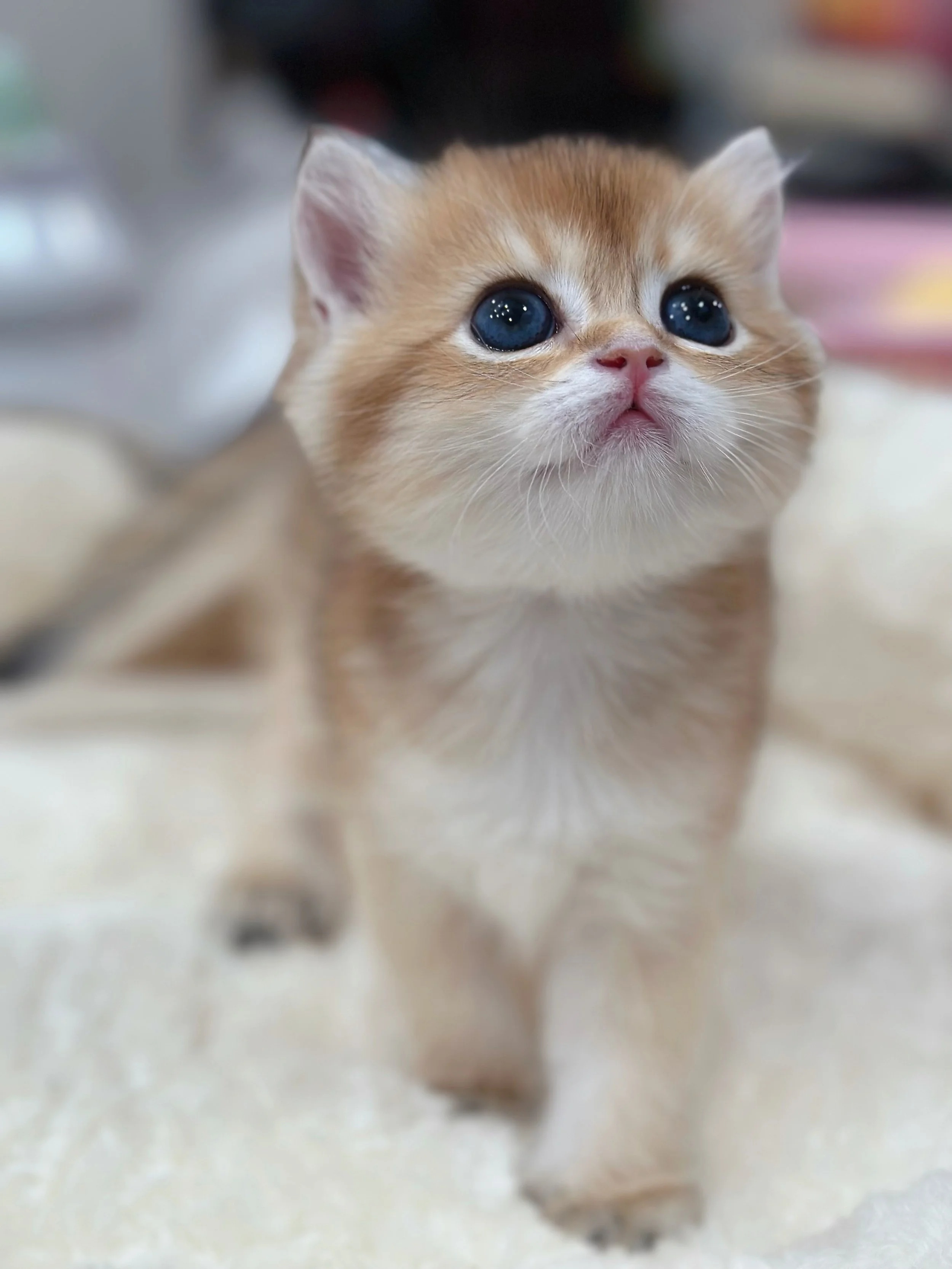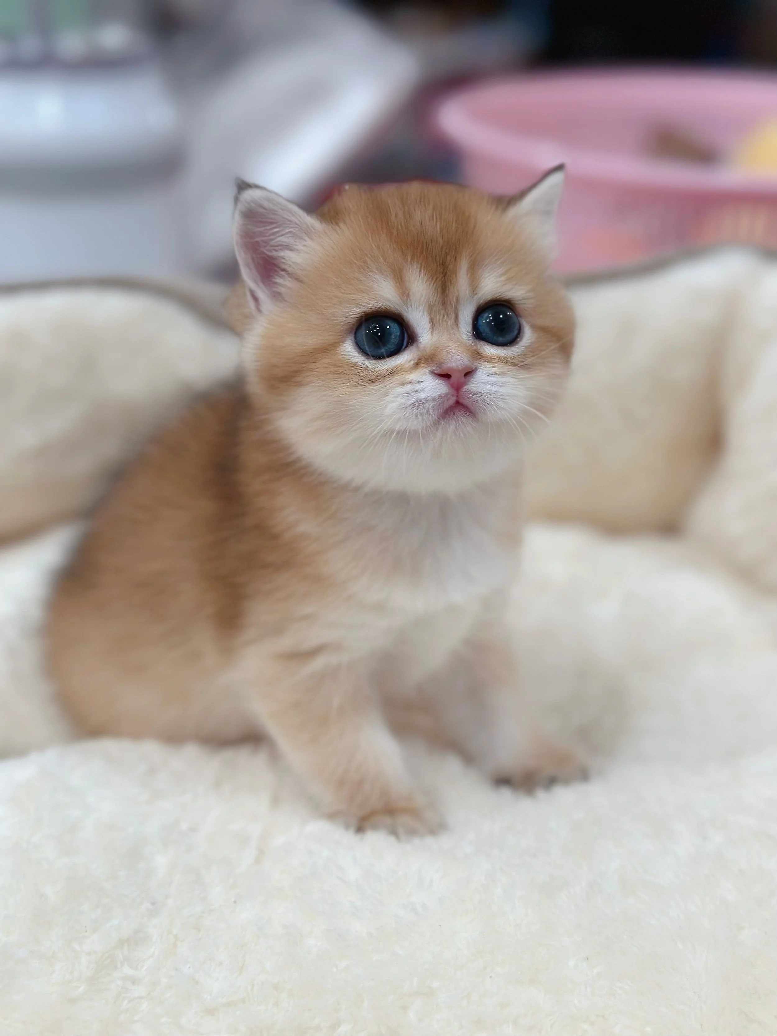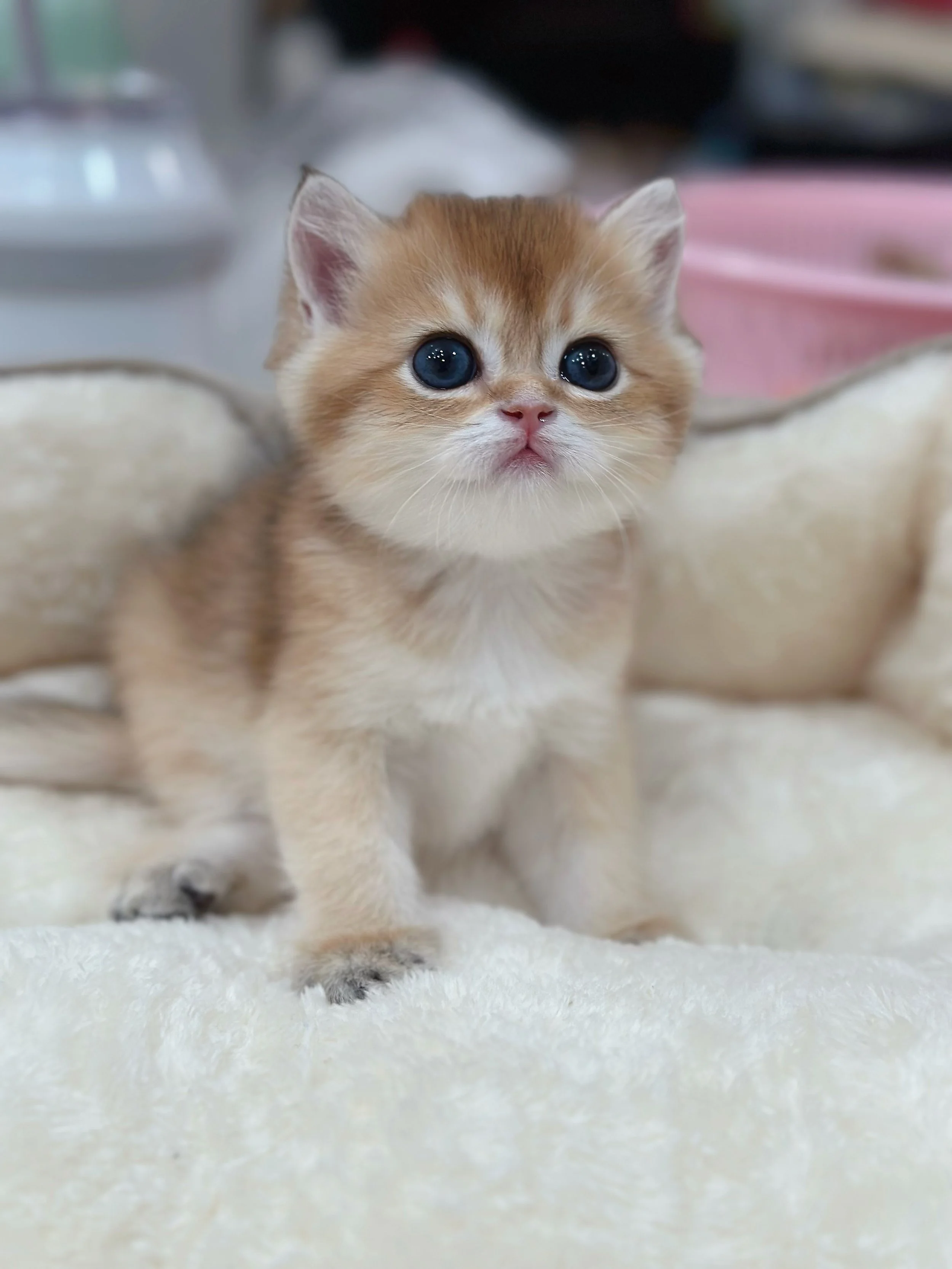 Baby girl is a Golden Point British Short Hair, with color code NY1233. She is incredibly beautiful and sweet, with bright sky-blue eyes and a lovely round face. As she grows, I can already see her developing a stunning golden hue on her face and back. Every morning, she greets me with affectionate hugs and gentle nose sniffs, filling my day with warmth. She also adores being carried around the house, snuggling up close to me.