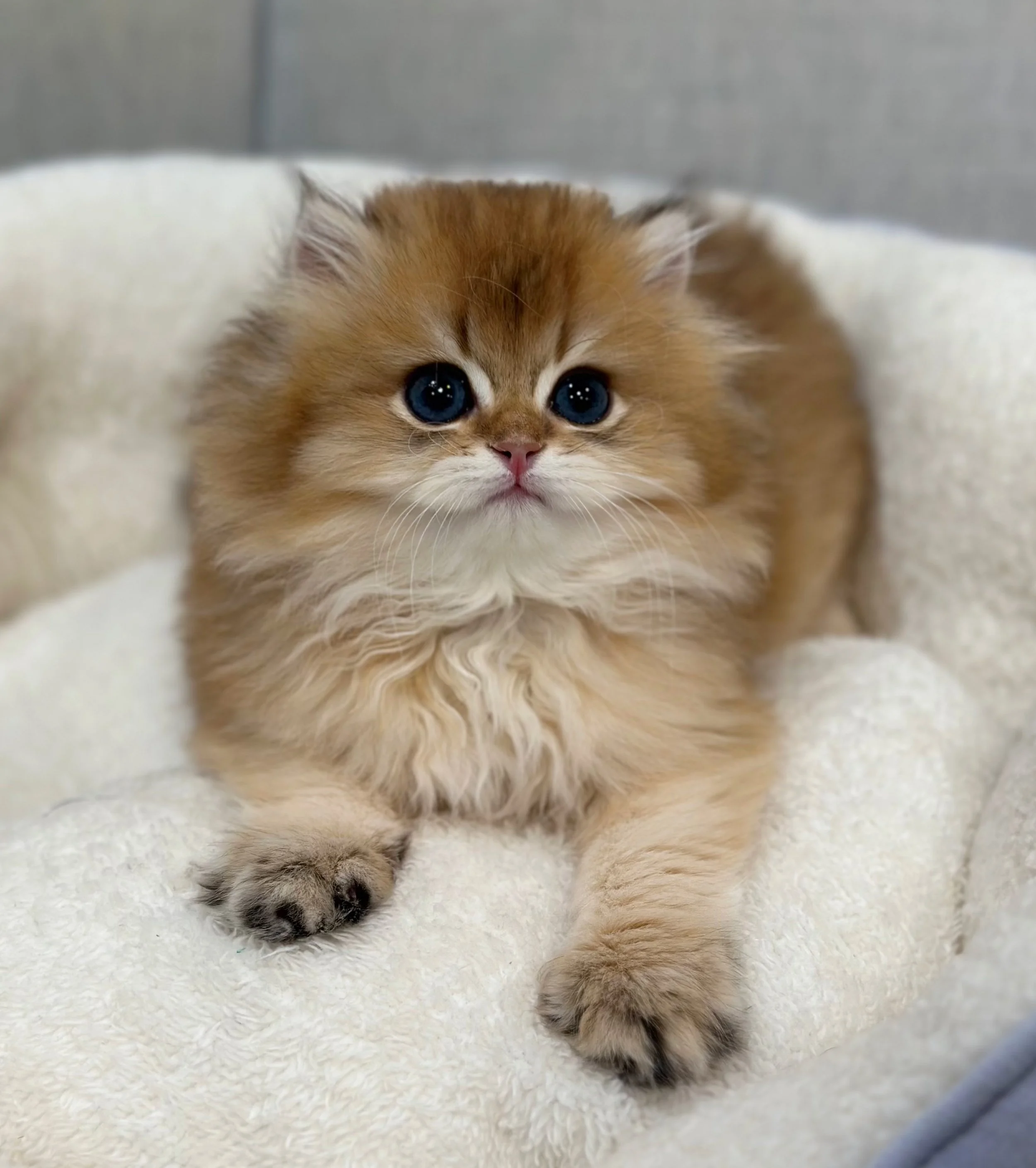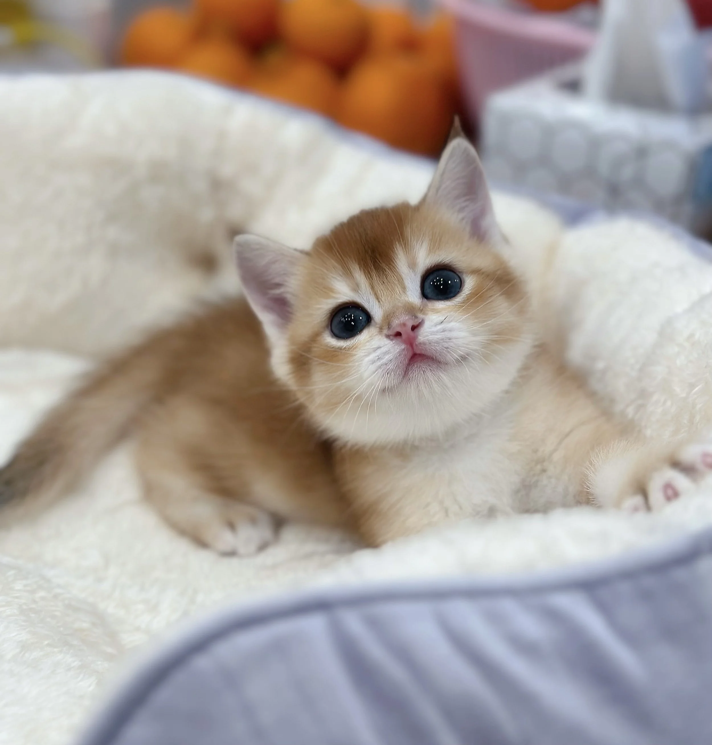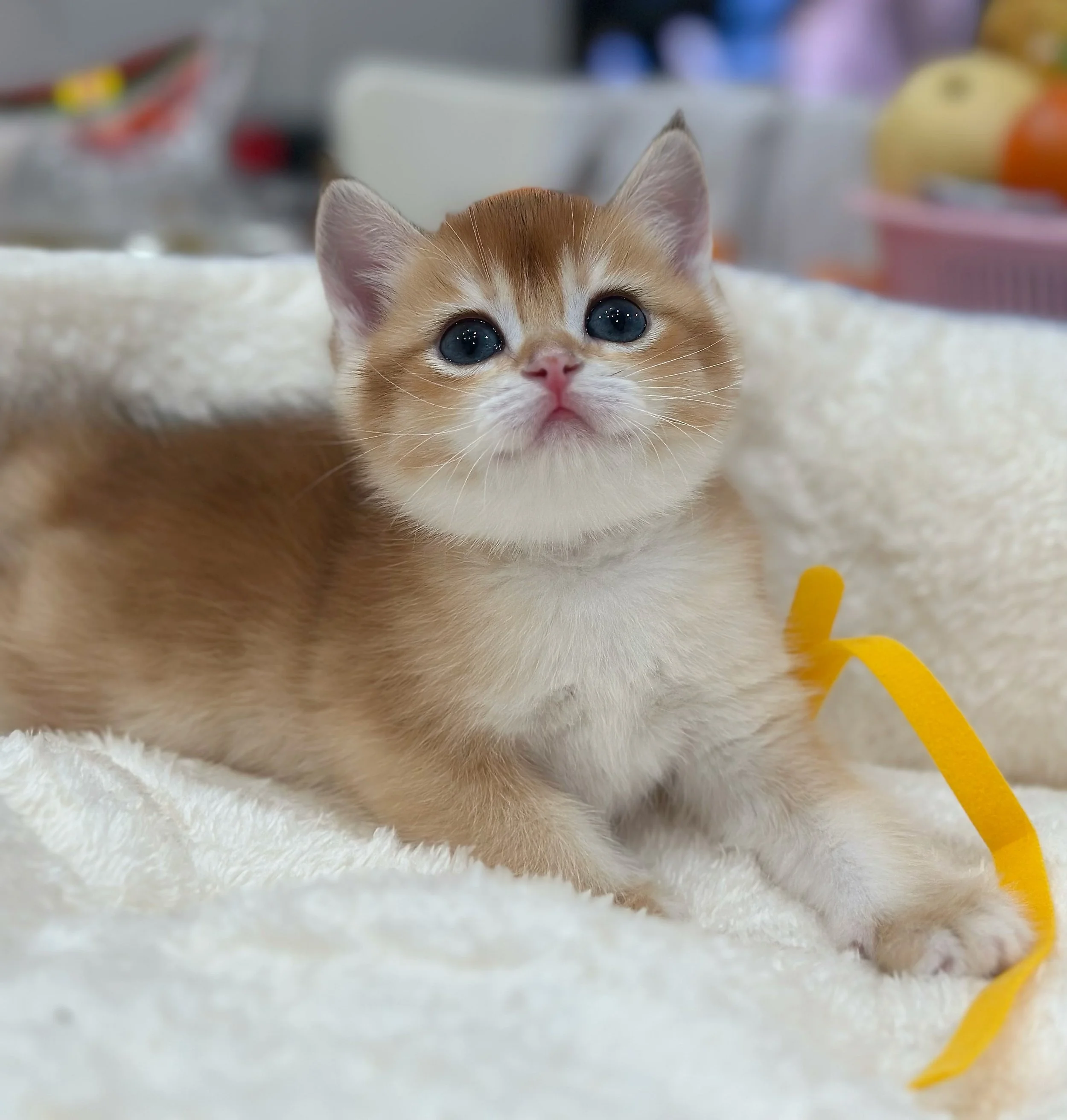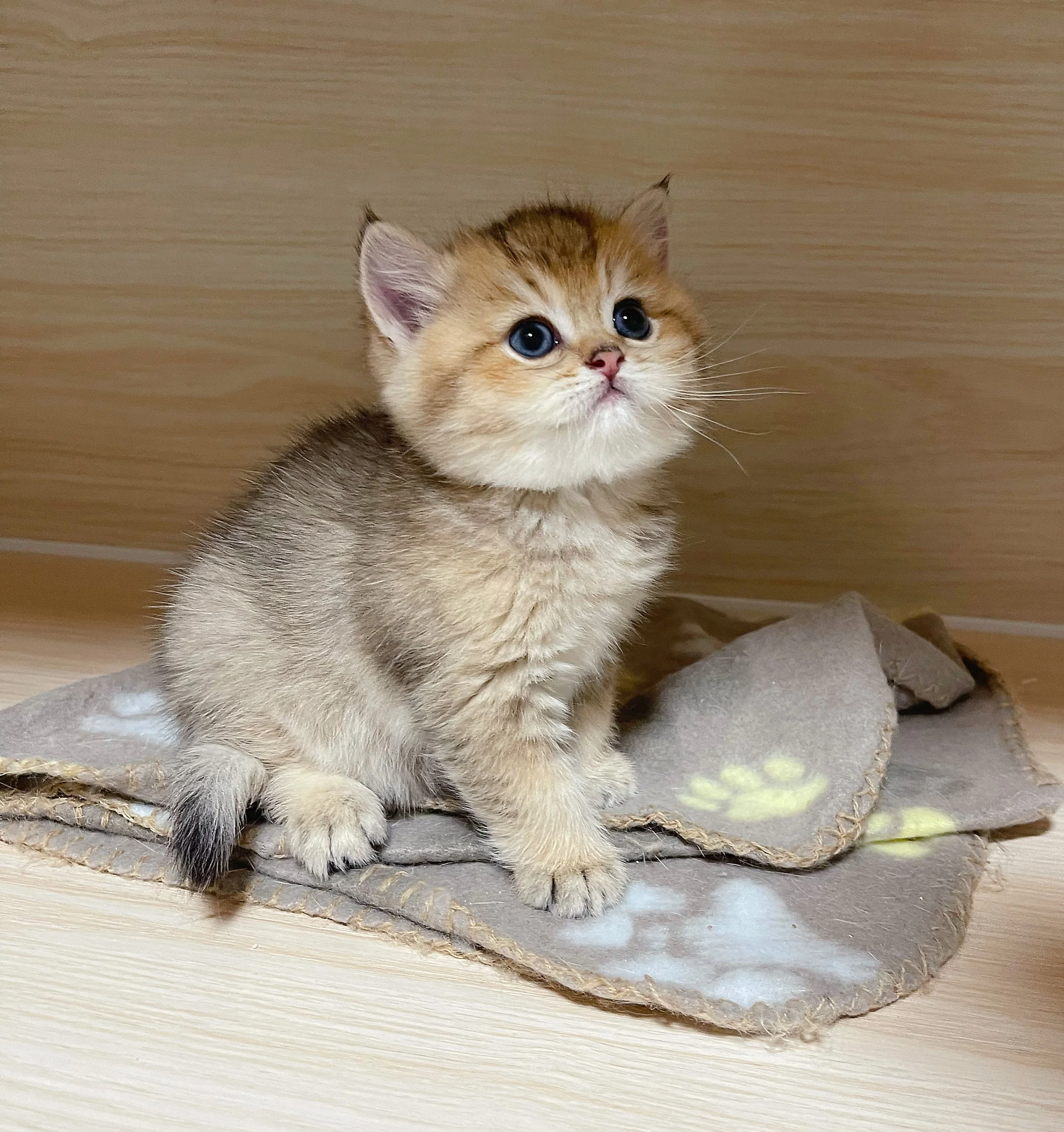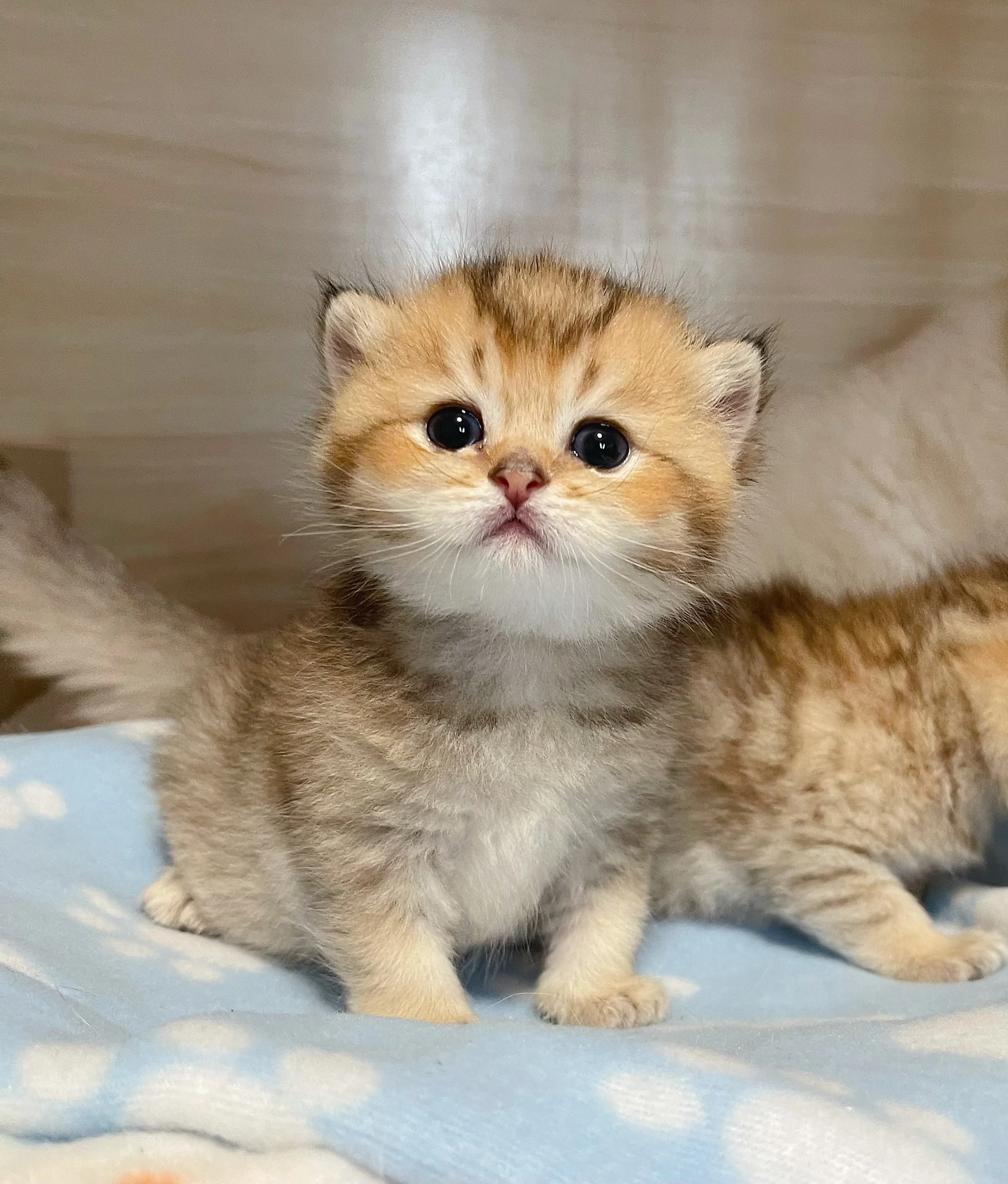 Baby girl is a Golden Point British Short Hair, with color code NY1233. She is incredibly beautiful and sweet, with bright sky-blue eyes and a lovely round face. As she grows, I can already see her developing a stunning golden hue on her face and back. Every morning, she greets me with affectionate hugs and gentle nose sniffs, filling my day with warmth. She also adores being carried around the house, snuggling up close to me.