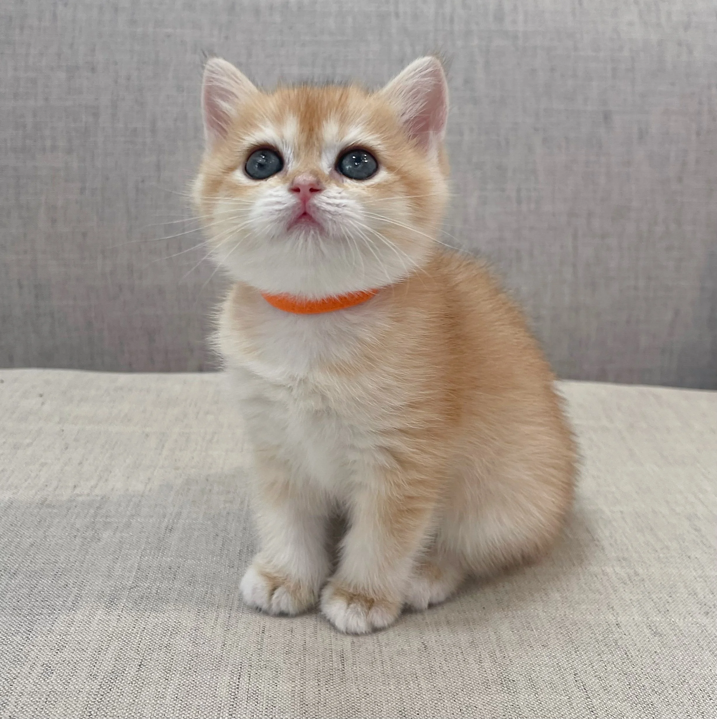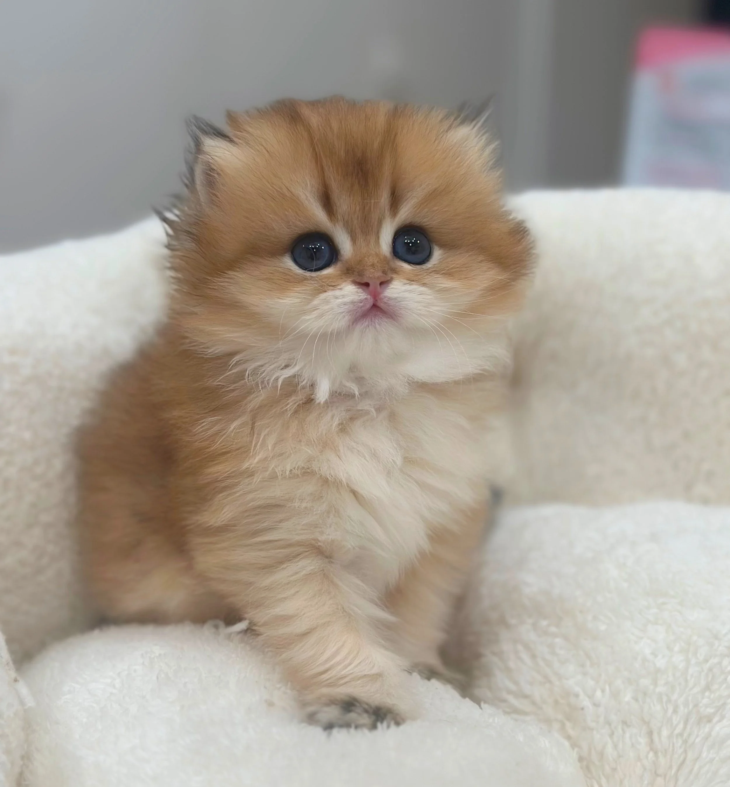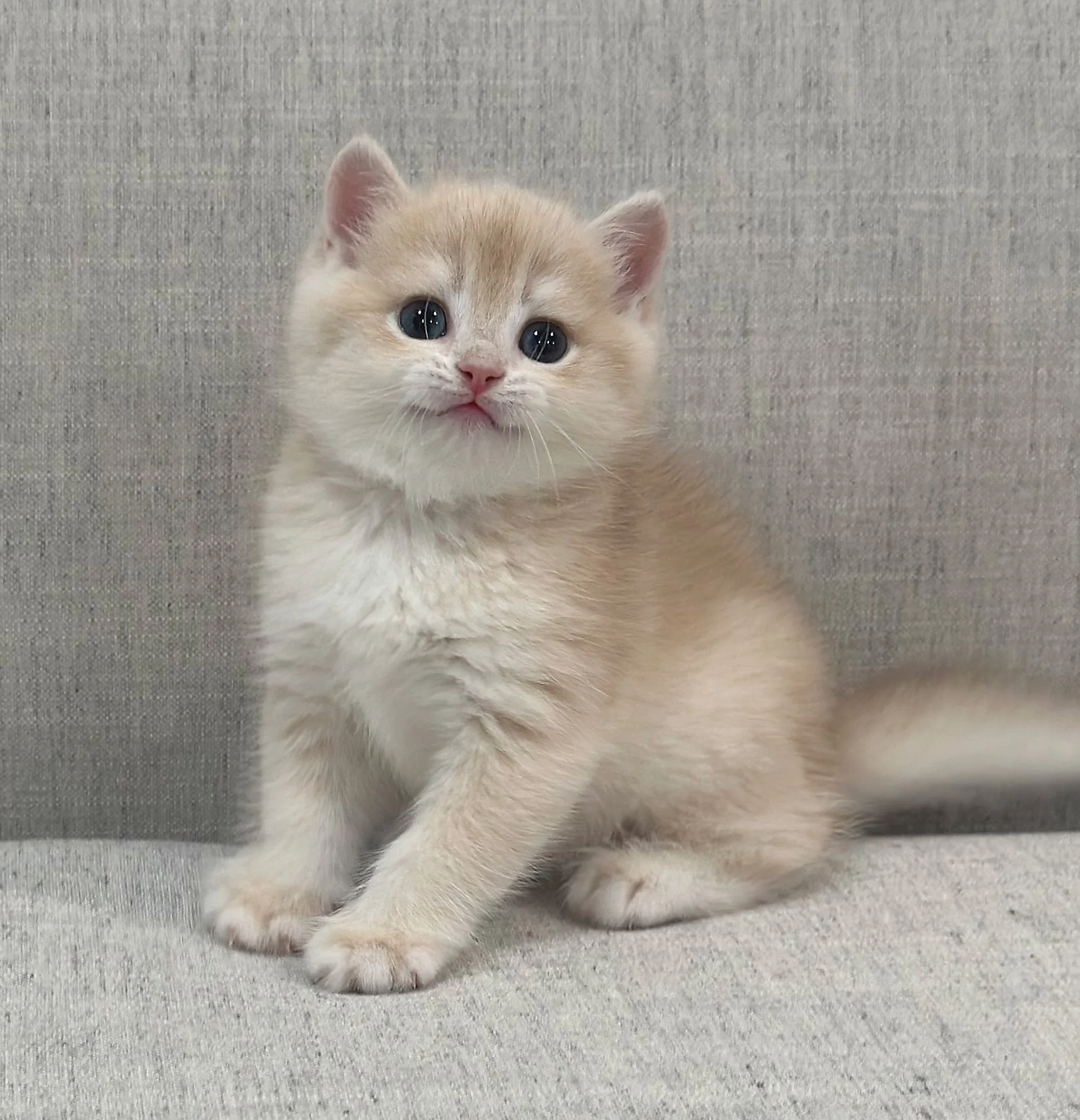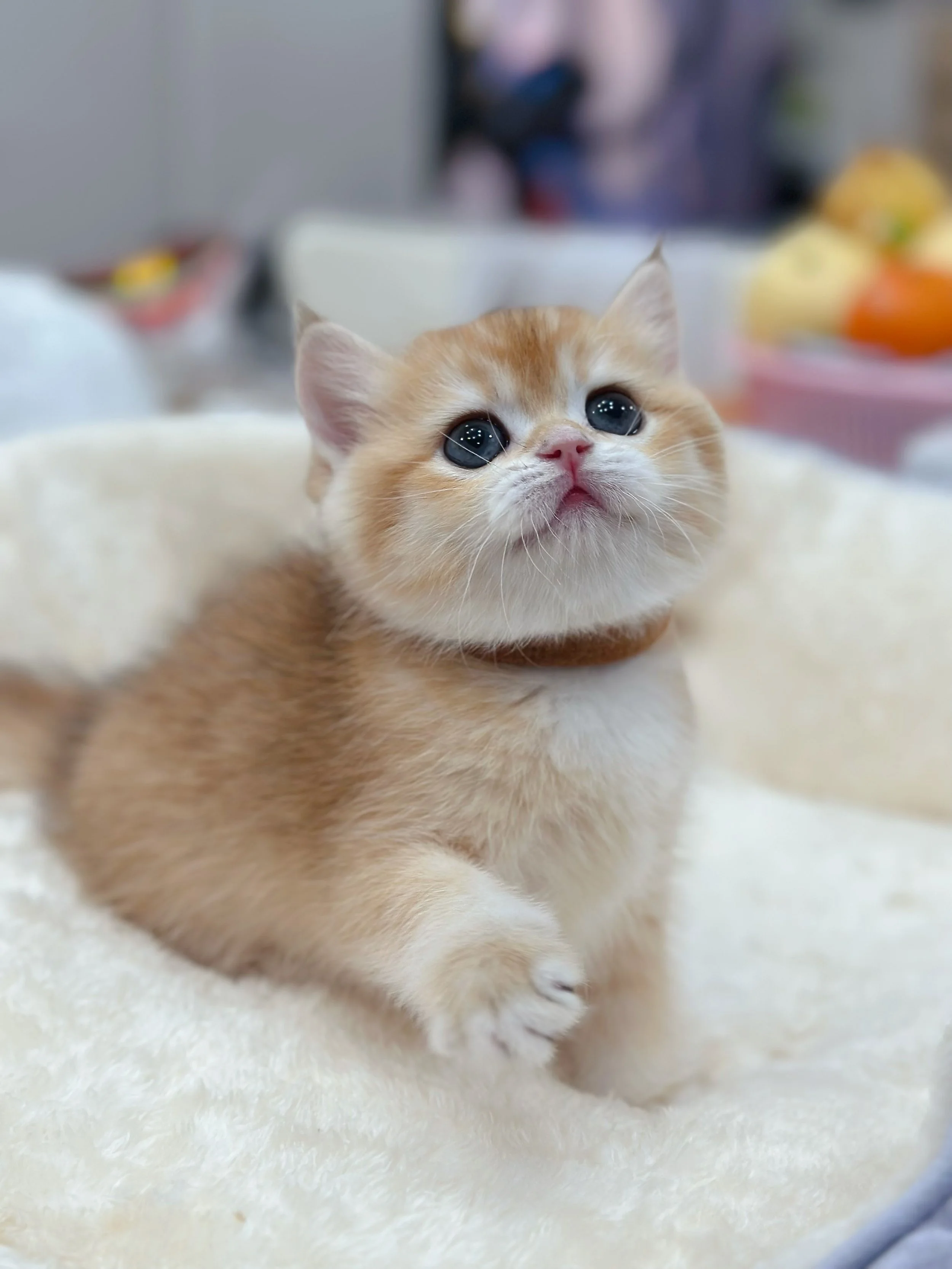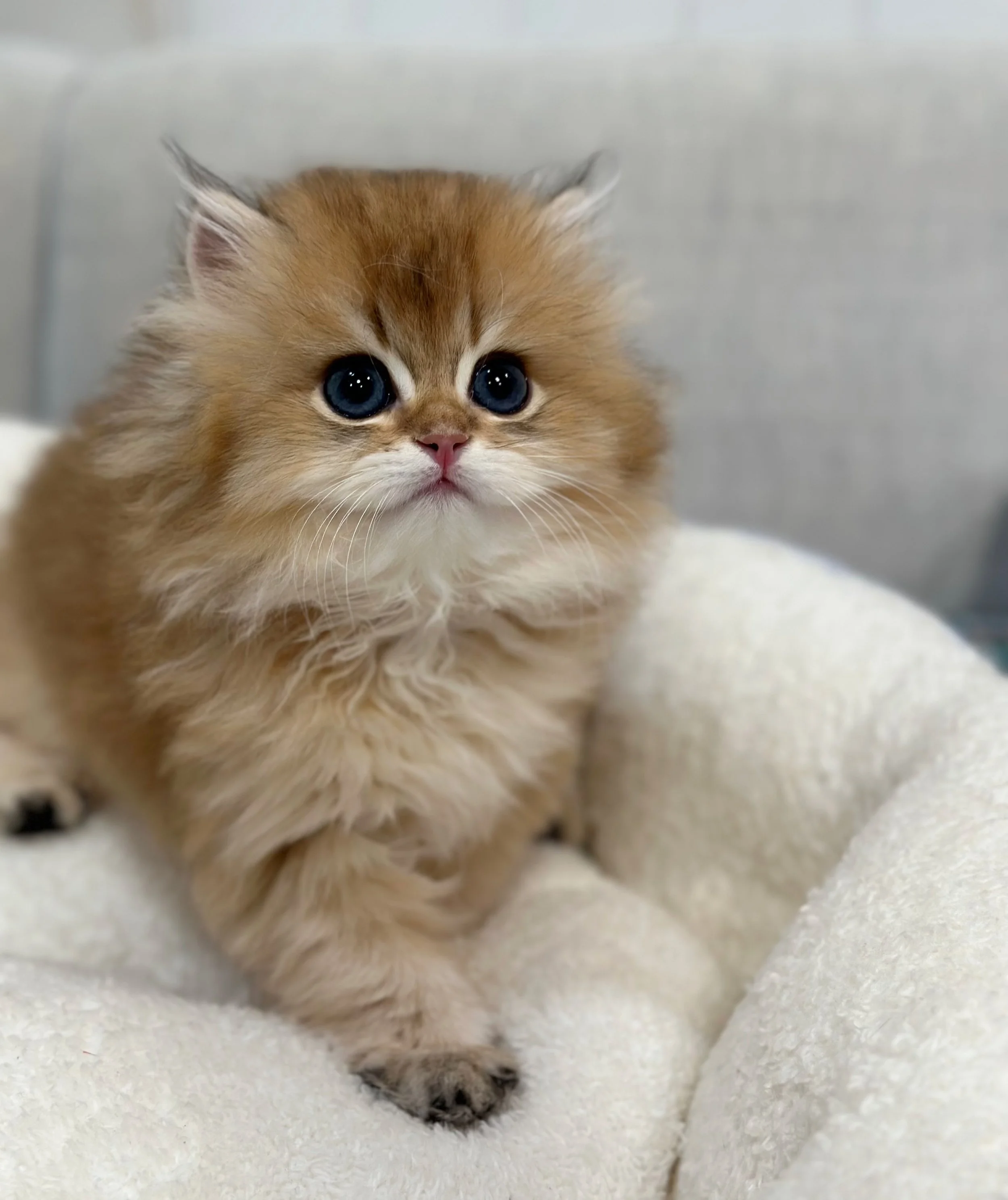 Baby girl is a Golden Point British Short Hair, with color code NY1233. She is incredibly beautiful and sweet, with bright sky-blue eyes and a lovely round face. As she grows, I can already see her developing a stunning golden hue on her face and back. Every morning, she greets me with affectionate hugs and gentle nose sniffs, filling my day with warmth. She also adores being carried around the house, snuggling up close to me.