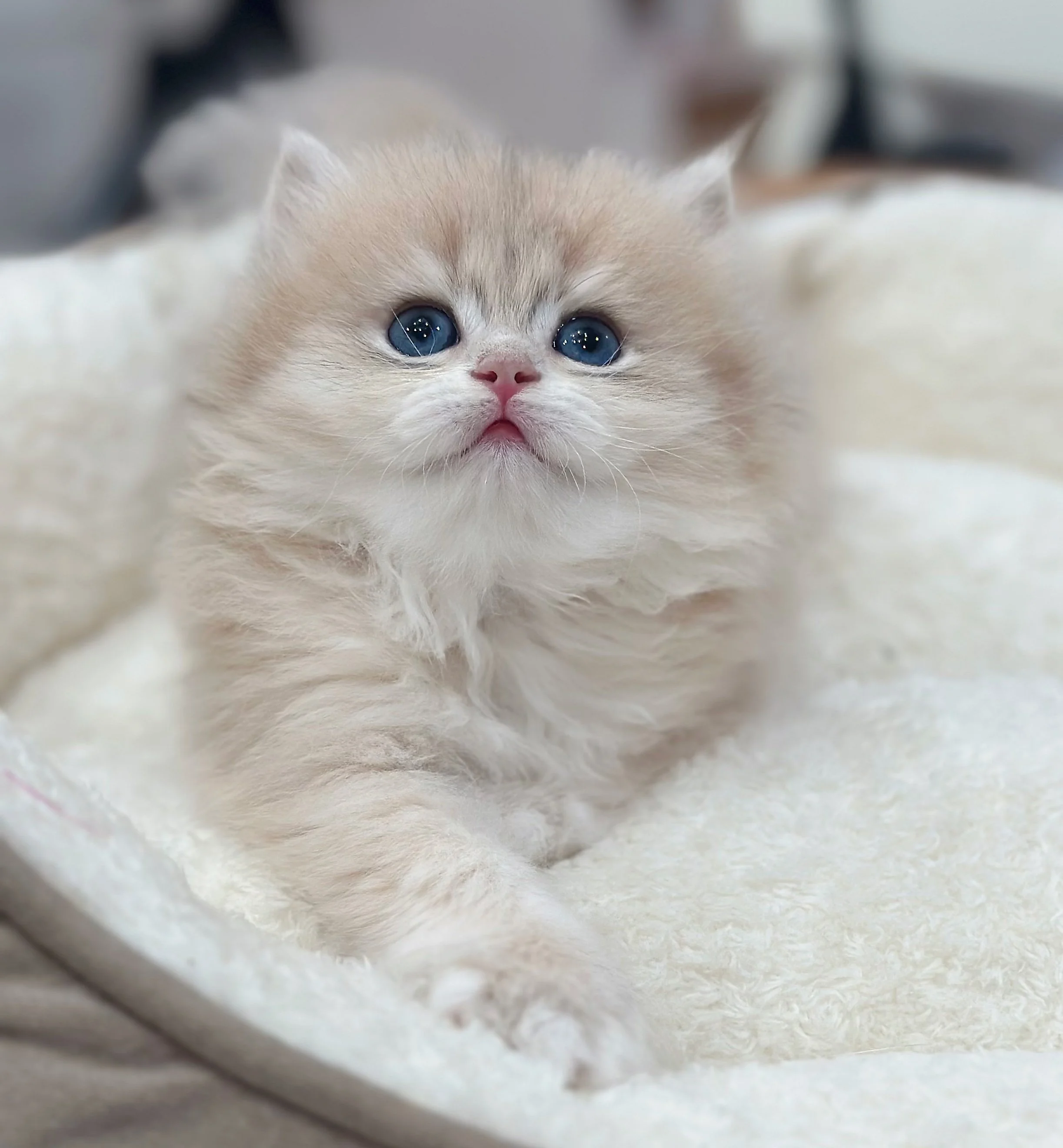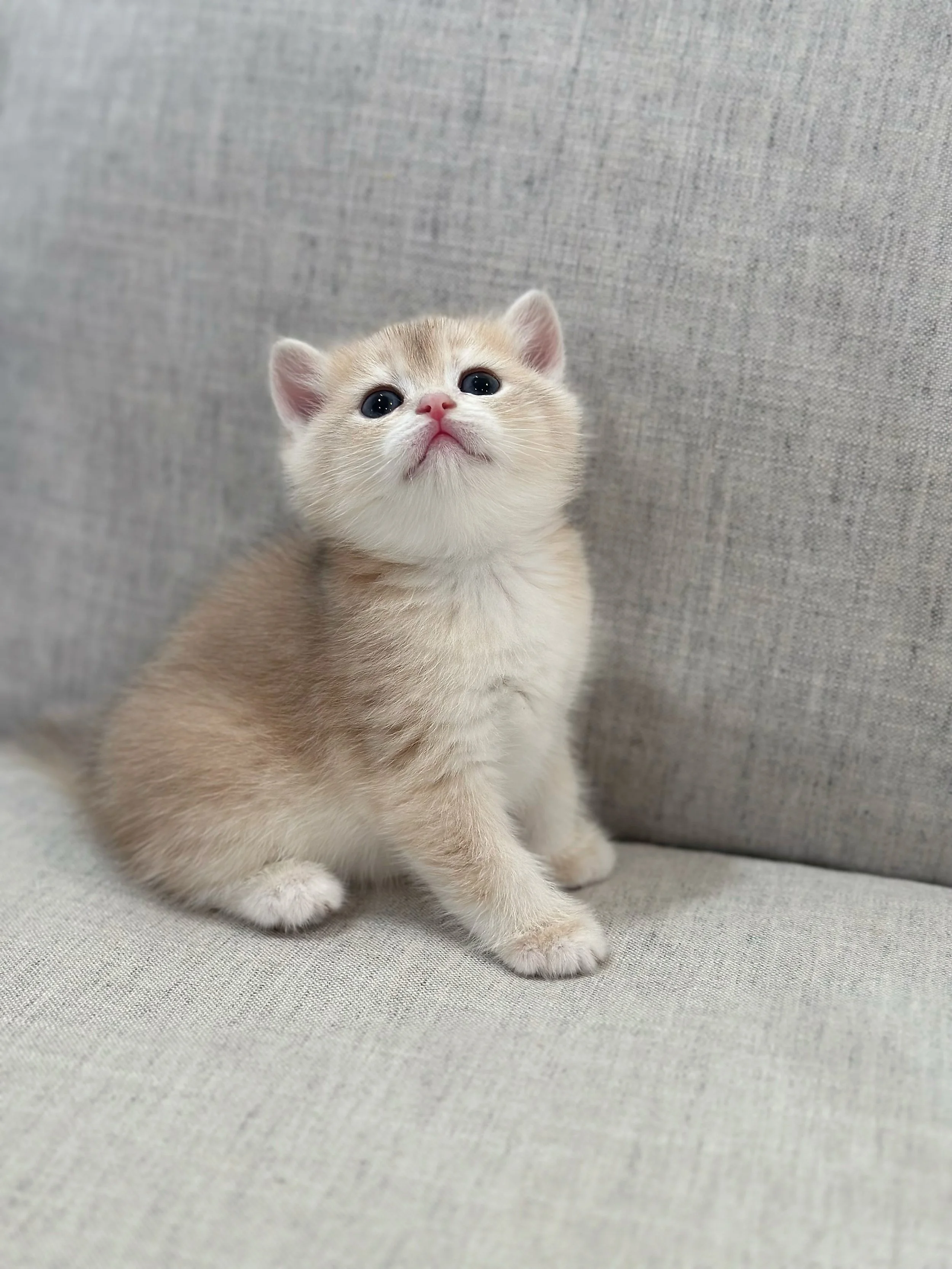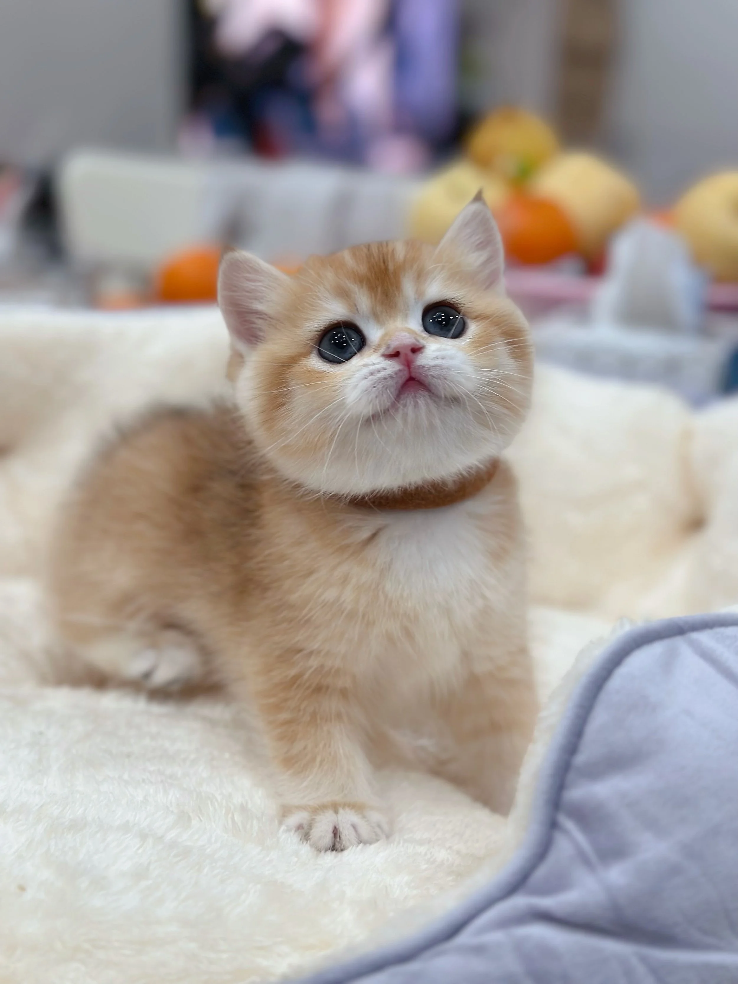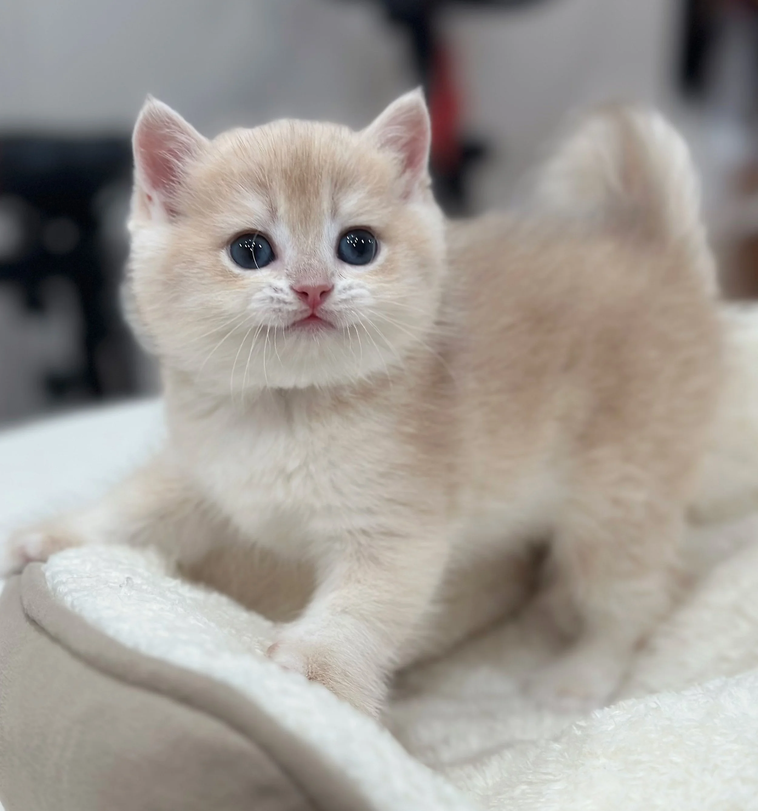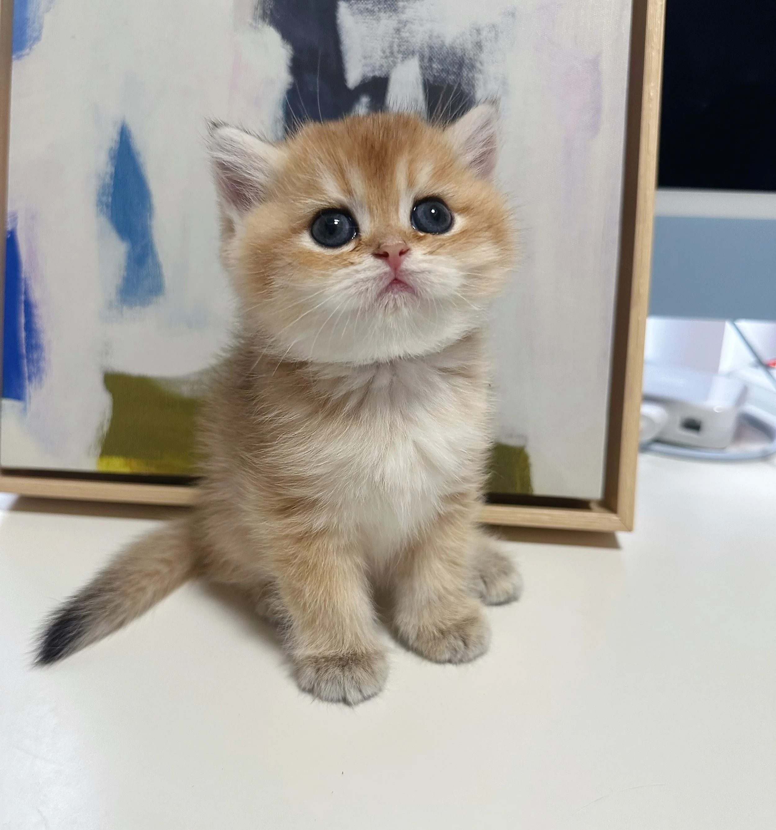 Baby girl is a Golden Point British Short Hair, with color code NY1233. She is incredibly beautiful and sweet, with bright sky-blue eyes and a lovely round face. As she grows, I can already see her developing a stunning golden hue on her face and back. Every morning, she greets me with affectionate hugs and gentle nose sniffs, filling my day with warmth. She also adores being carried around the house, snuggling up close to me.