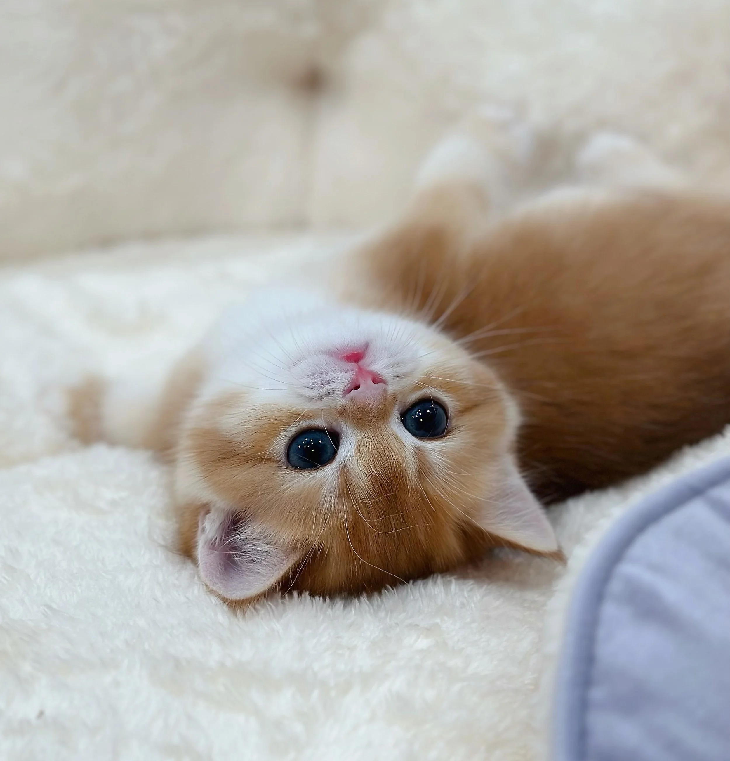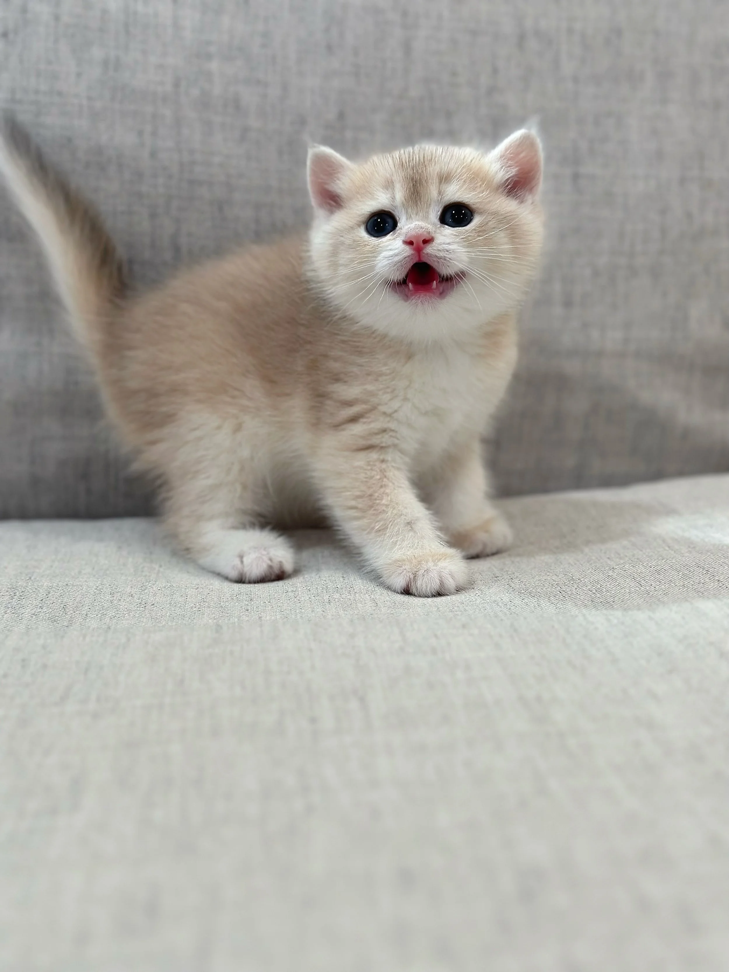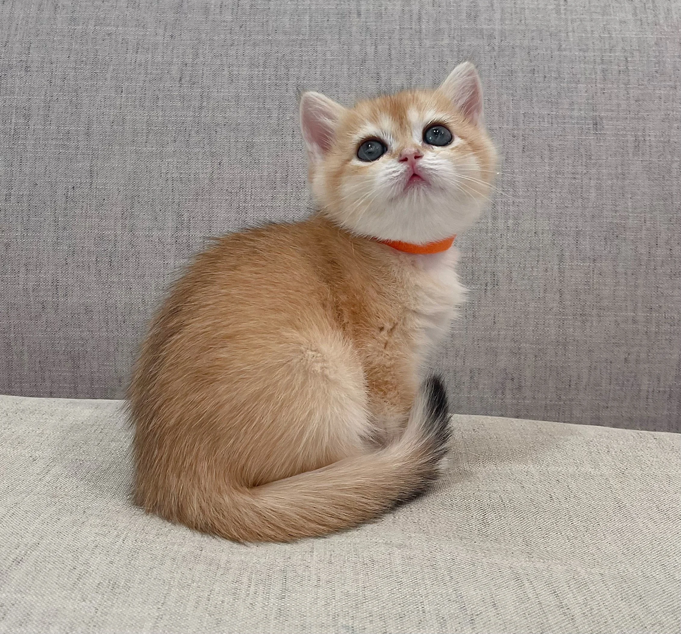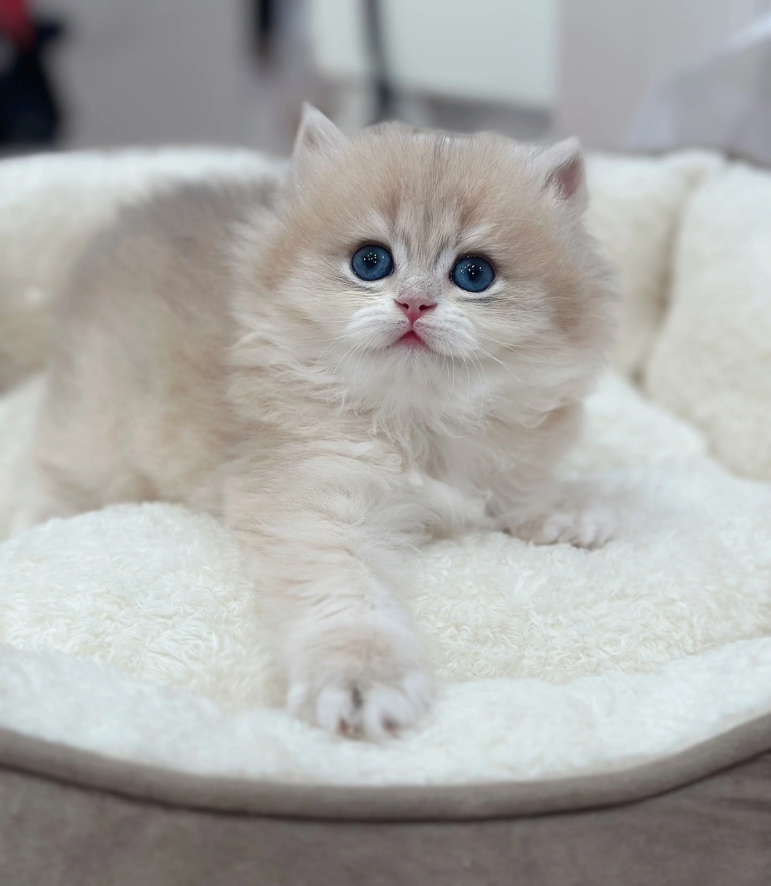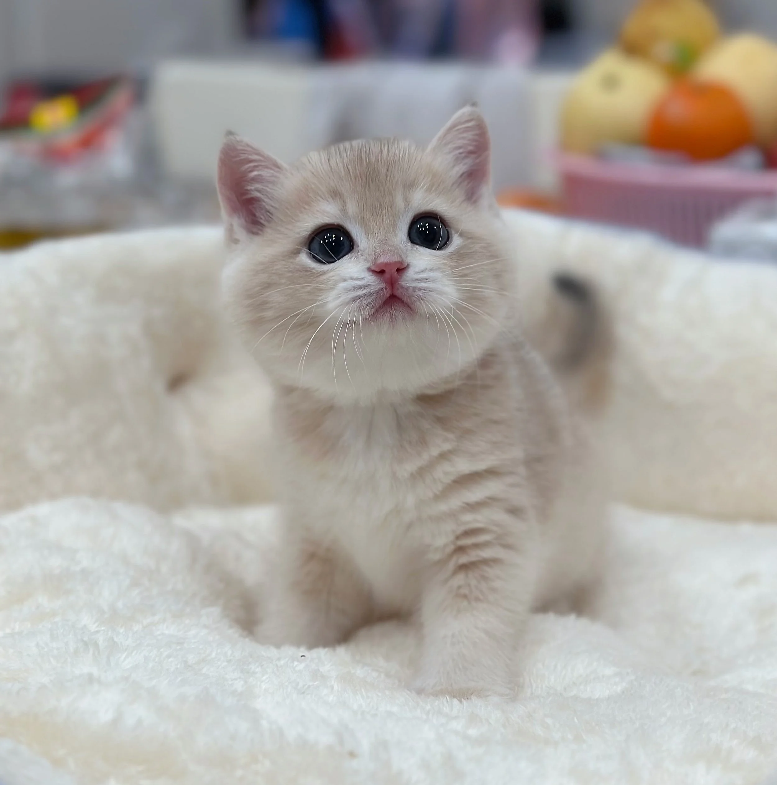 Baby girl is a Golden Point British Short Hair, with color code NY1233. She is incredibly beautiful and sweet, with bright sky-blue eyes and a lovely round face. As she grows, I can already see her developing a stunning golden hue on her face and back. Every morning, she greets me with affectionate hugs and gentle nose sniffs, filling my day with warmth. She also adores being carried around the house, snuggling up close to me.