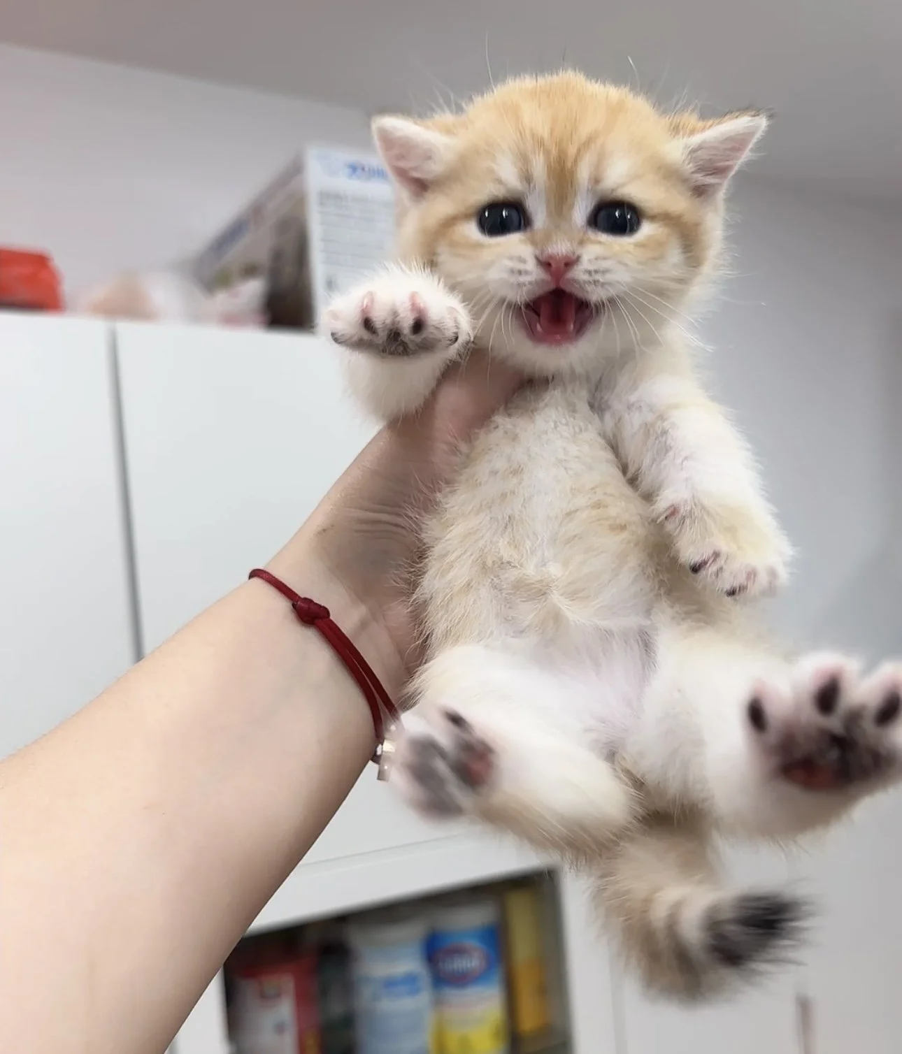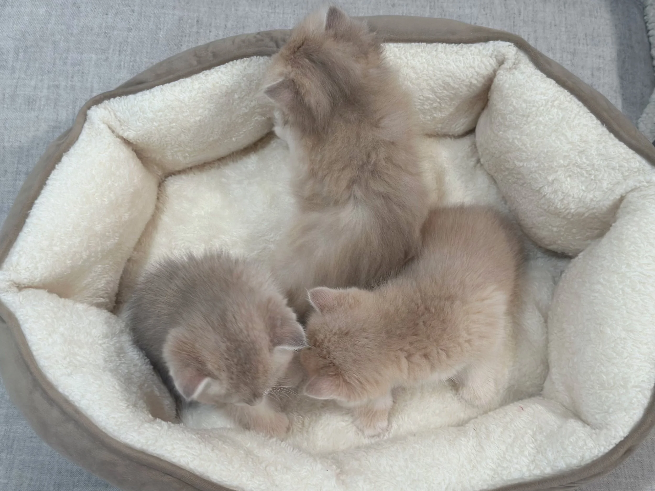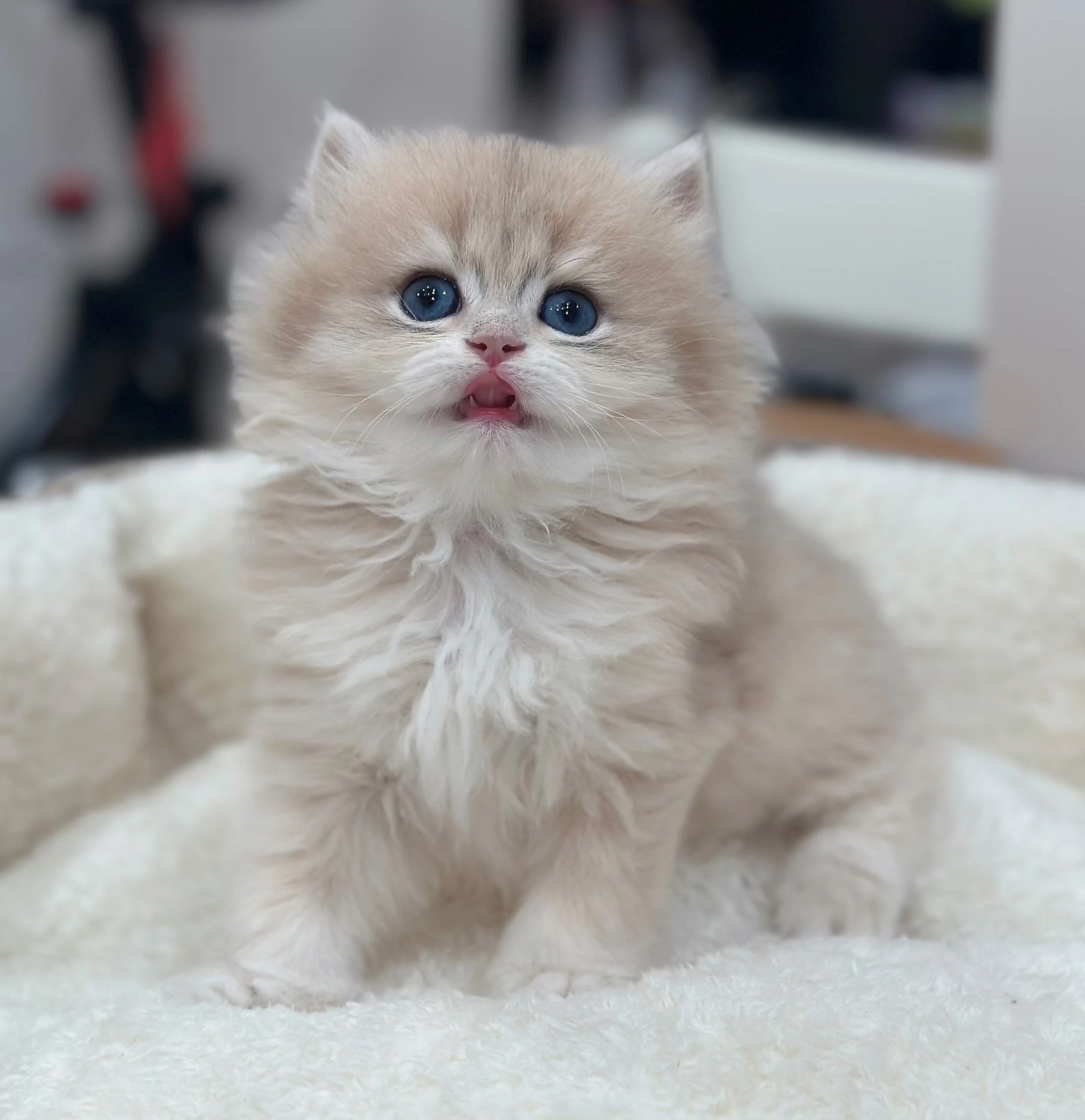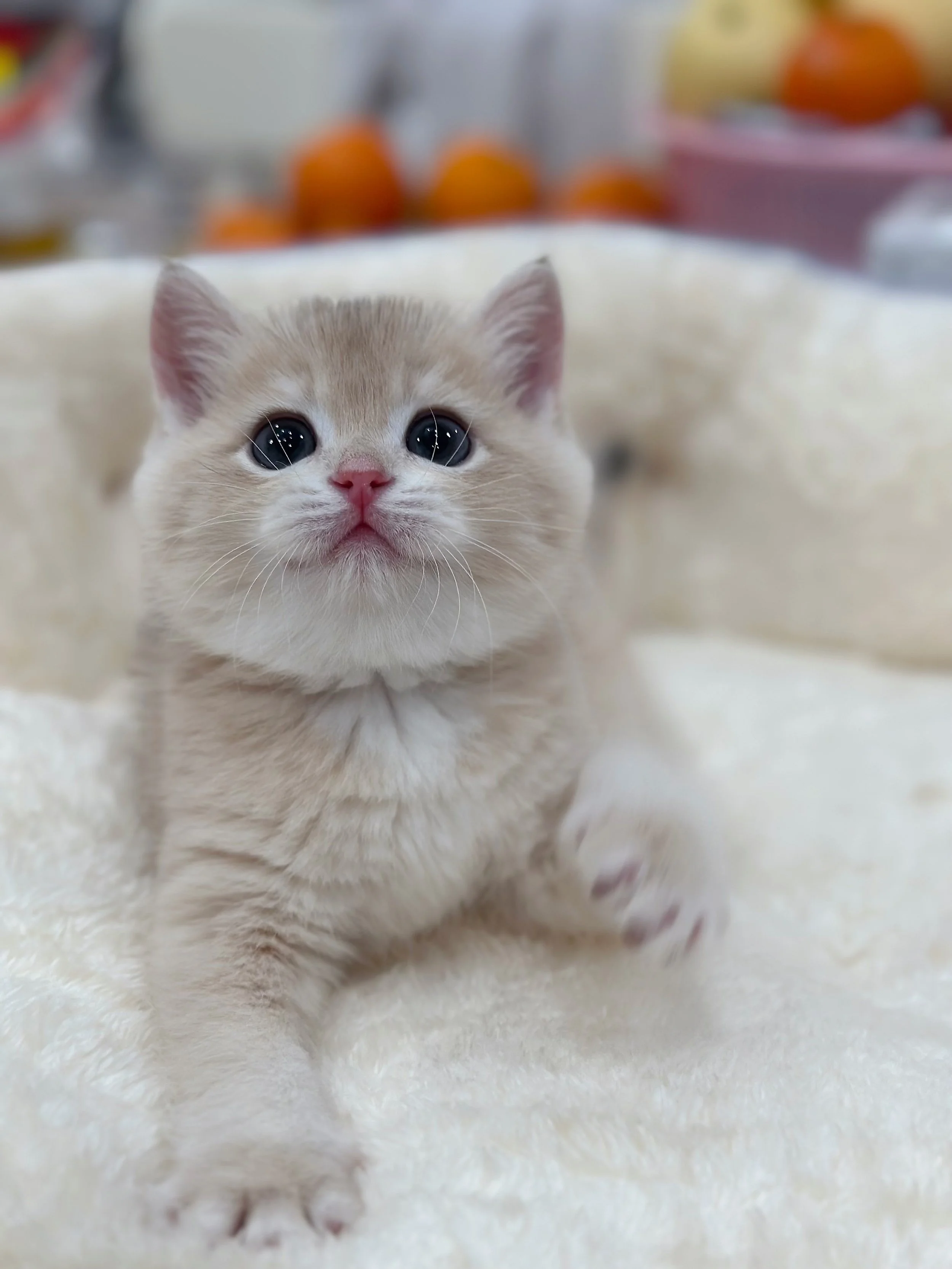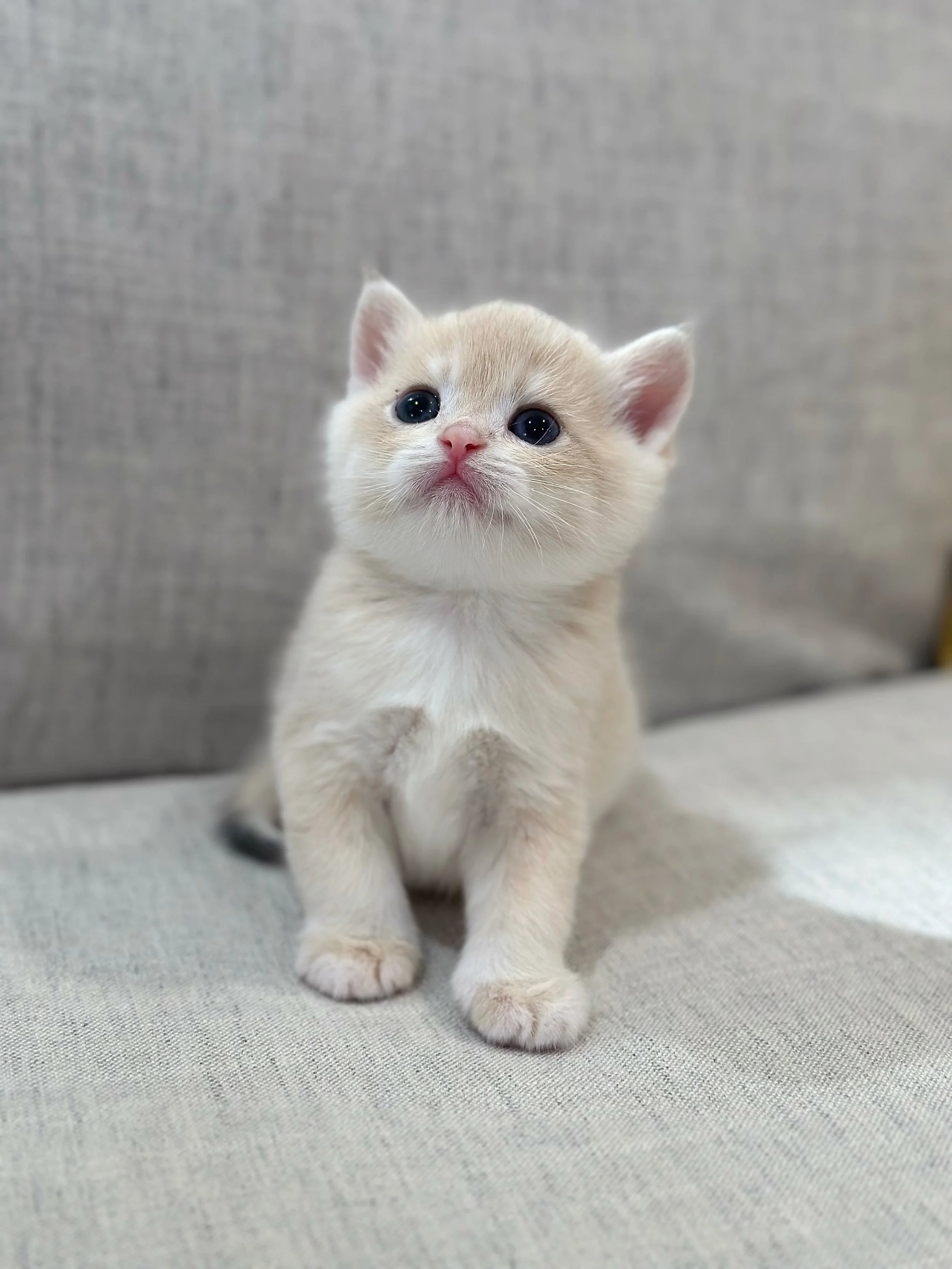 Baby girl is a Golden Point British Short Hair, with color code NY1233. She is incredibly beautiful and sweet, with bright sky-blue eyes and a lovely round face. As she grows, I can already see her developing a stunning golden hue on her face and back. Every morning, she greets me with affectionate hugs and gentle nose sniffs, filling my day with warmth. She also adores being carried around the house, snuggling up close to me.