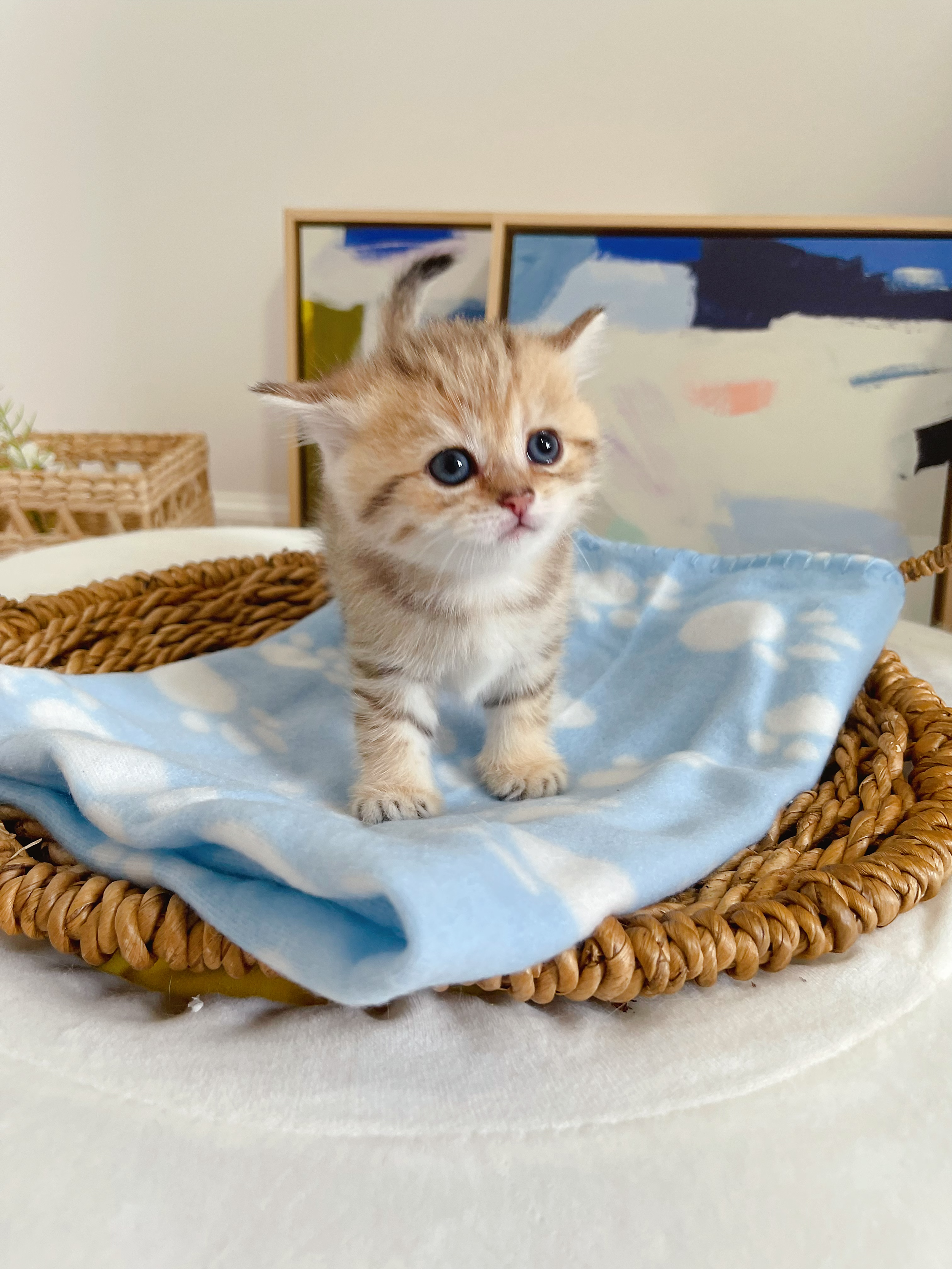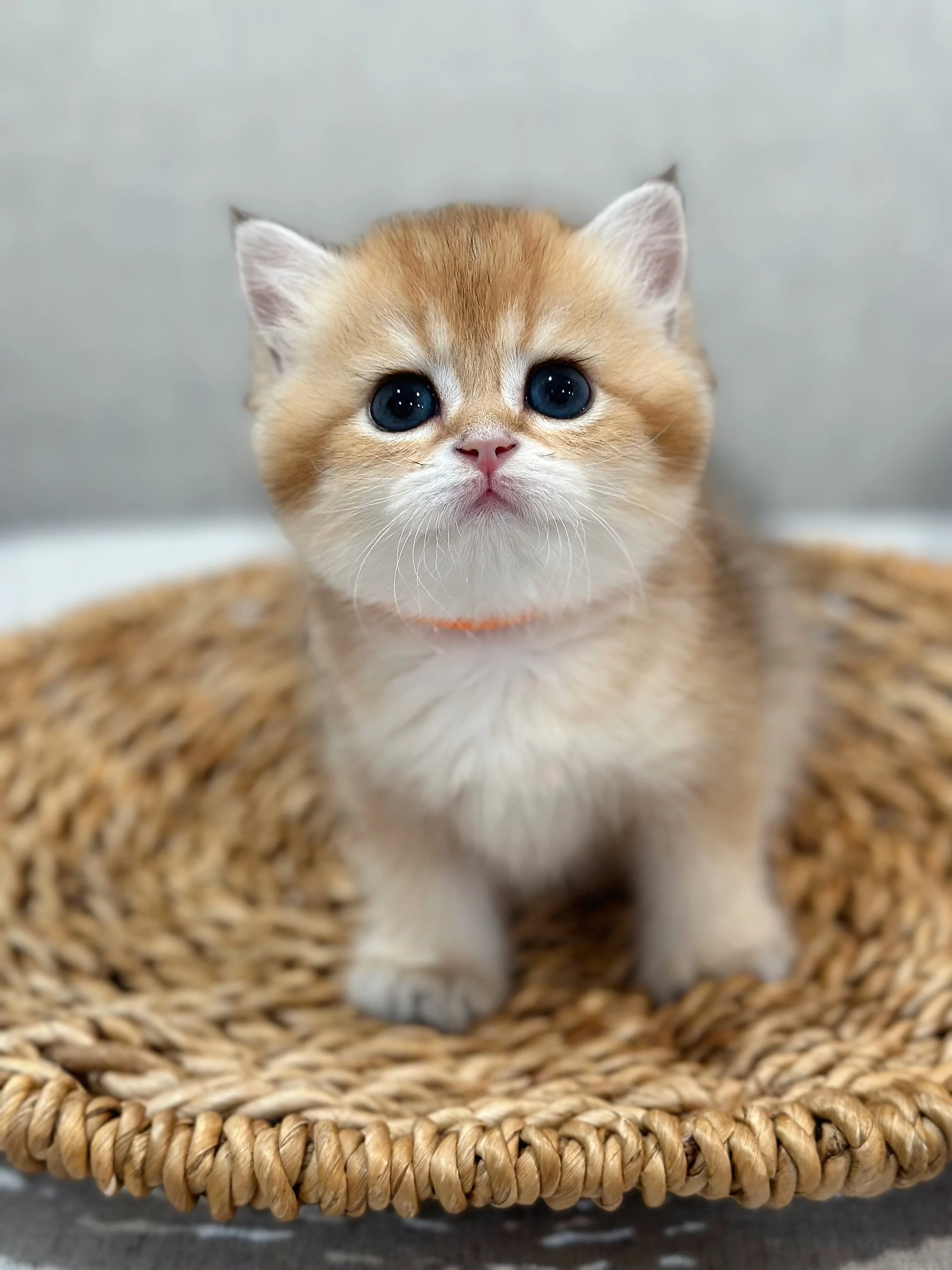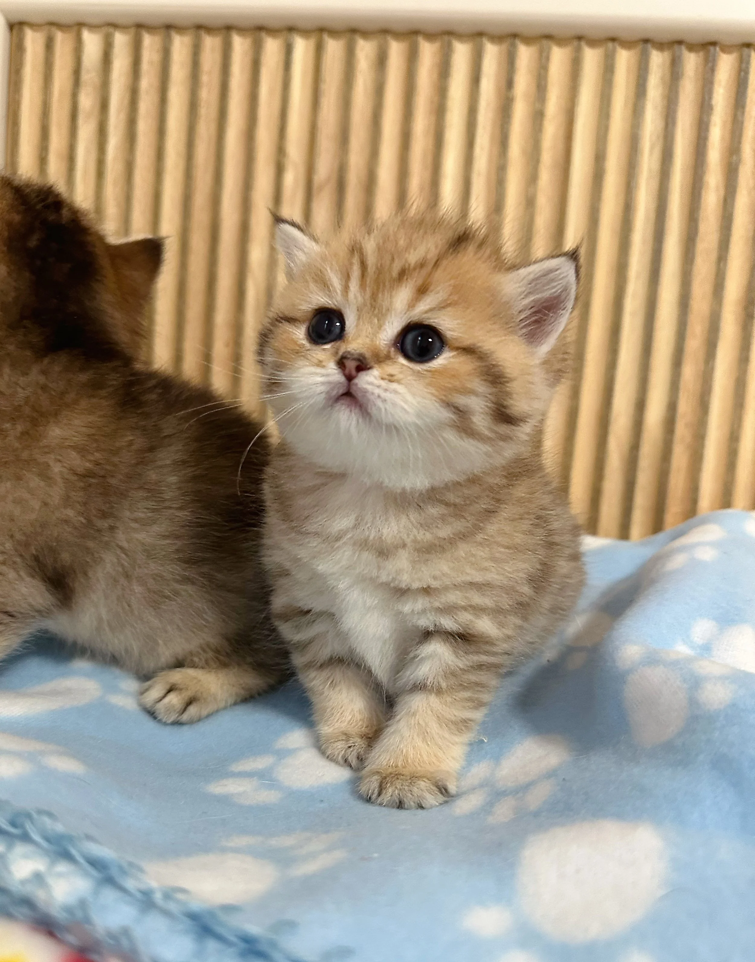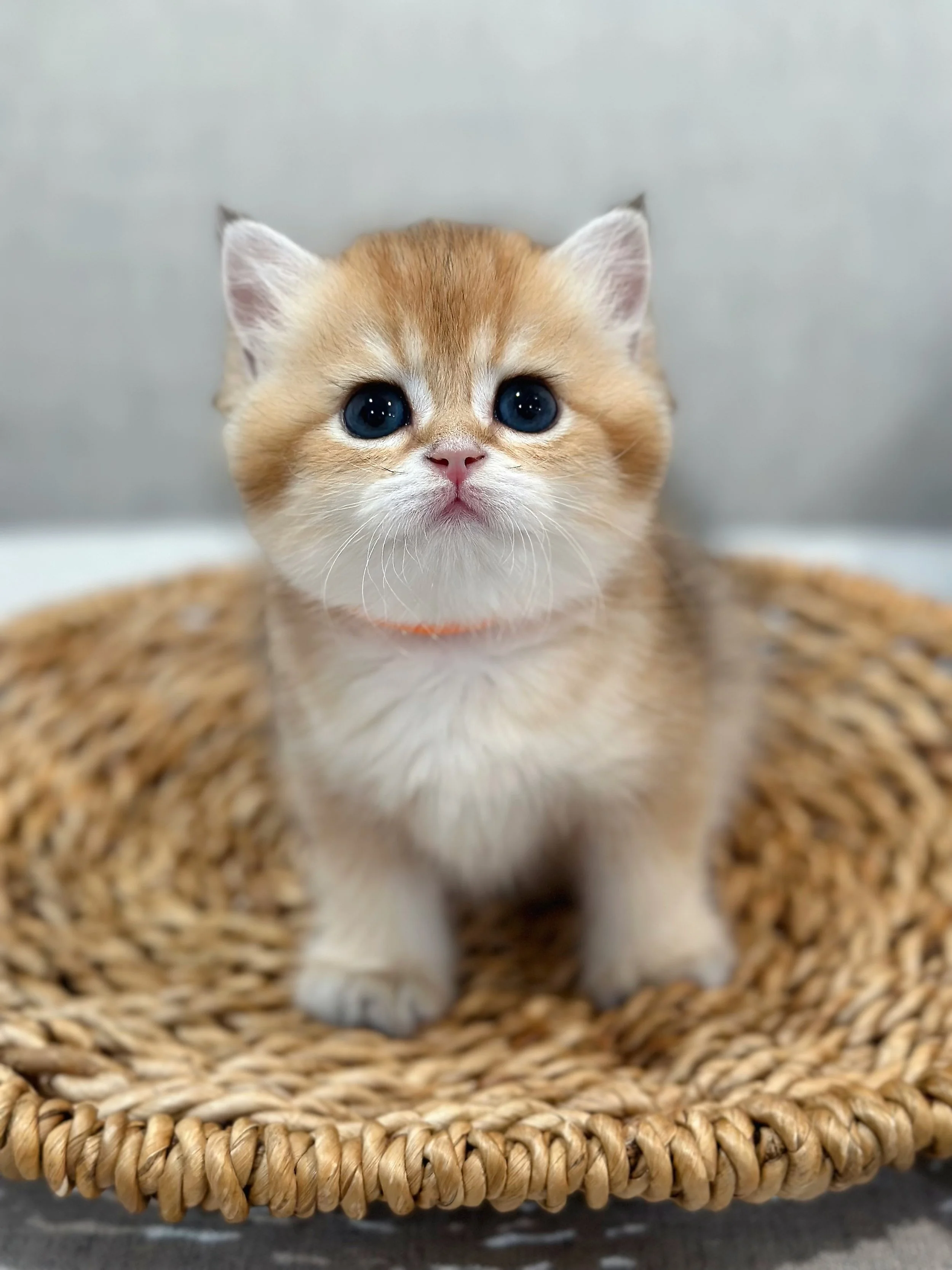 Baby girl was born on March 18, 2023. She is a British Short Hair kitten with a blue golden coat, color code AY12. She was a surprise addition to this litter; we were expecting three babies based on the X-ray, but we got our fourth kitten unexpectedly. She has a warm pinky base tone and light grey hair tips. She is very adorable with a very sweet personality.