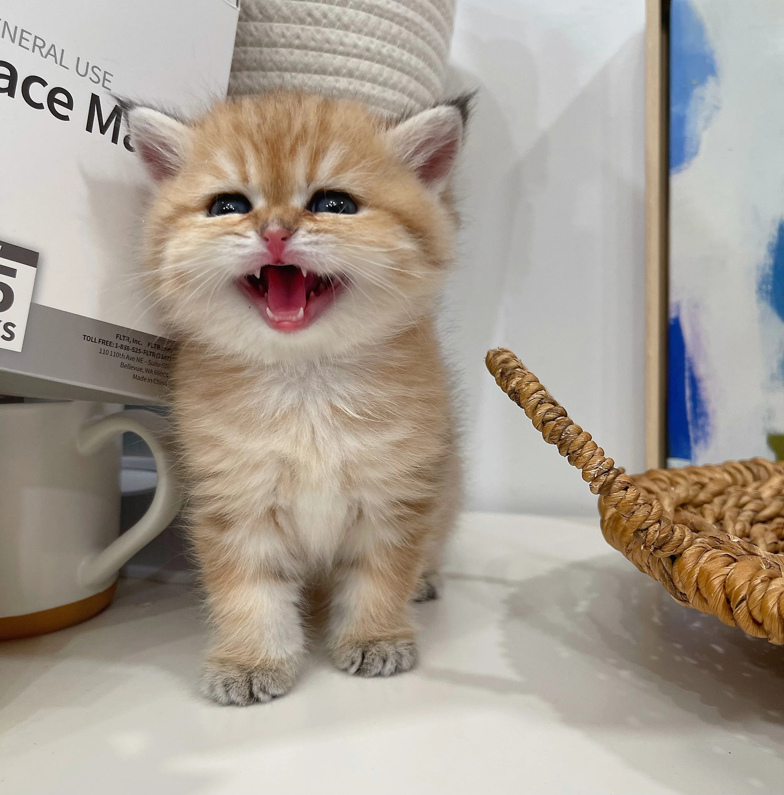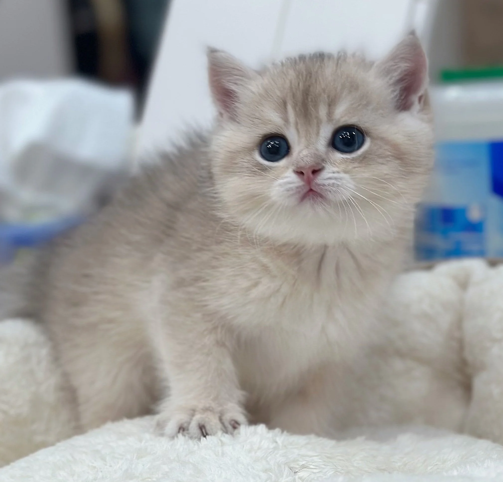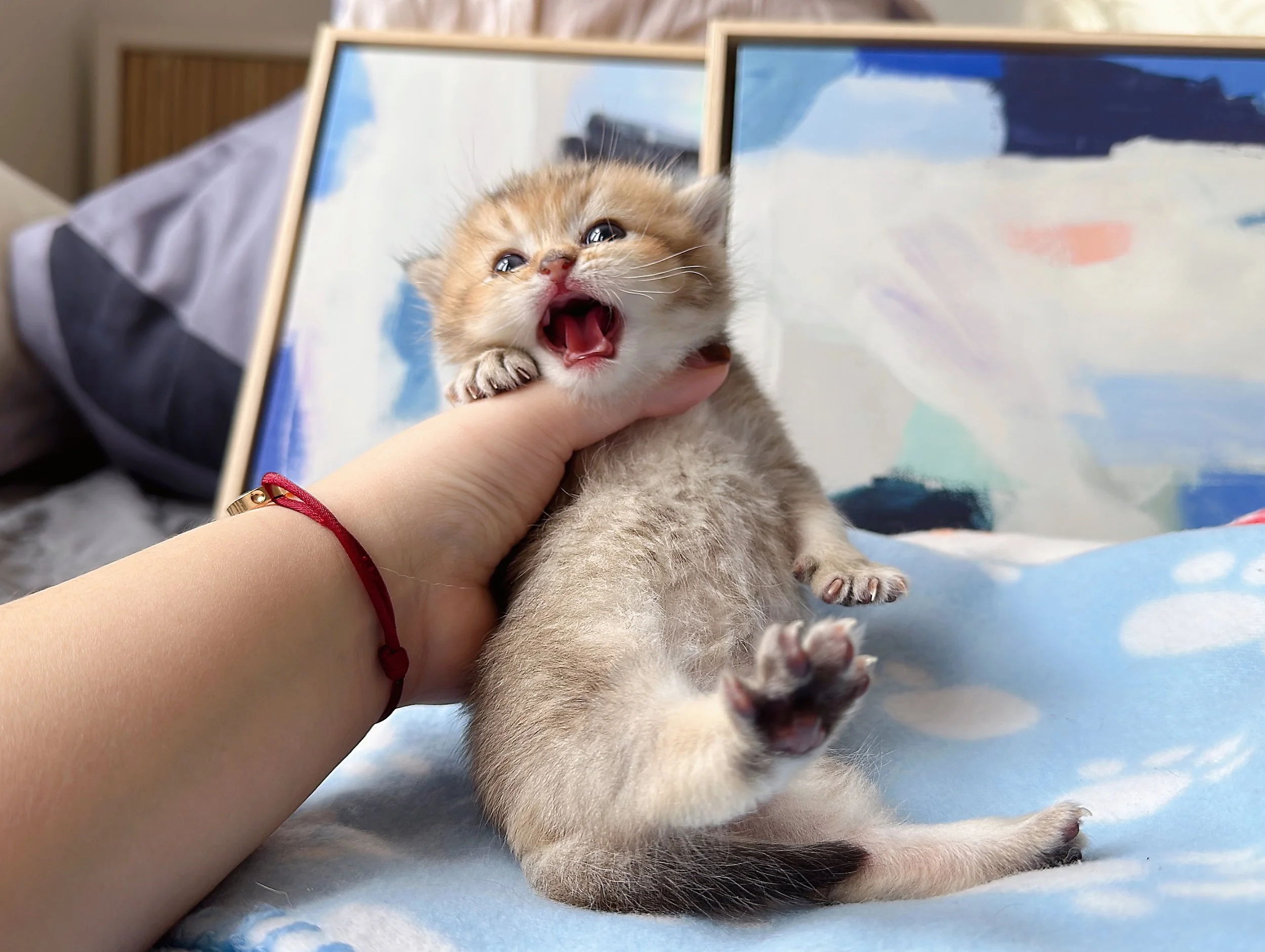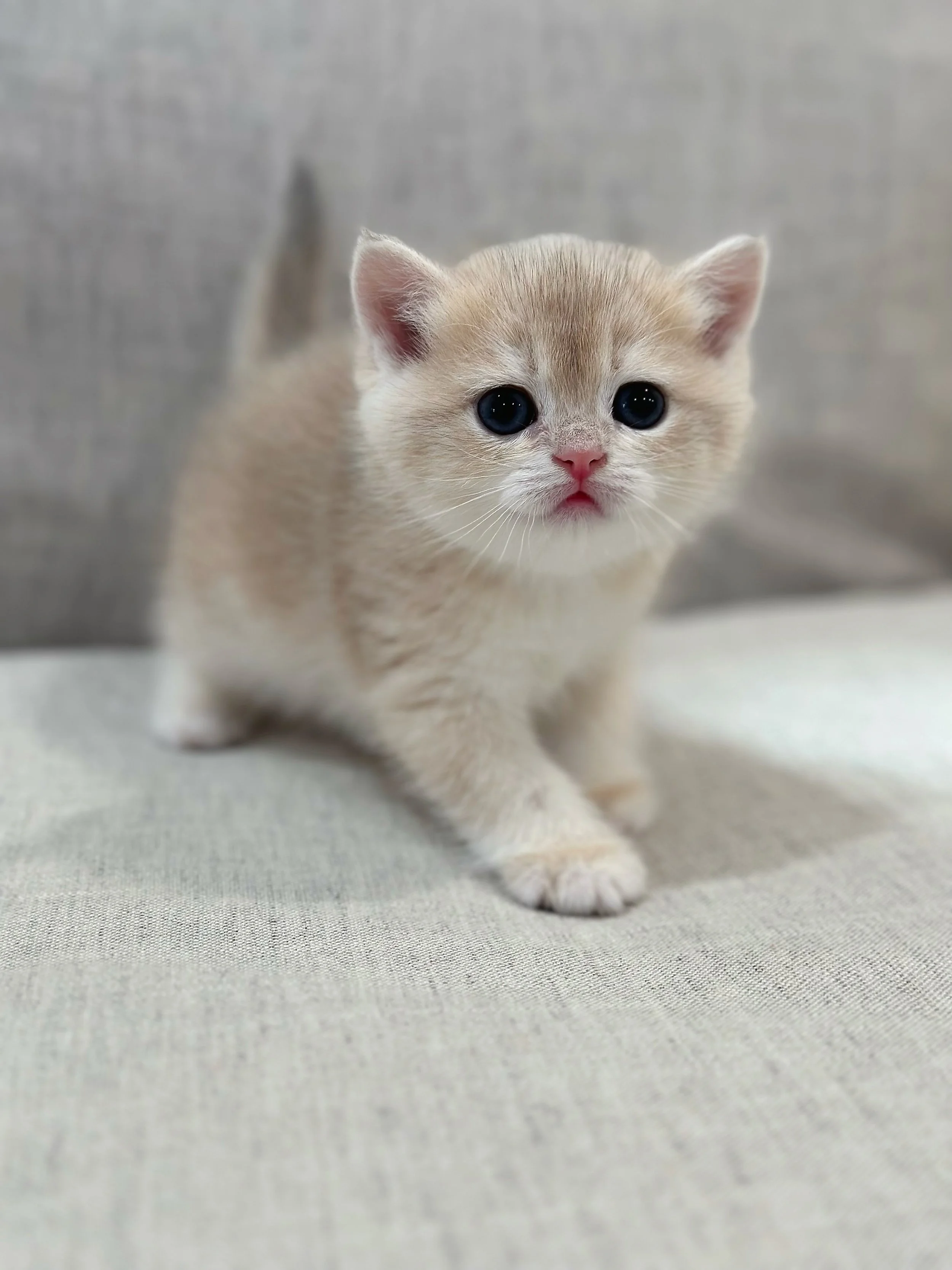 Baby girl was born on March 18, 2023. She is a British Short Hair kitten with a blue golden coat, color code AY12. She was a surprise addition to this litter; we were expecting three babies based on the X-ray, but we got our fourth kitten unexpectedly. She has a warm pinky base tone and light grey hair tips. She is very adorable with a very sweet personality.