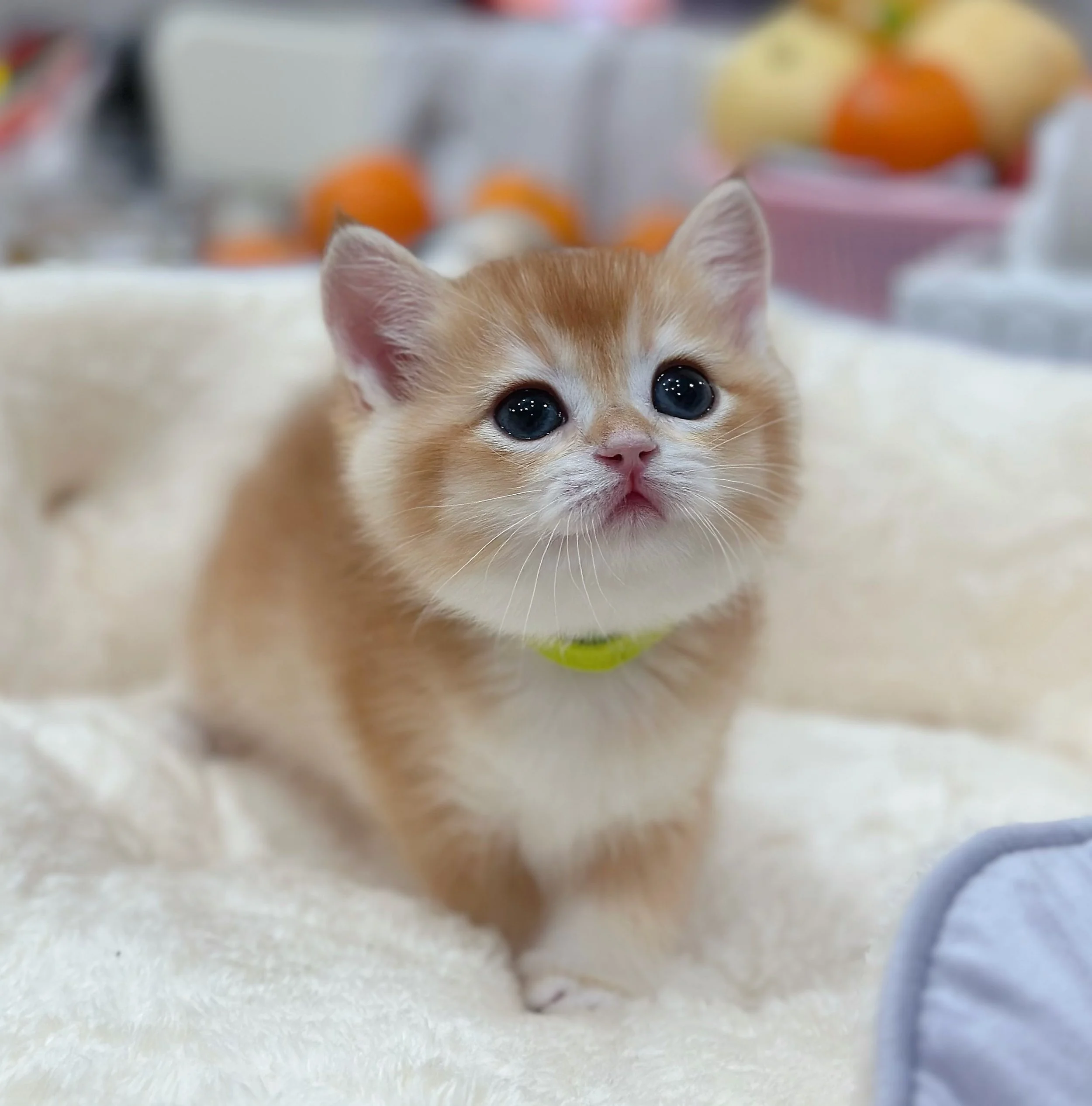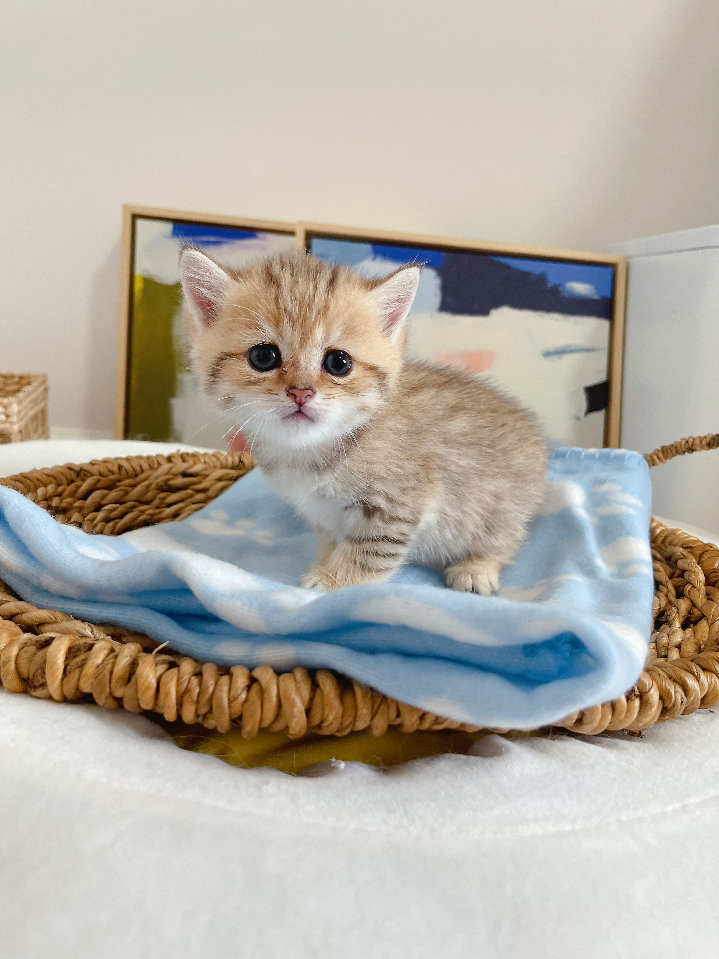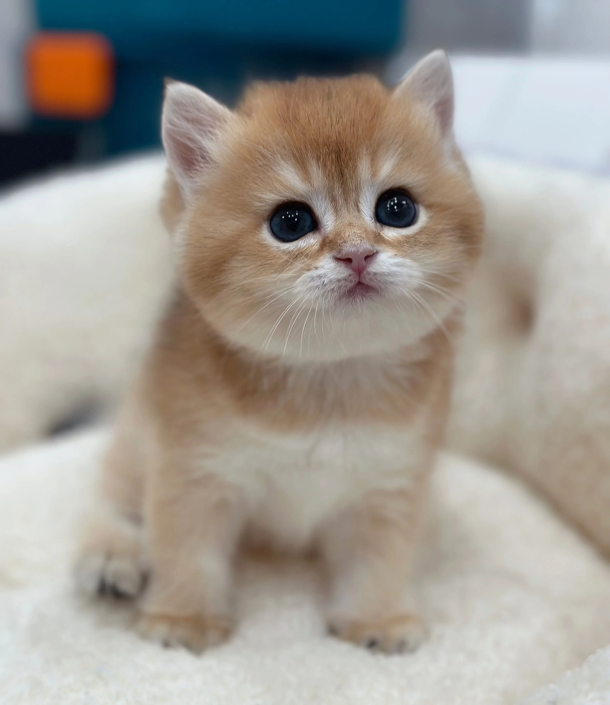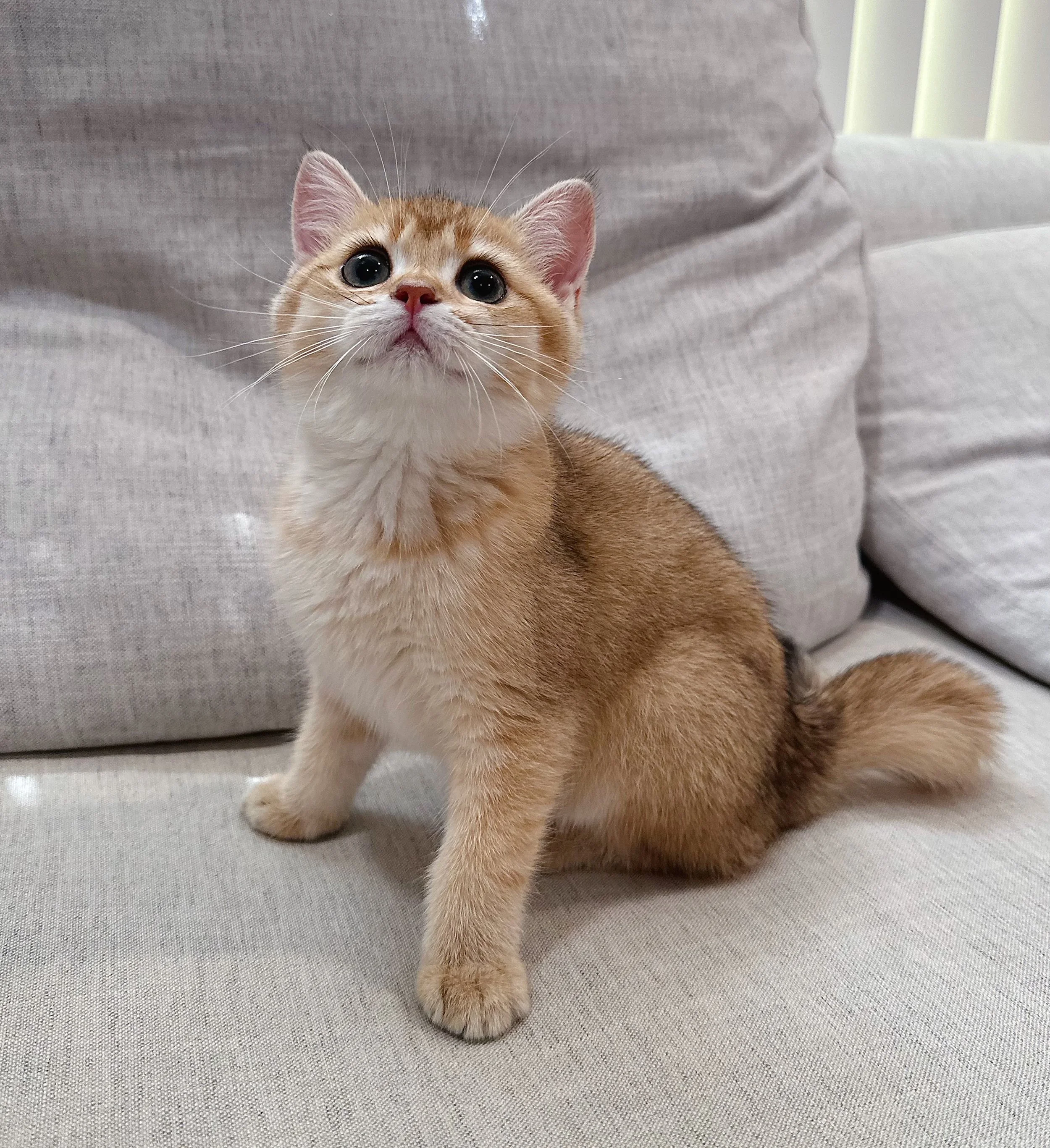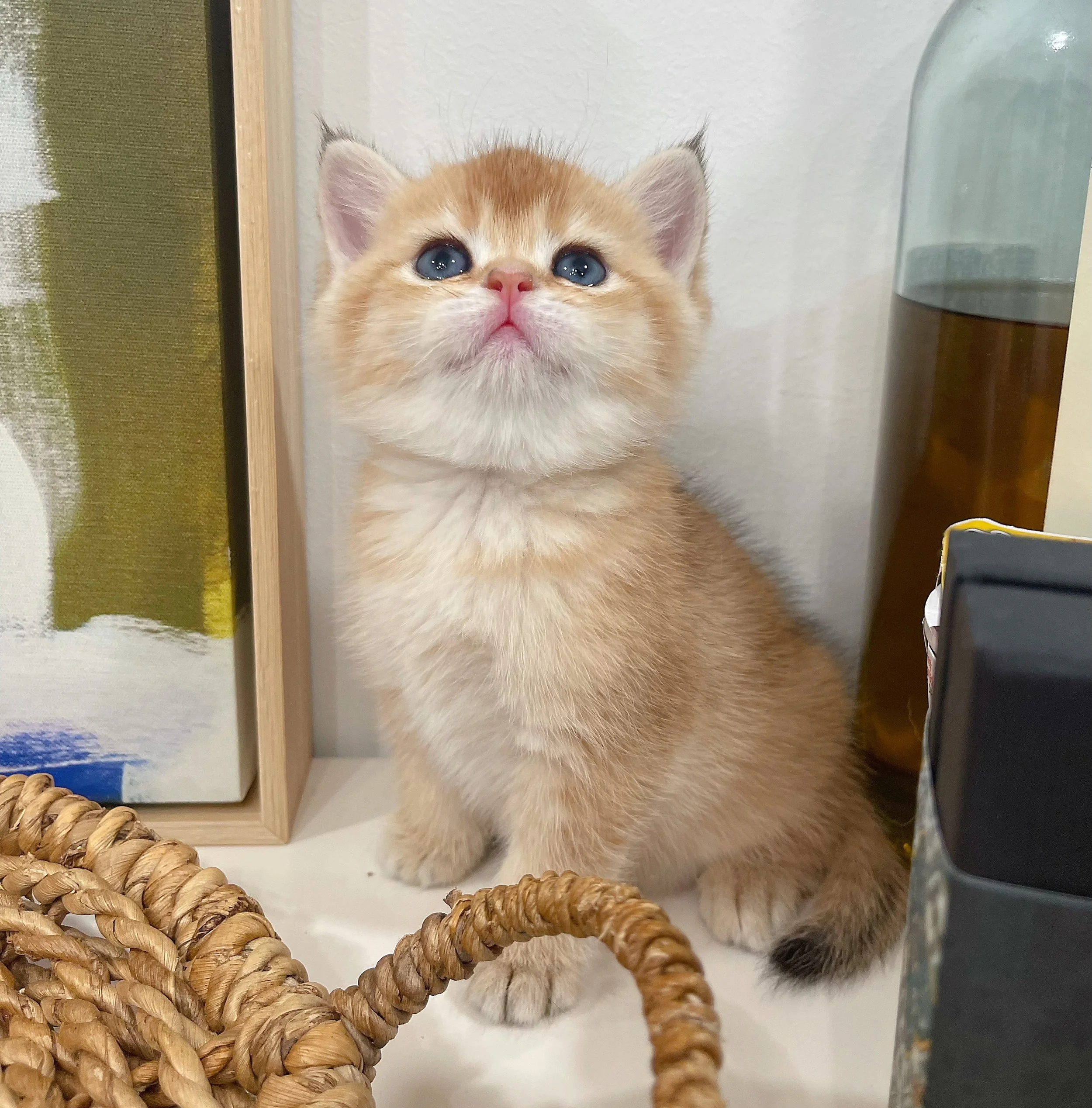 Baby Amadeus is a golden British Short Hair boy, color code NY25. He has a super round face and a super chubby body. He is always full of energy, super active, and loves hugs.