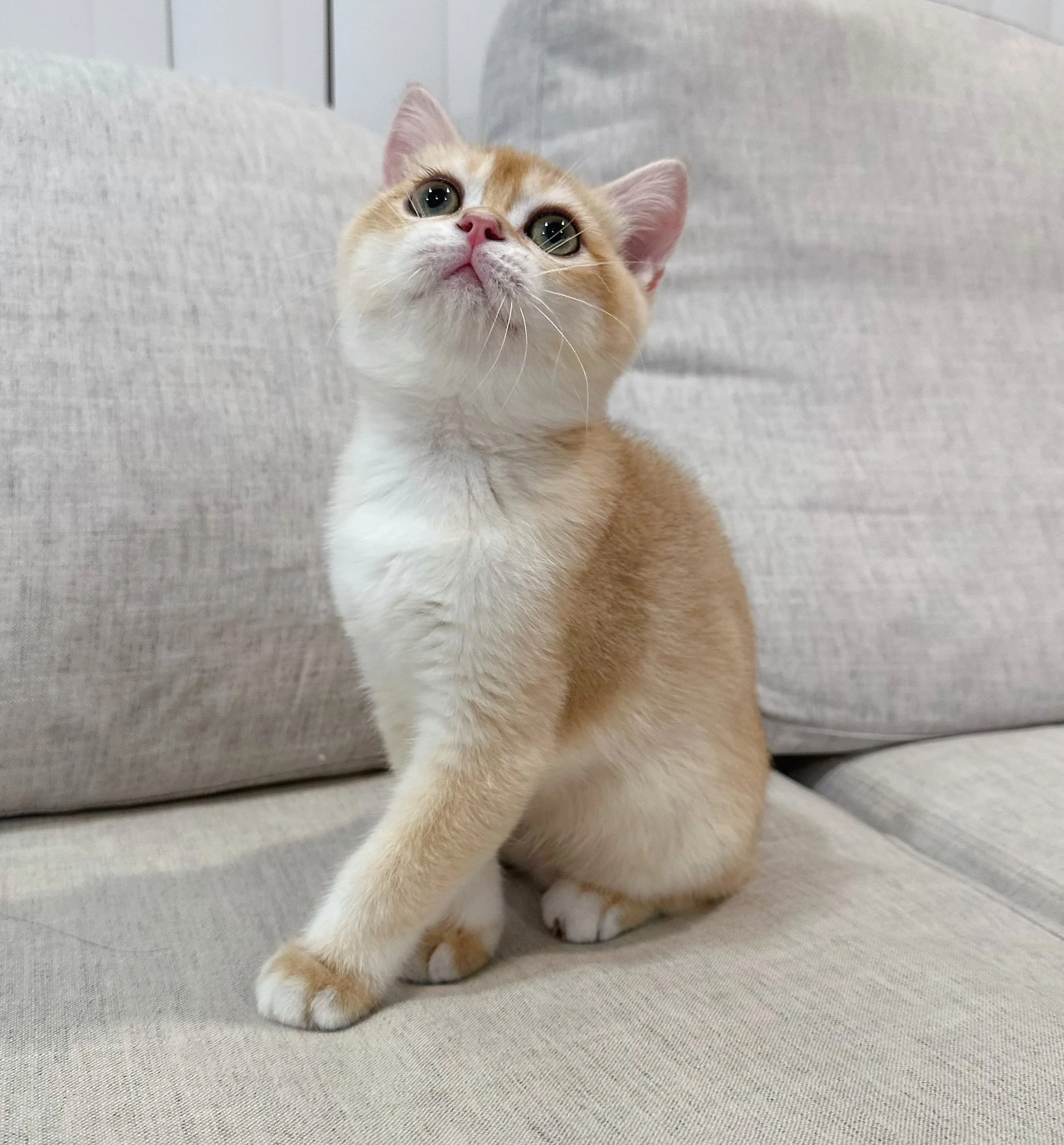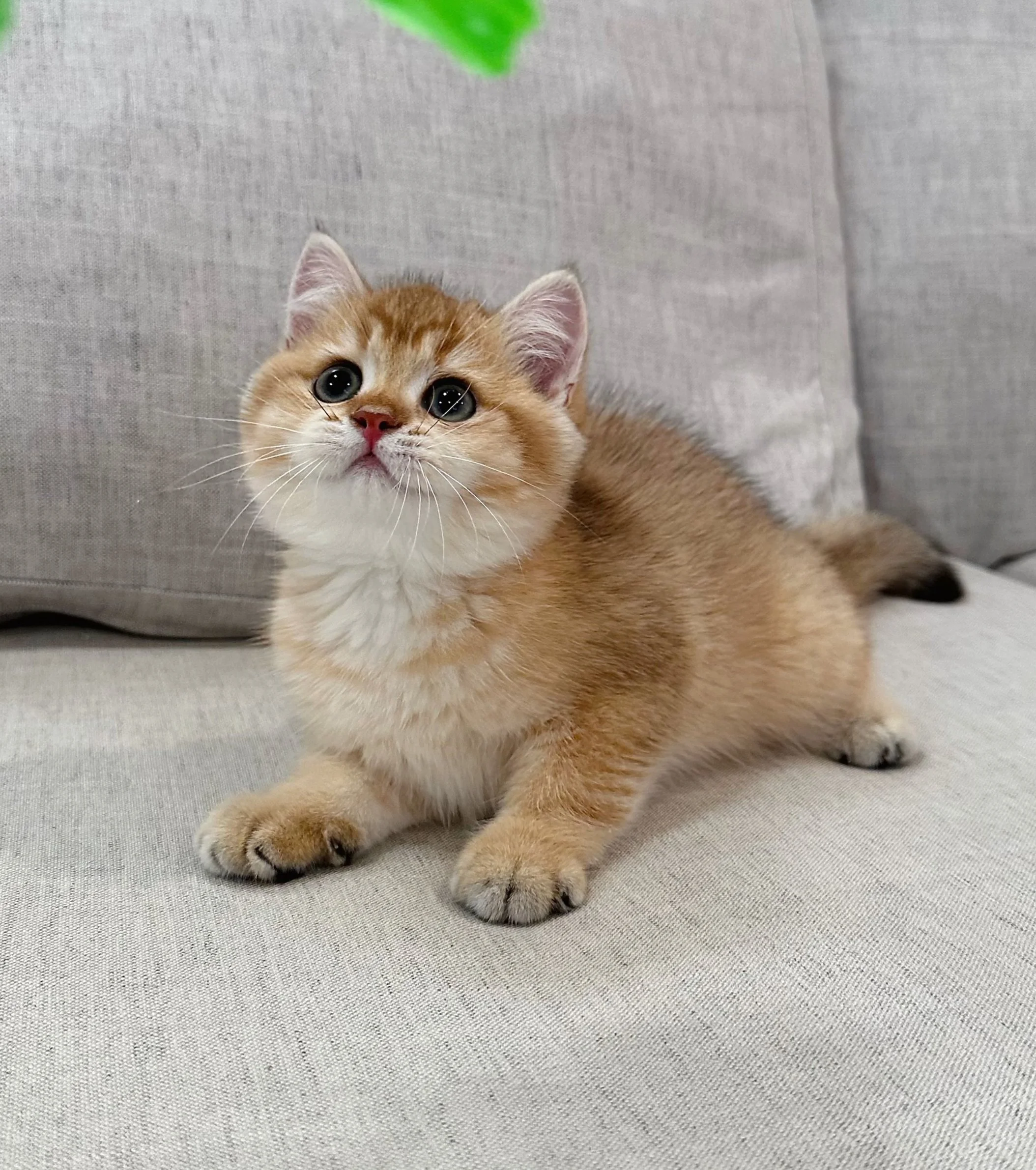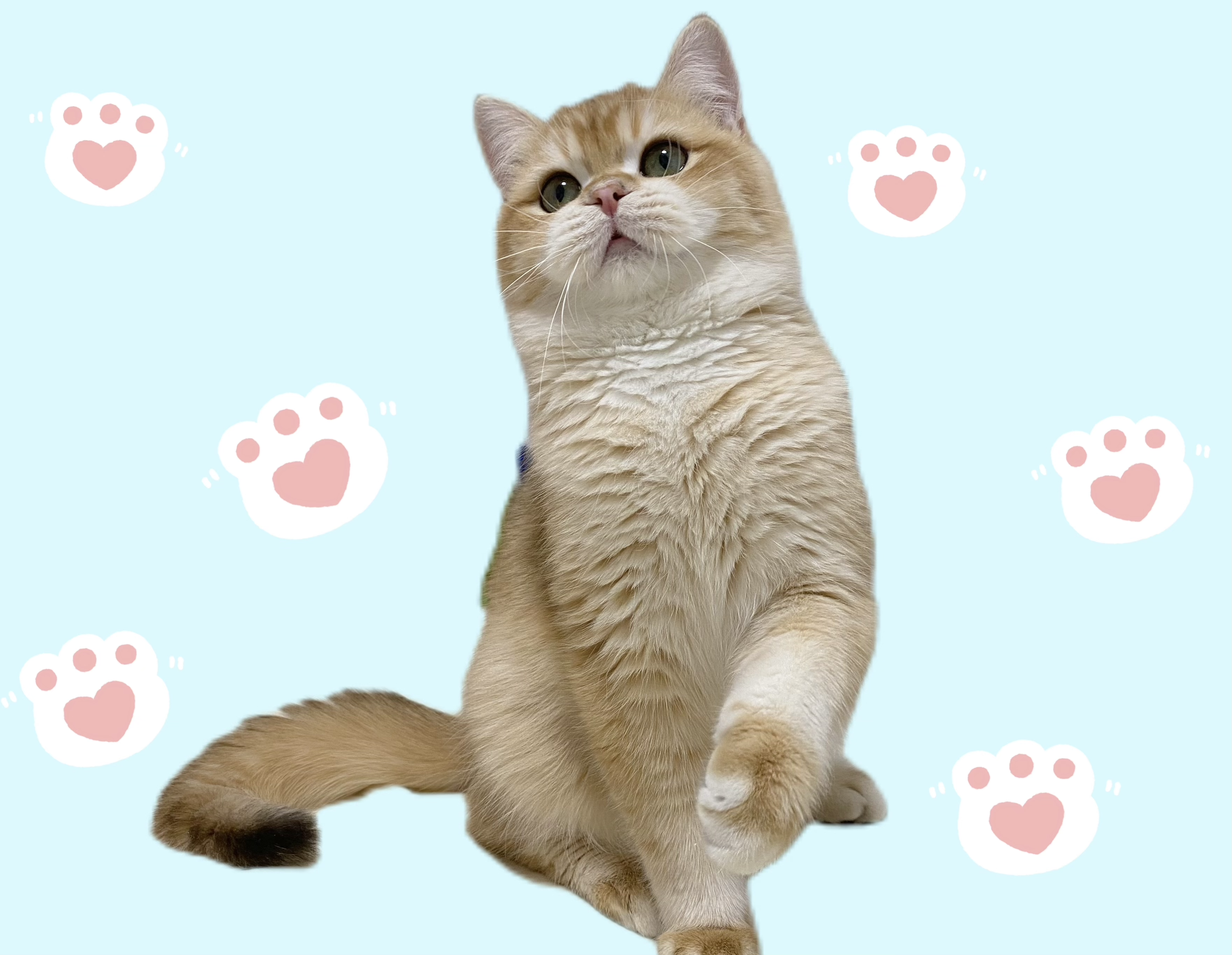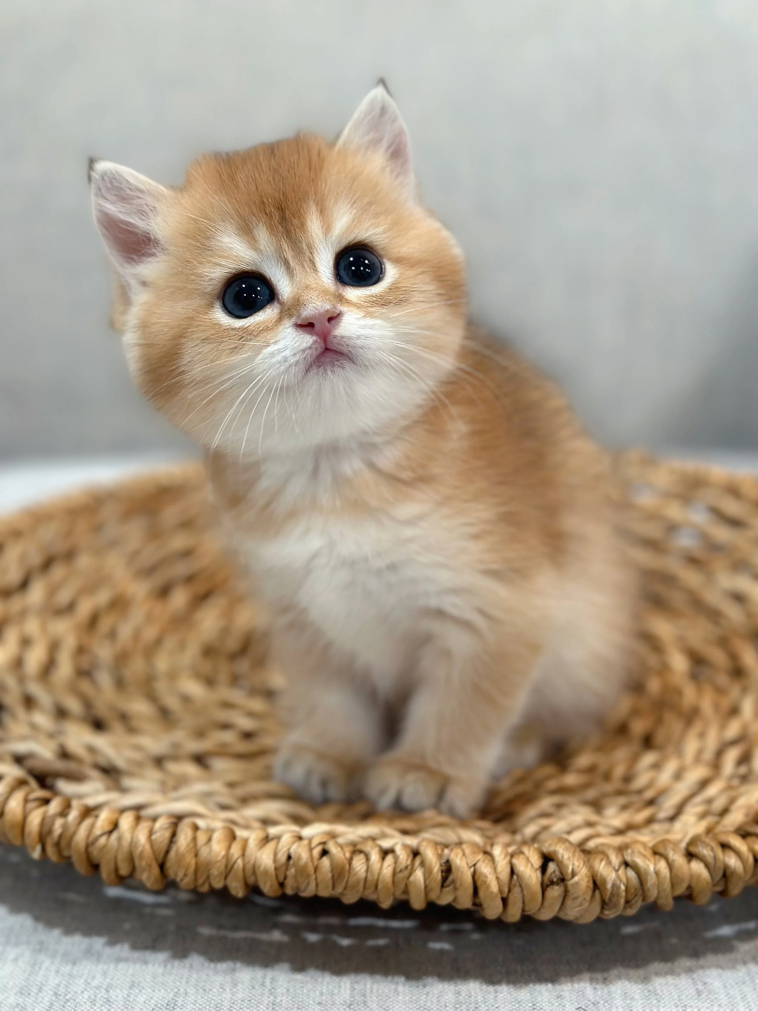 Baby Amadeus is a golden British Short Hair boy, color code NY25. He has a super round face and a super chubby body. He is always full of energy, super active, and loves hugs.