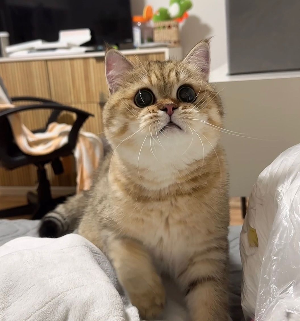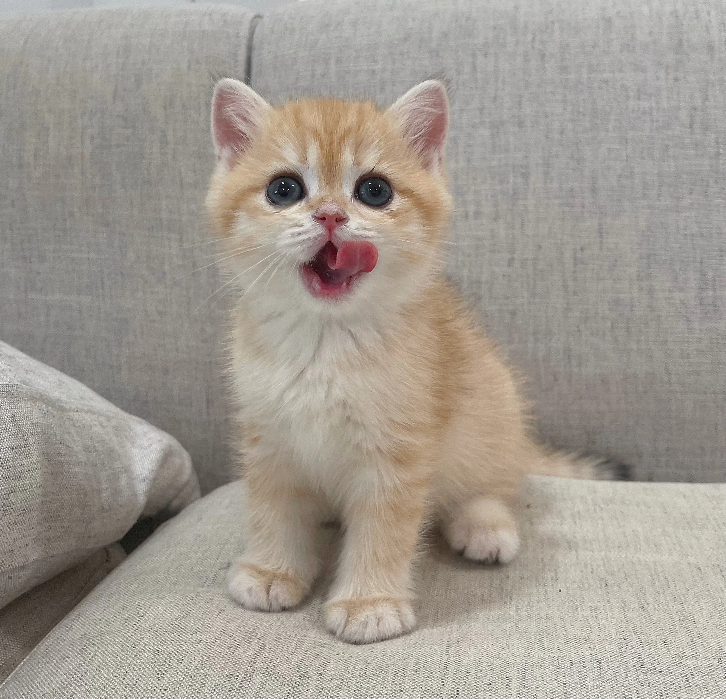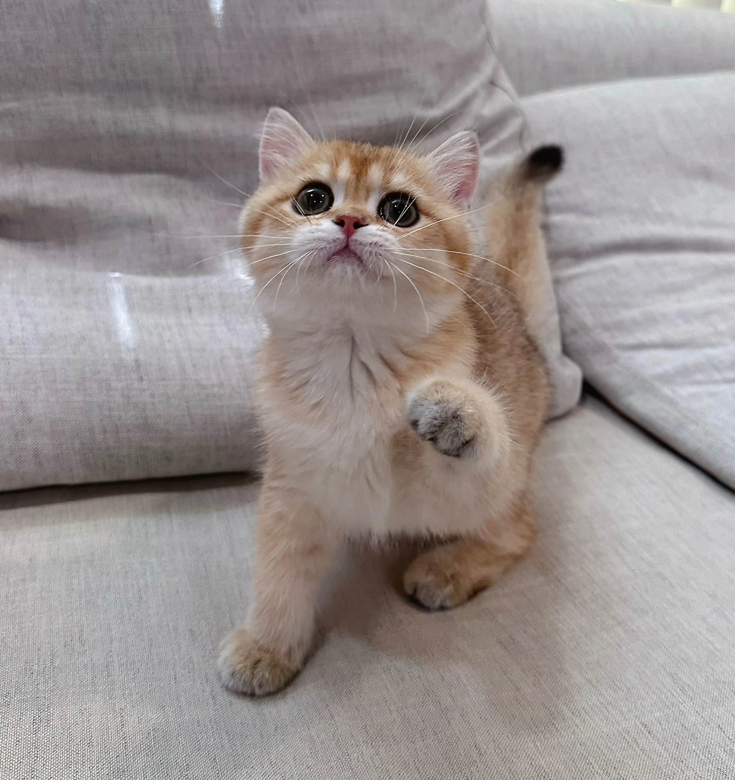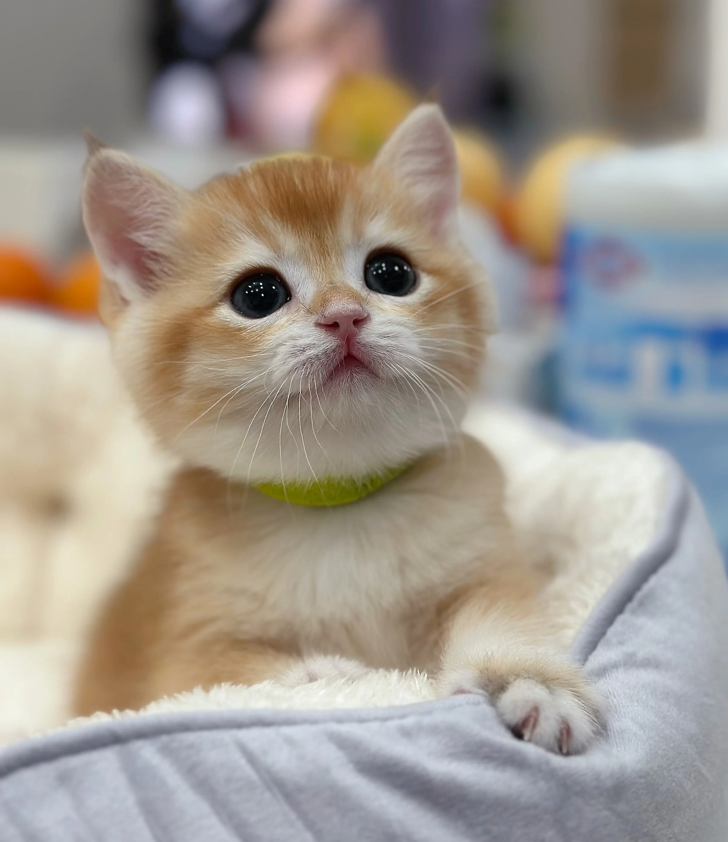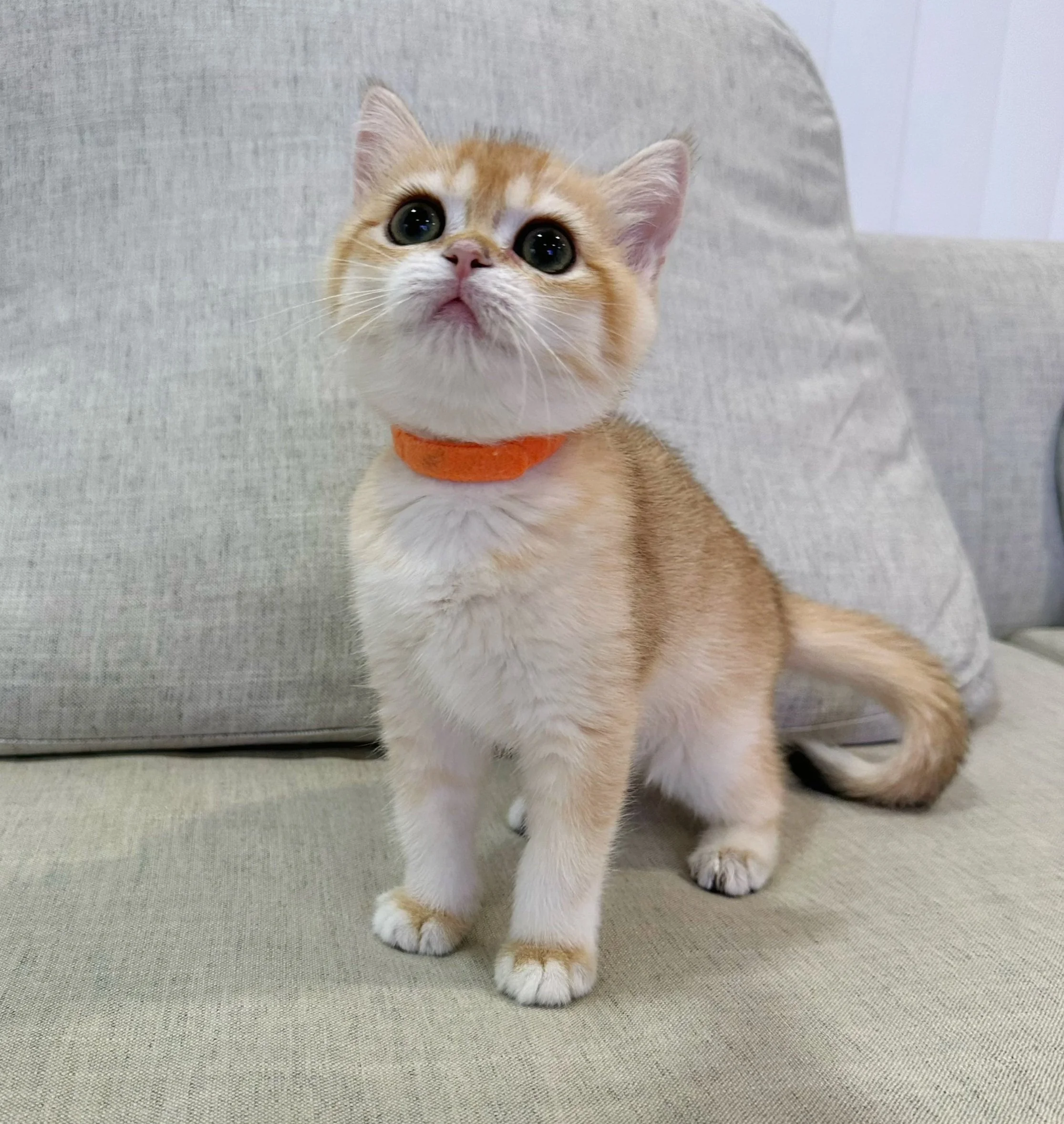 Baby Amadeus is a golden British Short Hair boy, color code NY25. He has a super round face and a super chubby body. He is always full of energy, super active, and loves hugs.