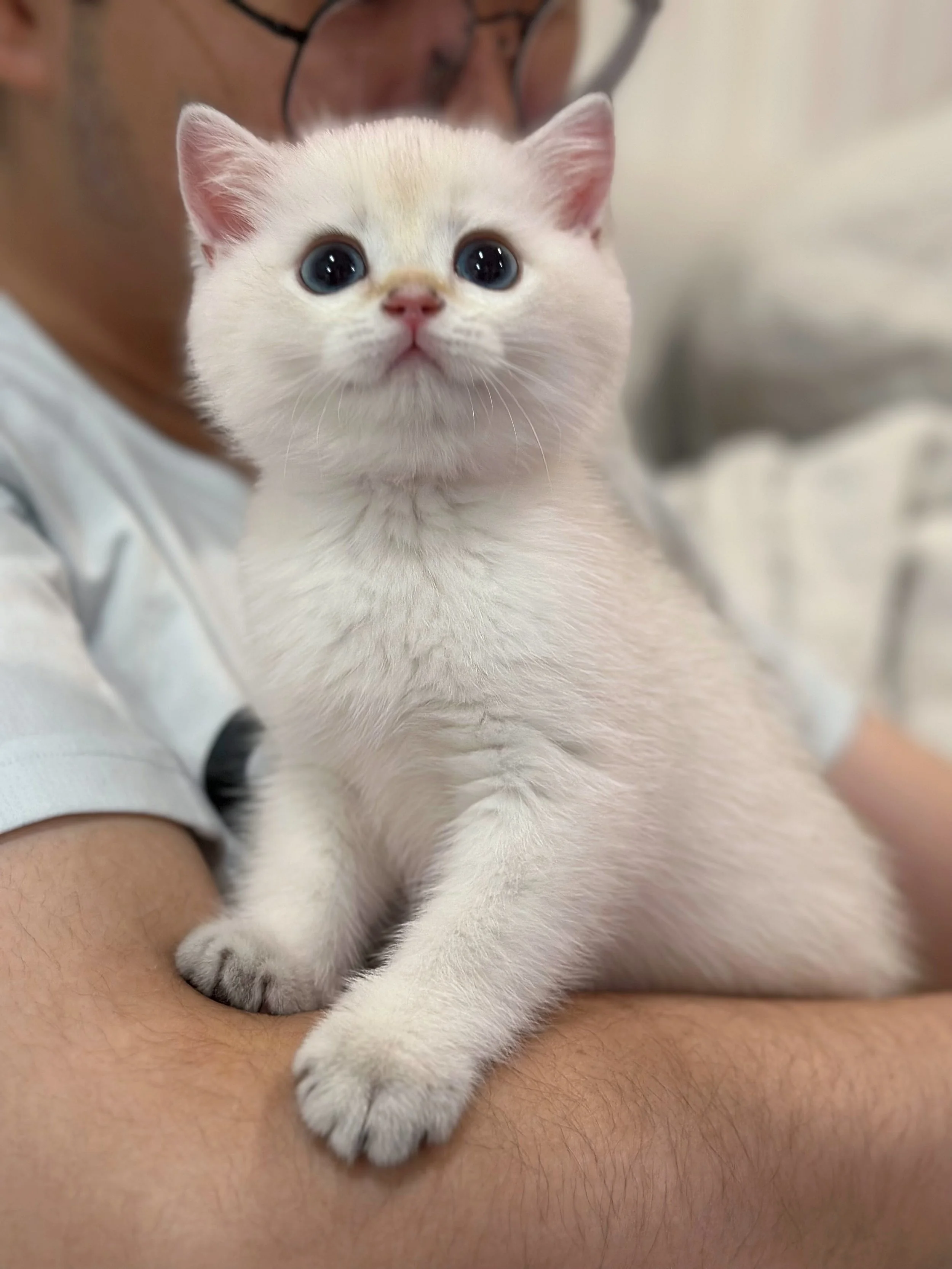 Baby boy is a Golden Point British Short Hair in color code NY1133. He is our one and only silver shaded kitten of the year, carrying golden blood, which gives him a very unique golden color on his forehead and nose. His back color is white-based with silver hair tips, which will slowly become more prominent as he grows older—a very elegant and beautiful color. He will grow up to have green or bluey-green eyes. Baby boy's eyes, nose, and muzzle shapes are exactly like his dad George's, a perfect combination of both parents! He is a very affectionate baby; he loves asking for hugs and enjoys being picked up, purring every time we hold him in our arms. He is also very playful and gets really happy when playing with other cats, jumping like a little rabbit, which is super adorable.