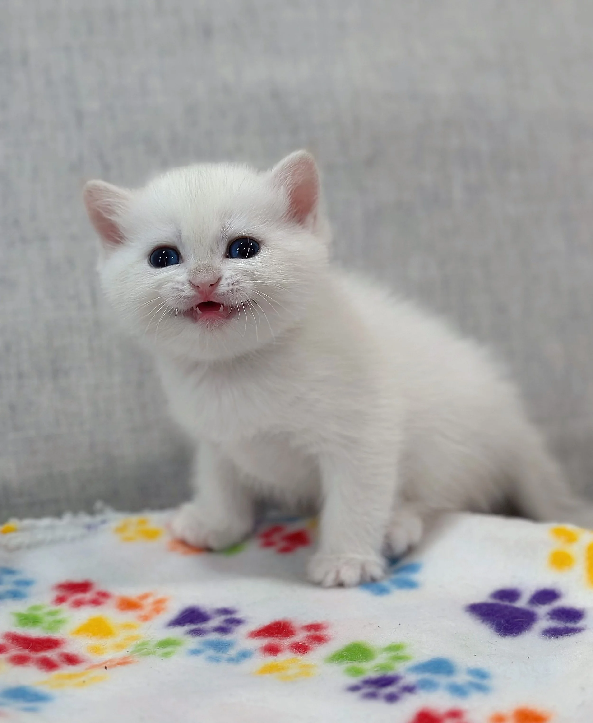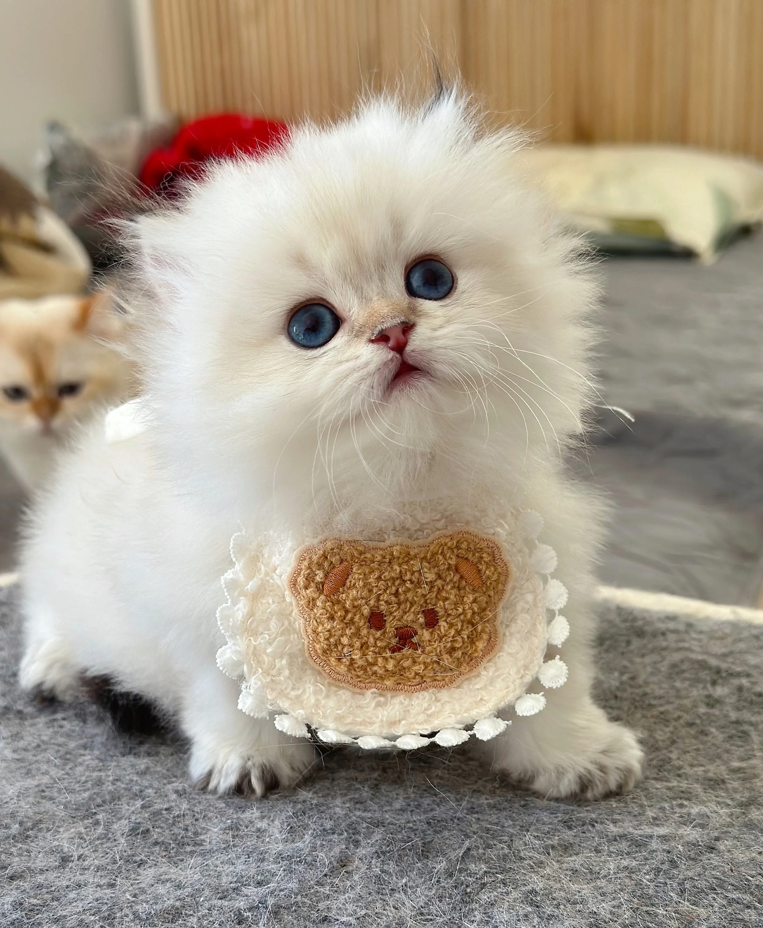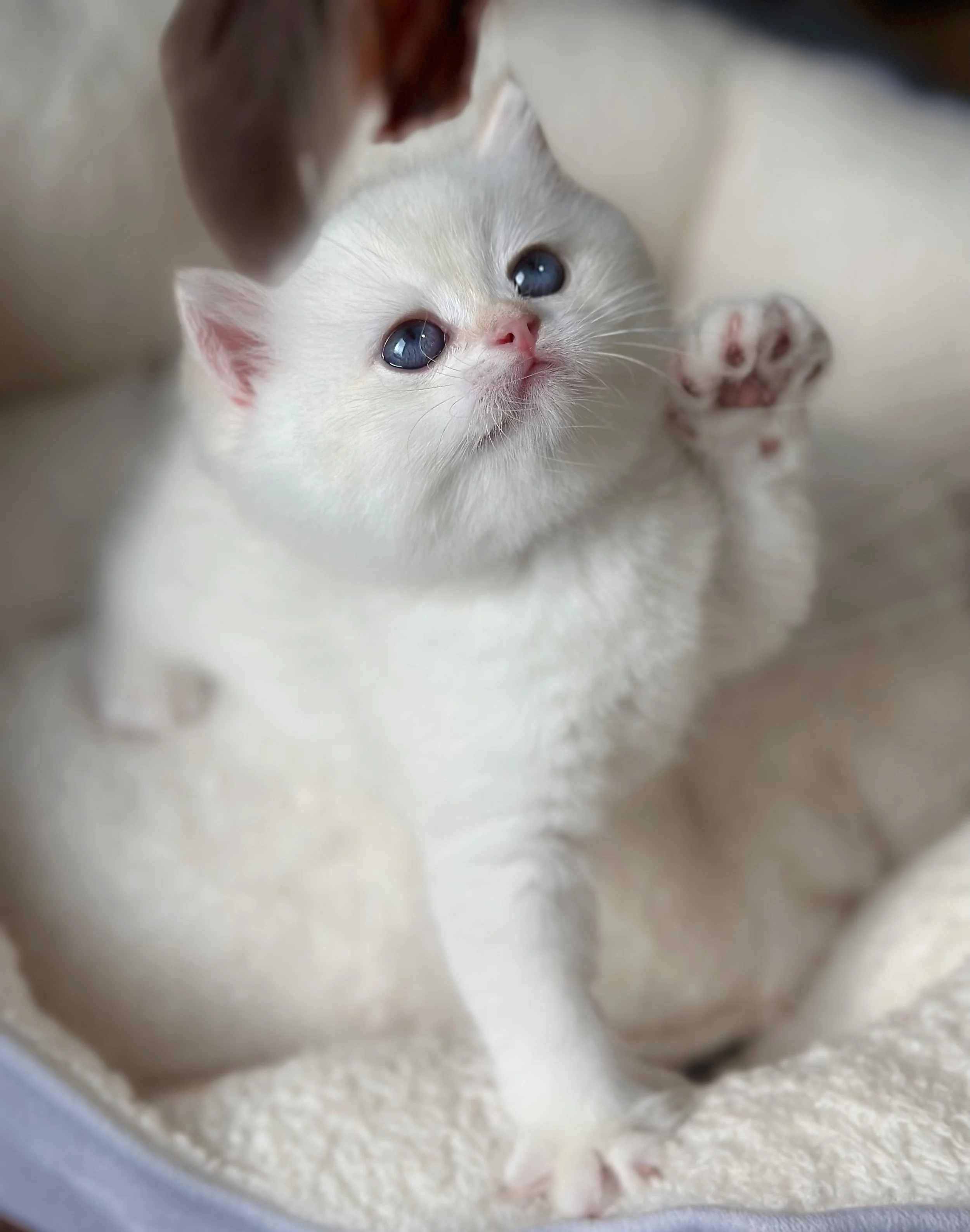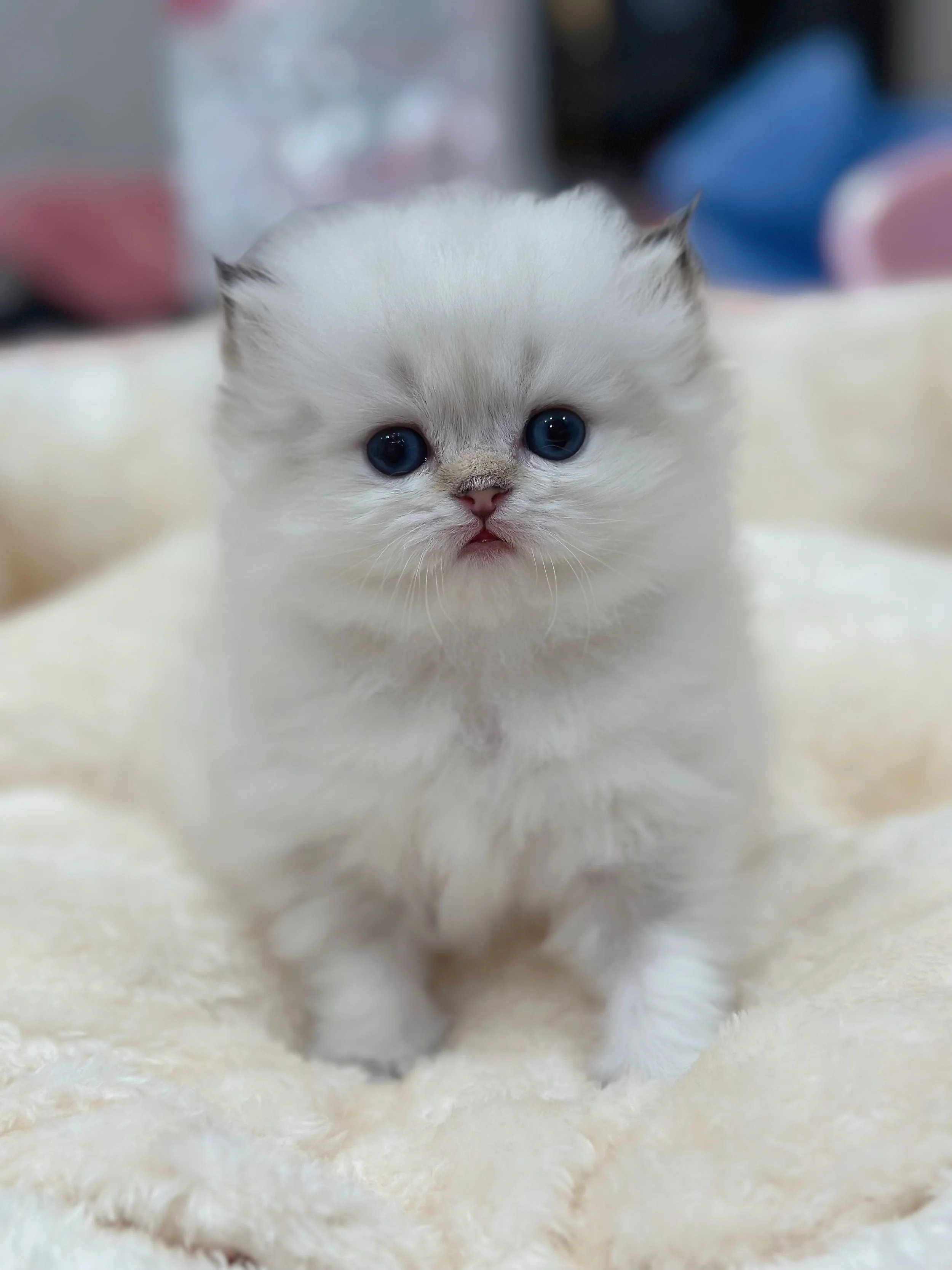 Baby Mochi has a snow-white base coat and bright gold color points, with bright blue eyes just like the sky. She will be staying in the nursery and participating in our breeding program when she grows up.