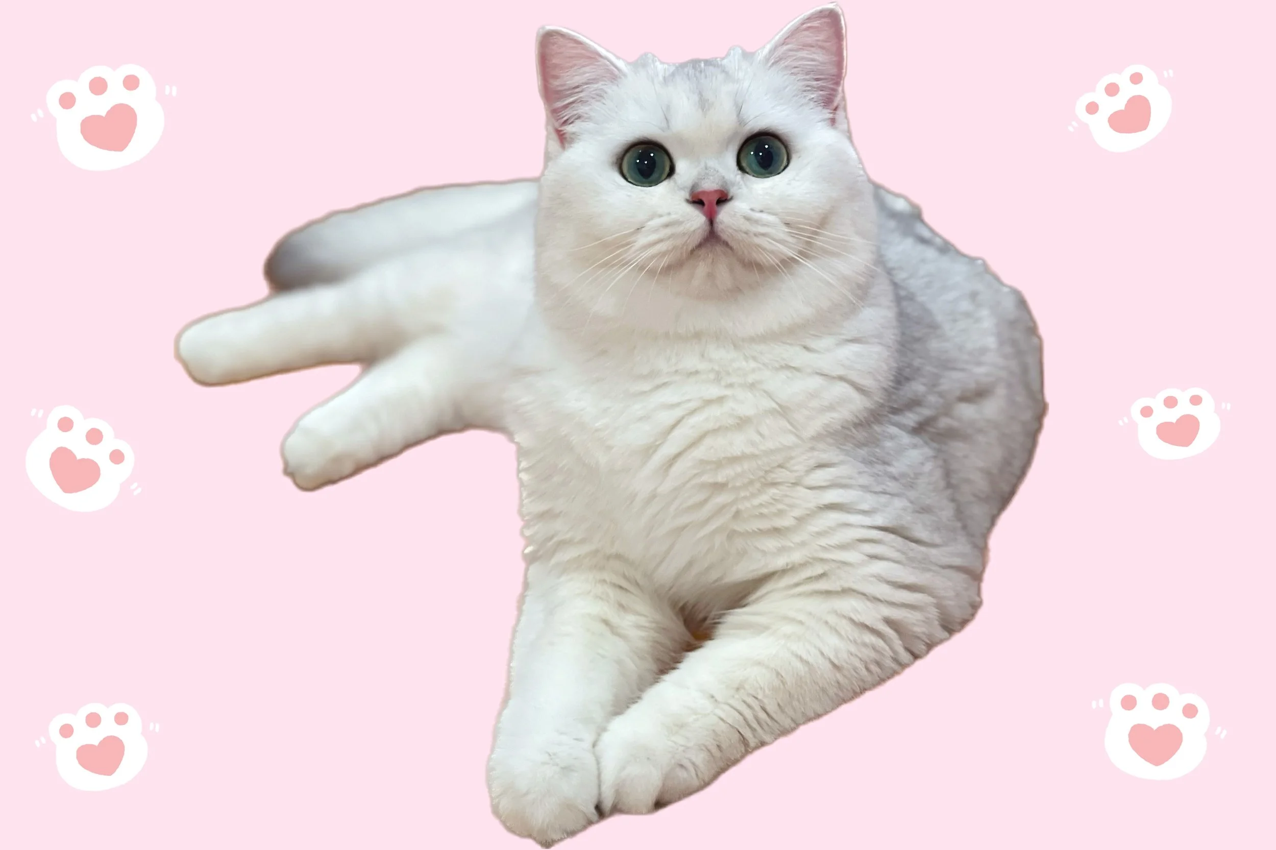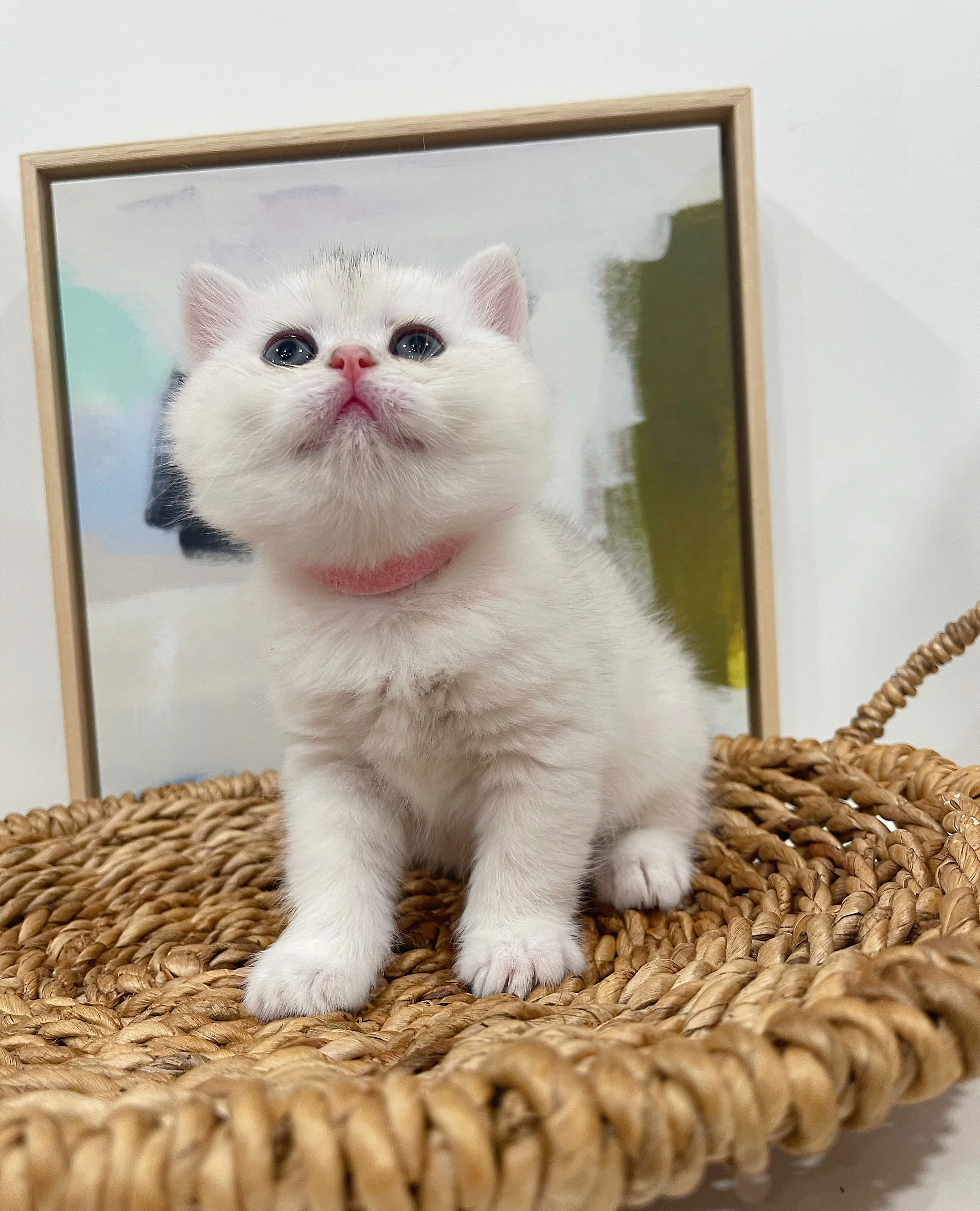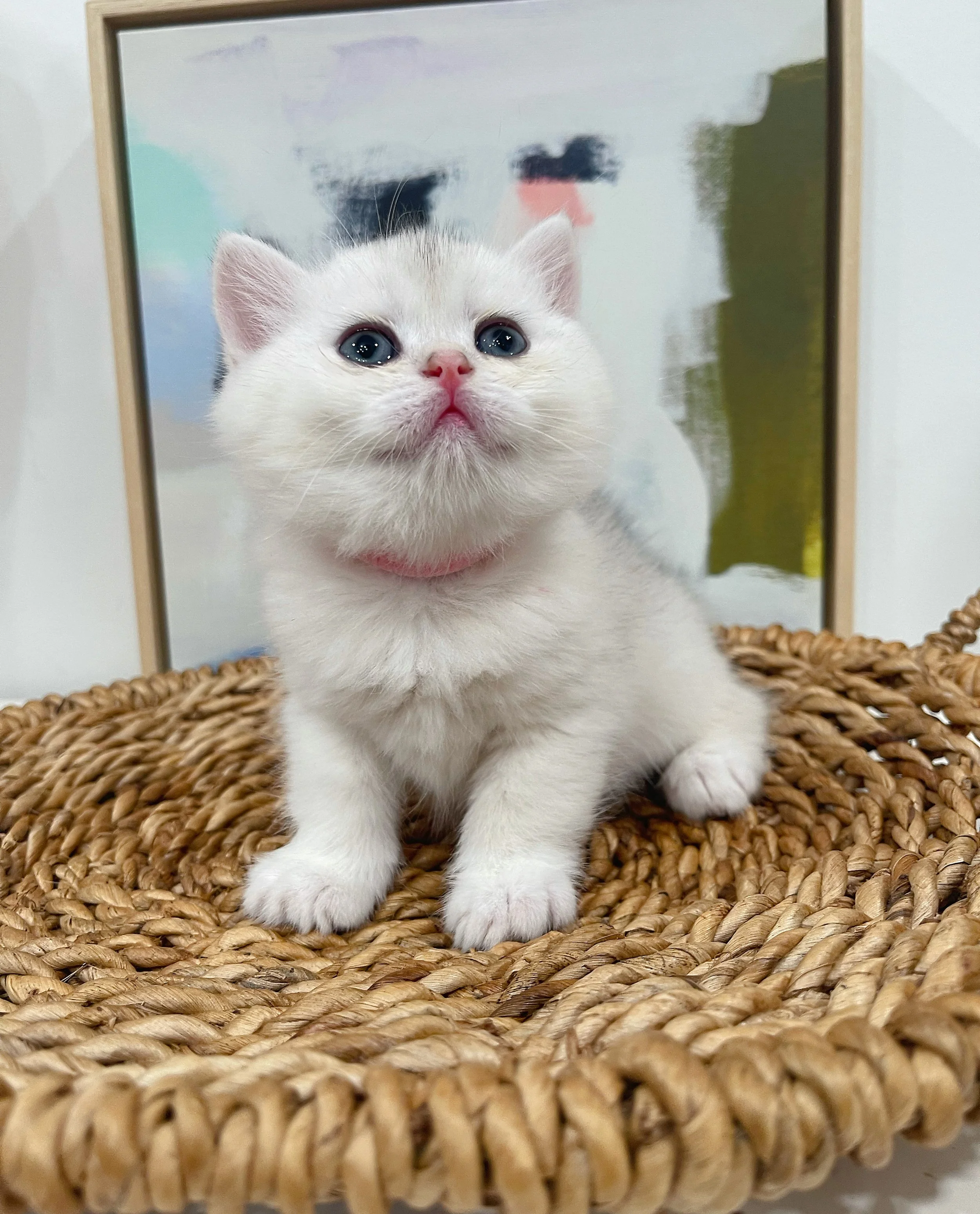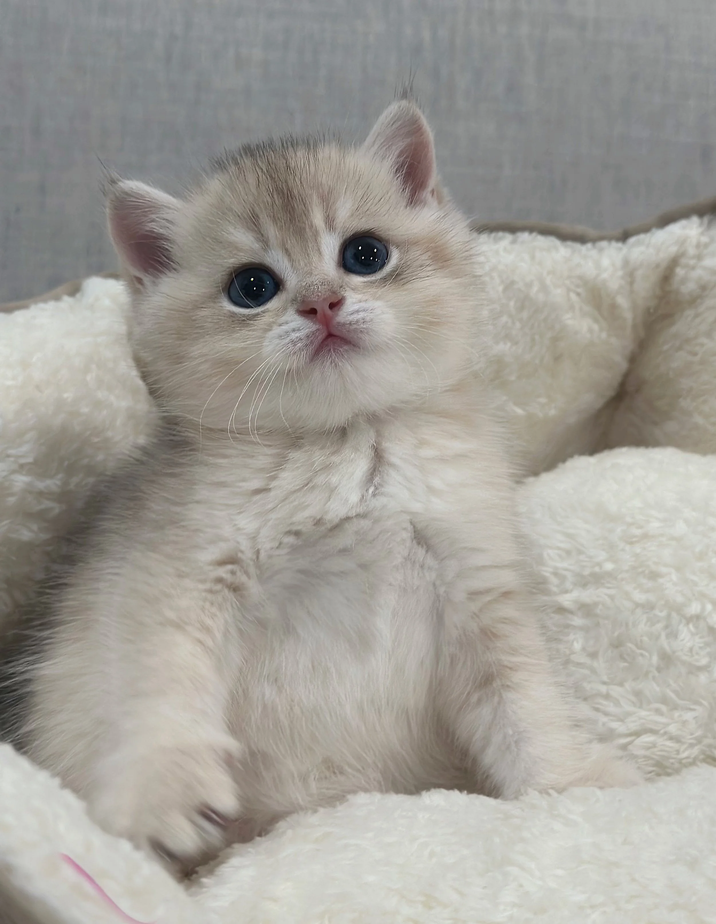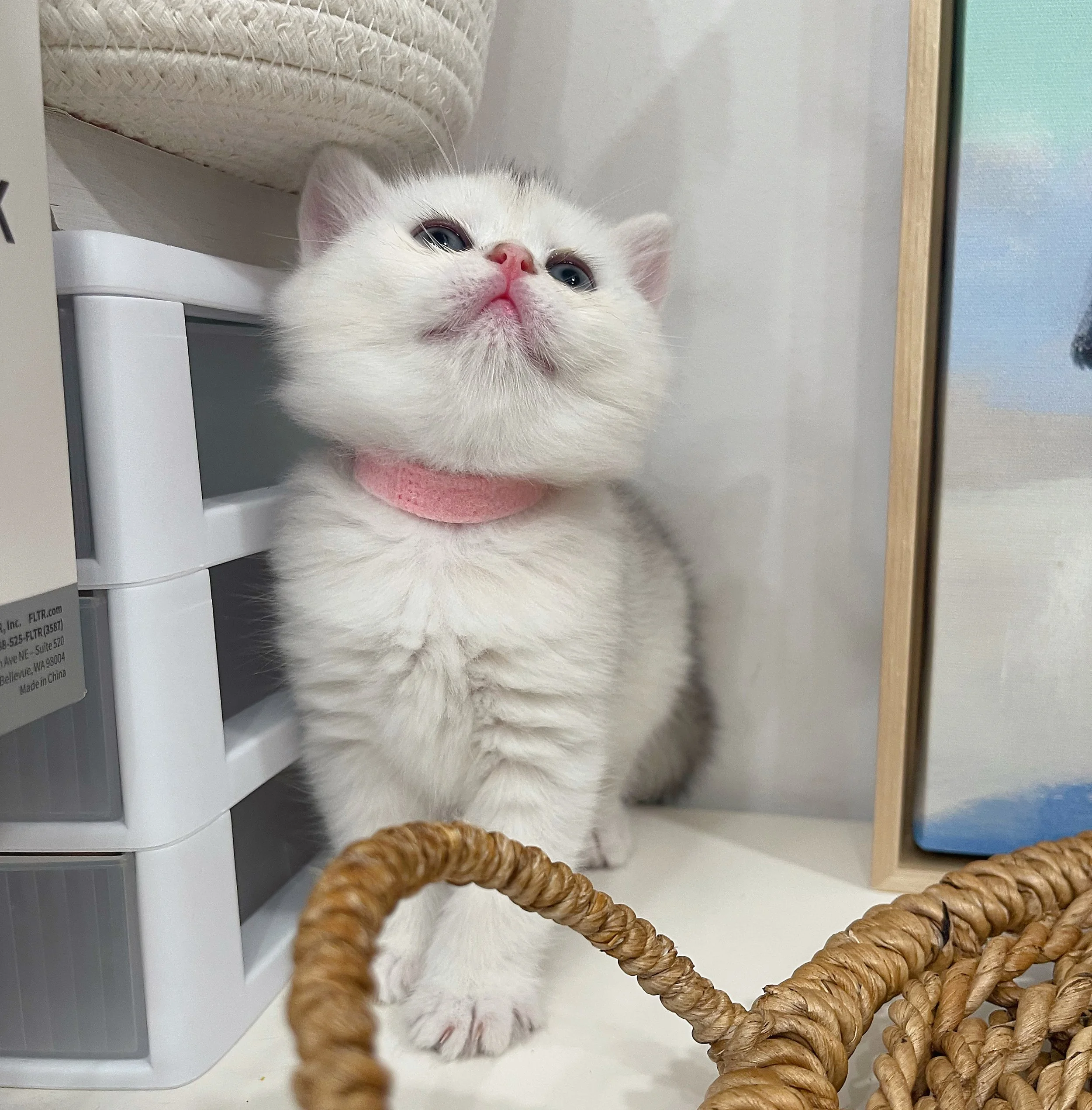 Baby boy F2 is a British Short Hair kitten with color code NS12. He has a very light silver shaded color on his back with a snow-white base tone. He is the chubbiest kitten we have ever had at his age, with a very round face and tiny ears, giving him a very handsome look. His personality is just as sweet as his lovely face.