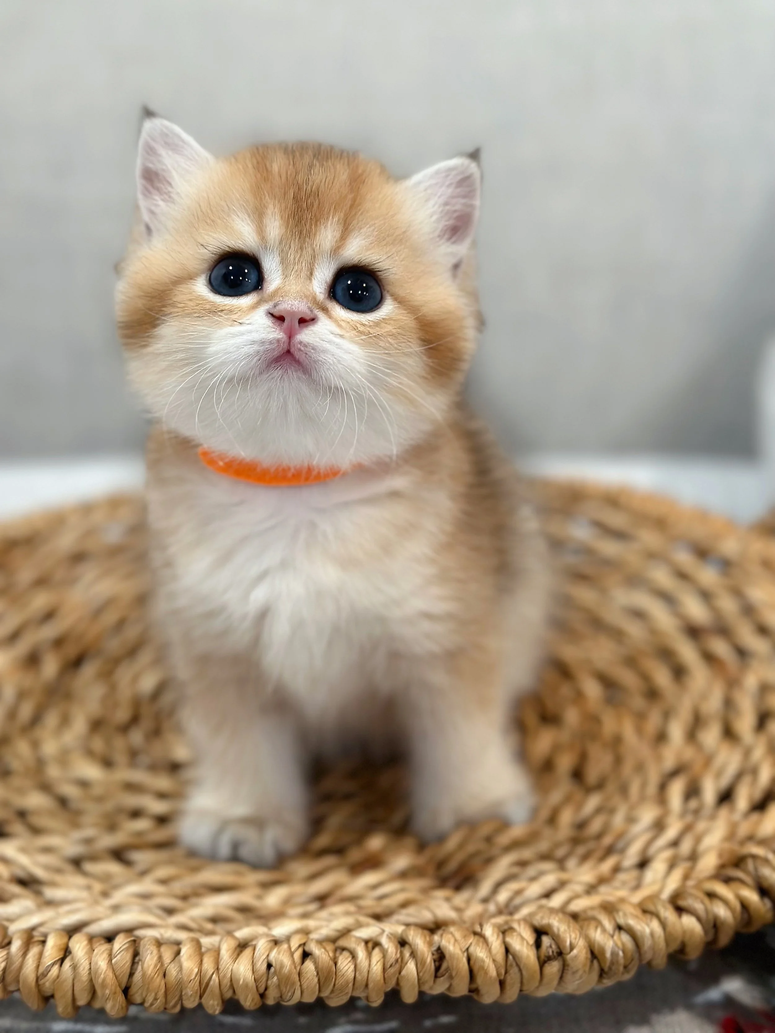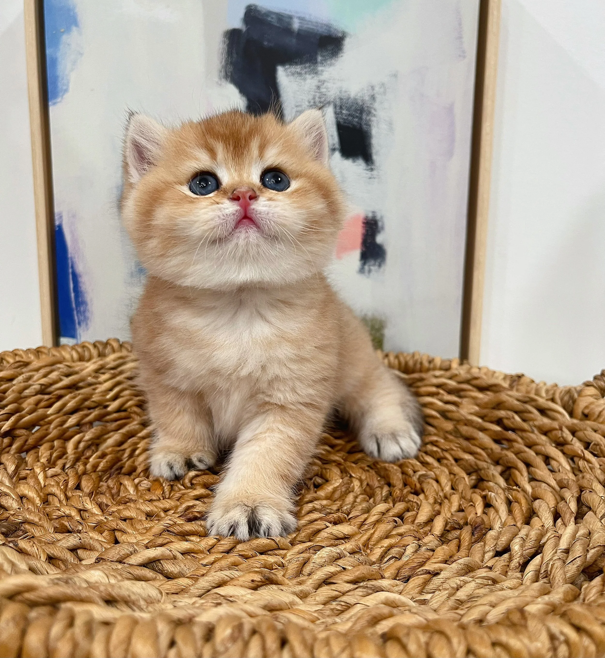 Baby girl E4 is a British Short Hair kitten with color code NY12. She has bright golden shaded hair color and a pair of big, bright eyes that make her look absolutely stunning. She has such a charming personality that she would climb on us and give us massages.